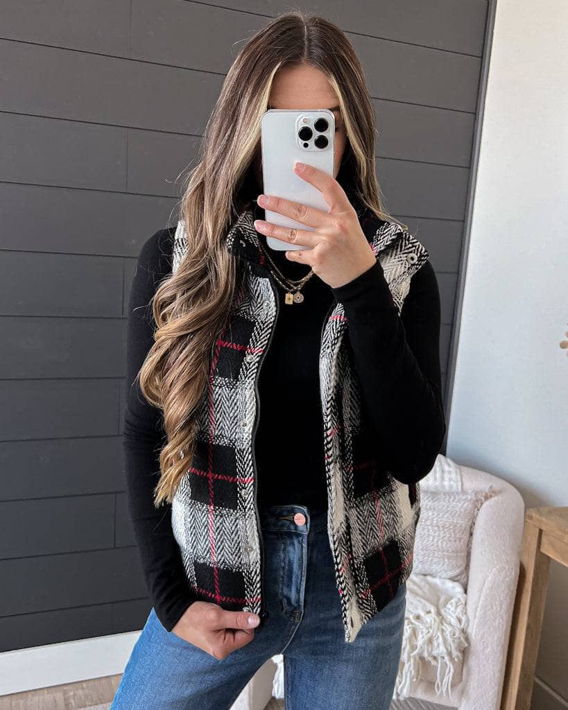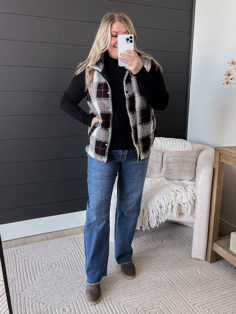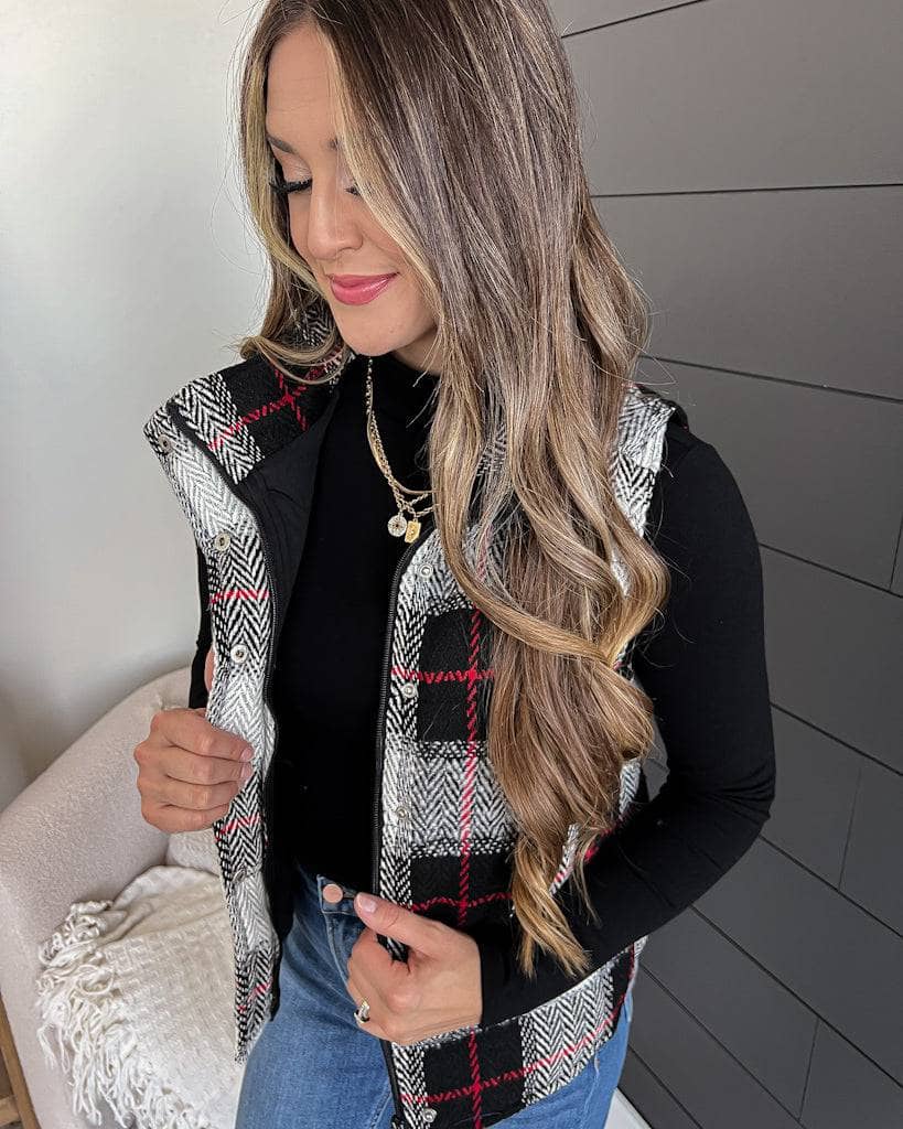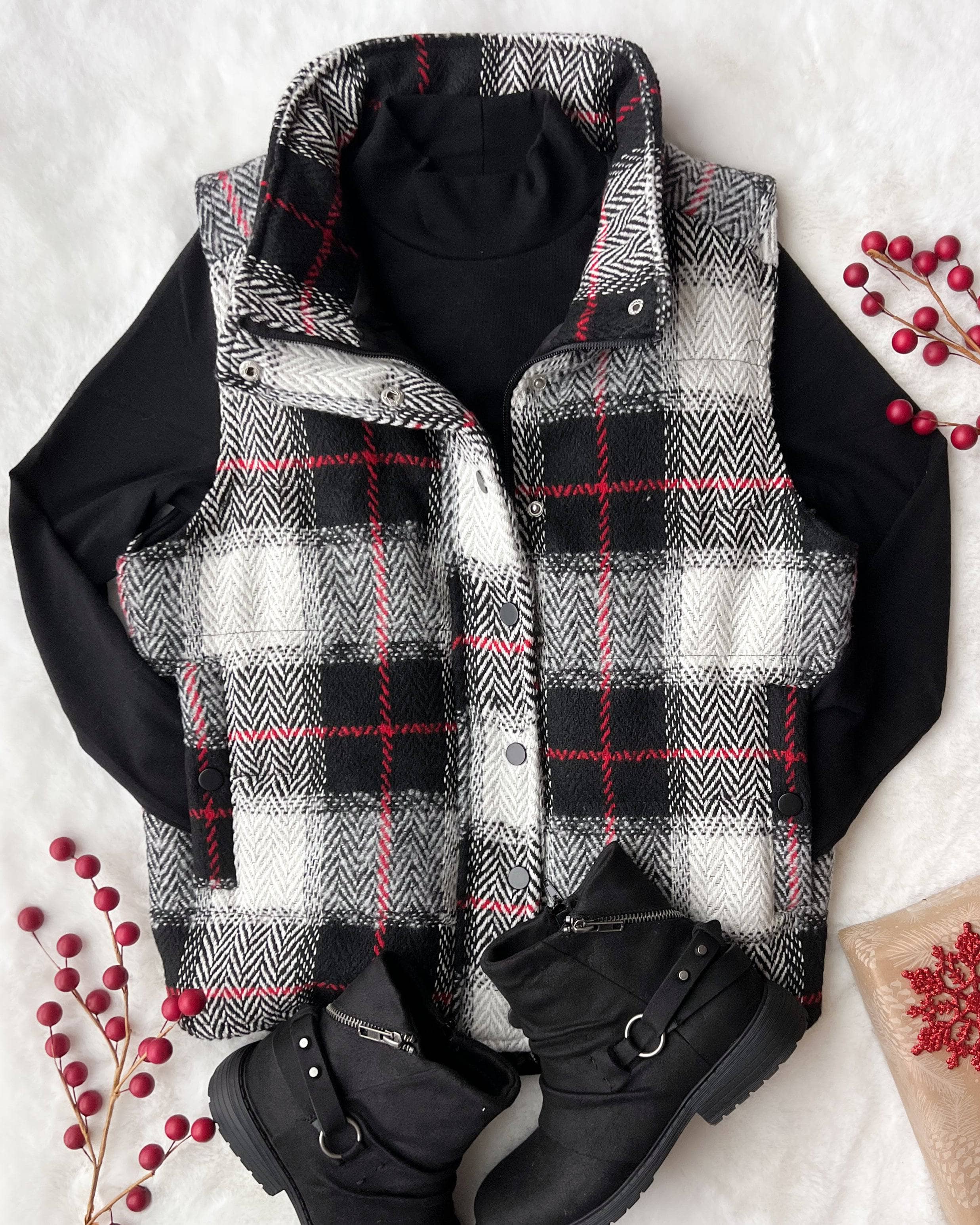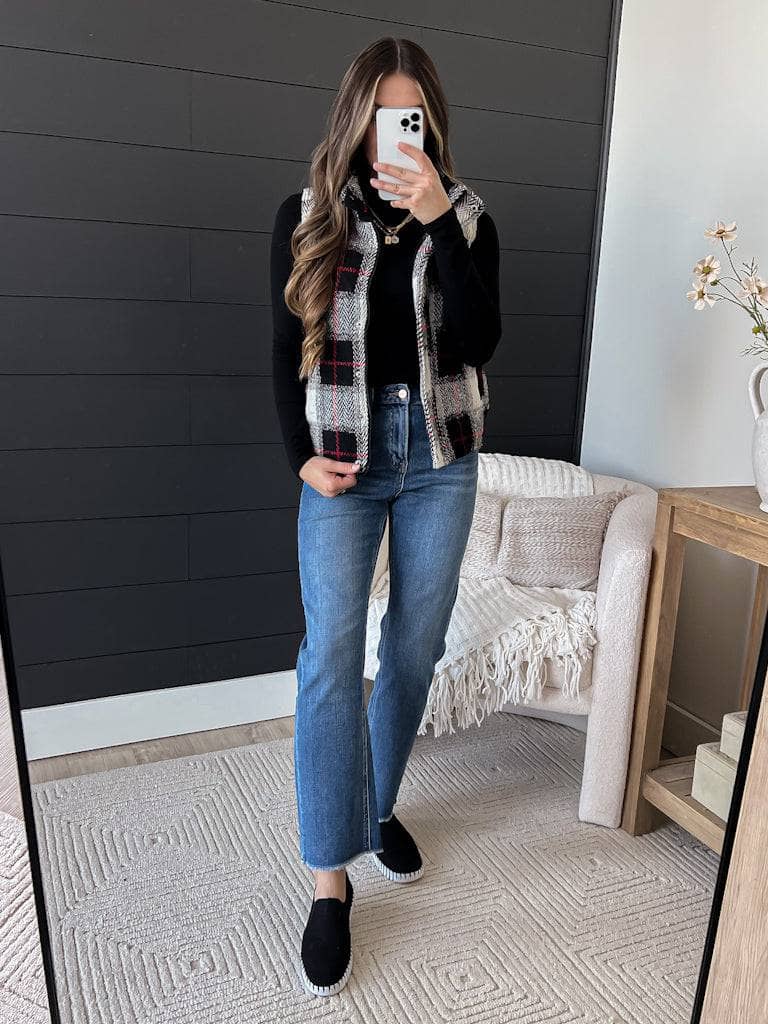 This adorable plaid vest is the perfect mix of winter colors for the holidays. Pair with this black turtleneck for days on the go or days at work.