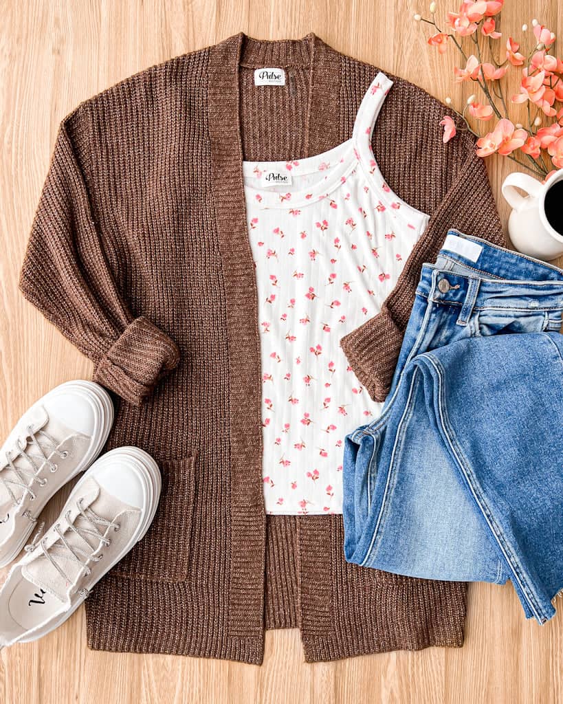 This adorable floral print tank top pairs so well with our best-selling brown knit cardigan! Style with jeans and sneakers for a cute and casual outfit.