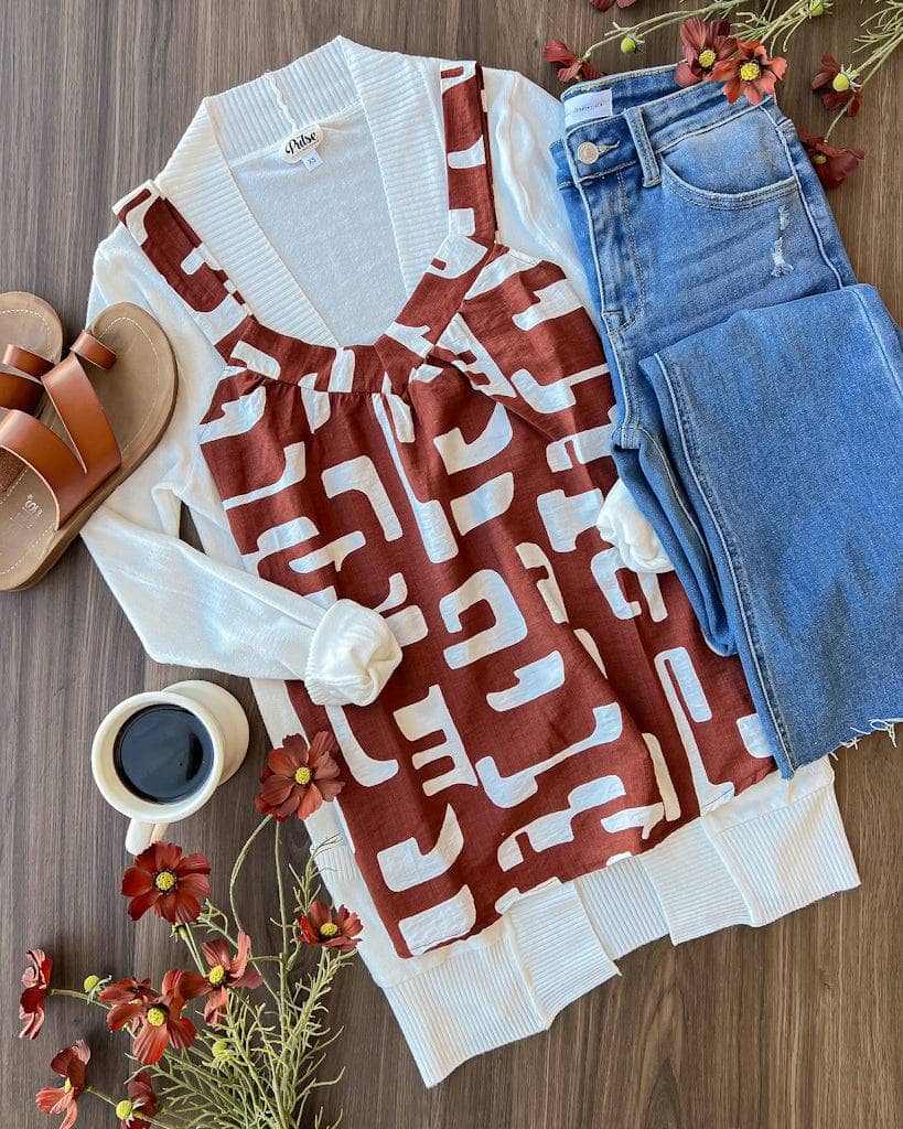 This gorgeous geometric print brown tank top is such a great Fall transition piece! Style with our favorite white cardigan and jeans.