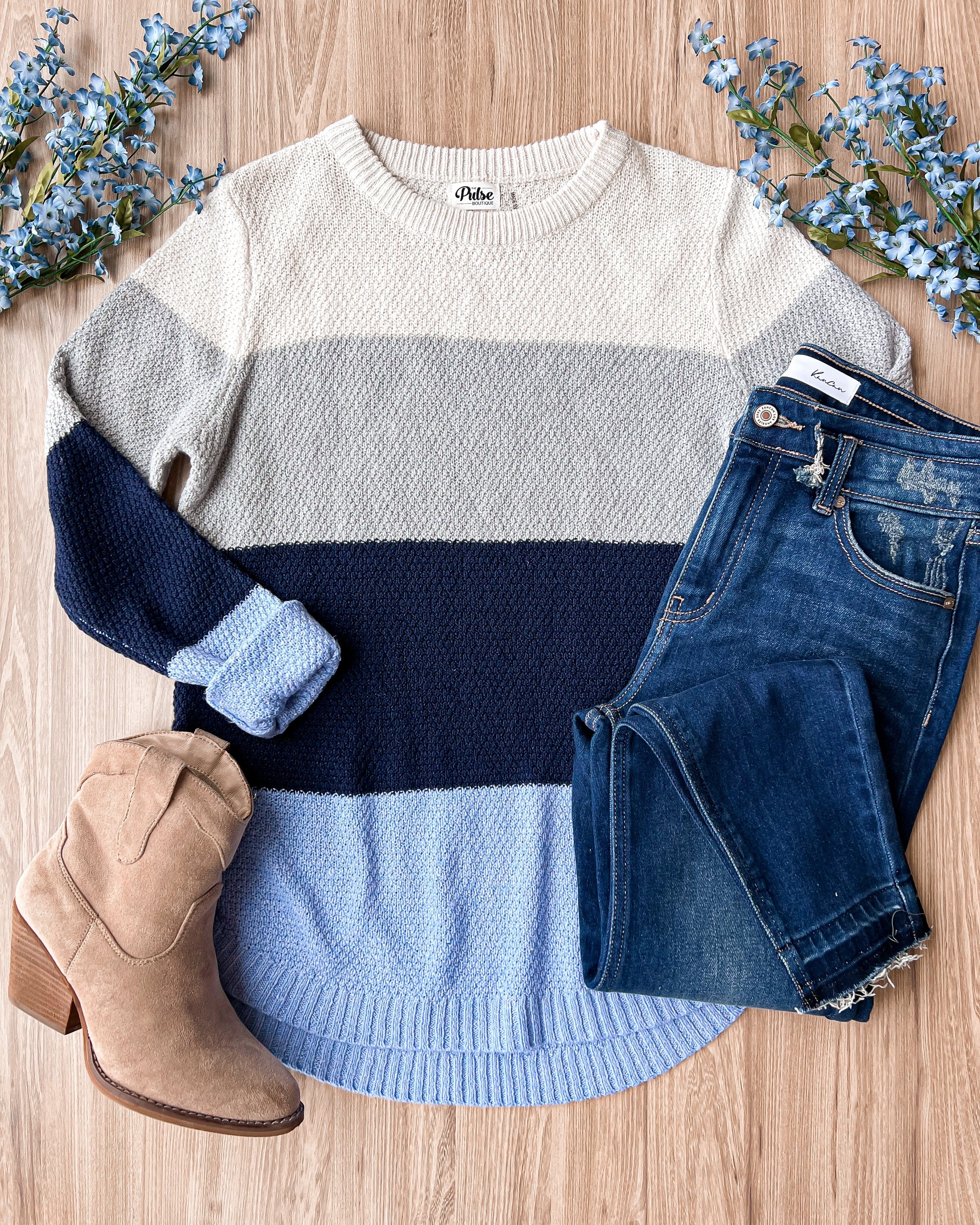 This gorgeous color block sweater is back in stock! Pair with jeans and booties for a comfy and chic Spring transition outfit.