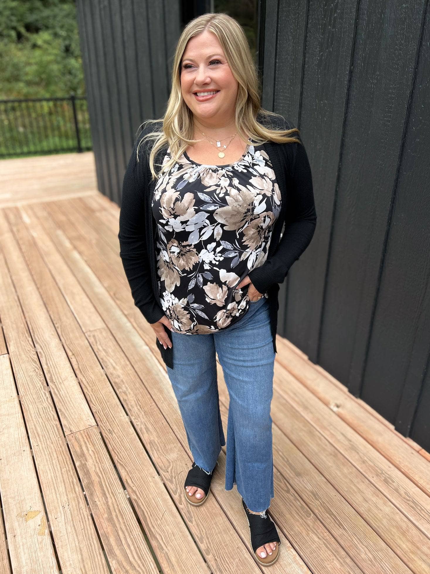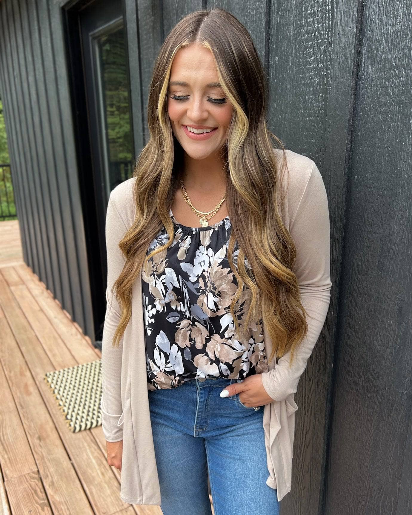 This adorable floral print tank top is the perfect mix of neutral colors to pair with this black or light mocha cardigan! Style for days on the go or days at work.