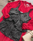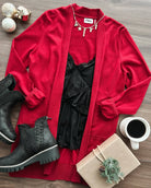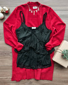 This cardigan is bold and perfect for the holidays! Style with this velvet tank top, jeans and these black boots.