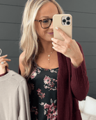 This cute and comfy floral print tank top is the perfect layering piece to pair with our neutral cardigans! Style with jeans and booties.