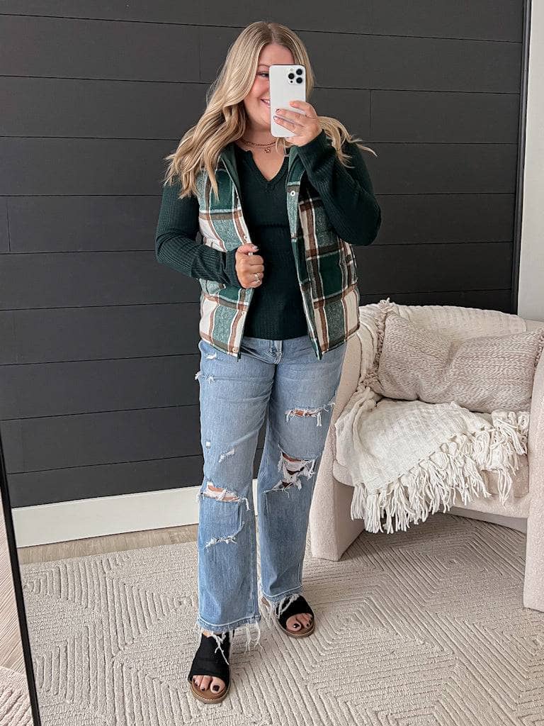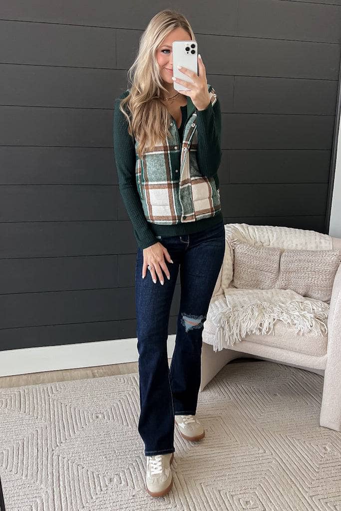 This plaid puffer vest is a must have for Fall! Style with our new long sleeve notch top and a pair of dark wash denim.