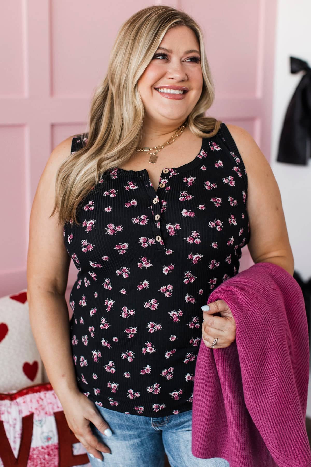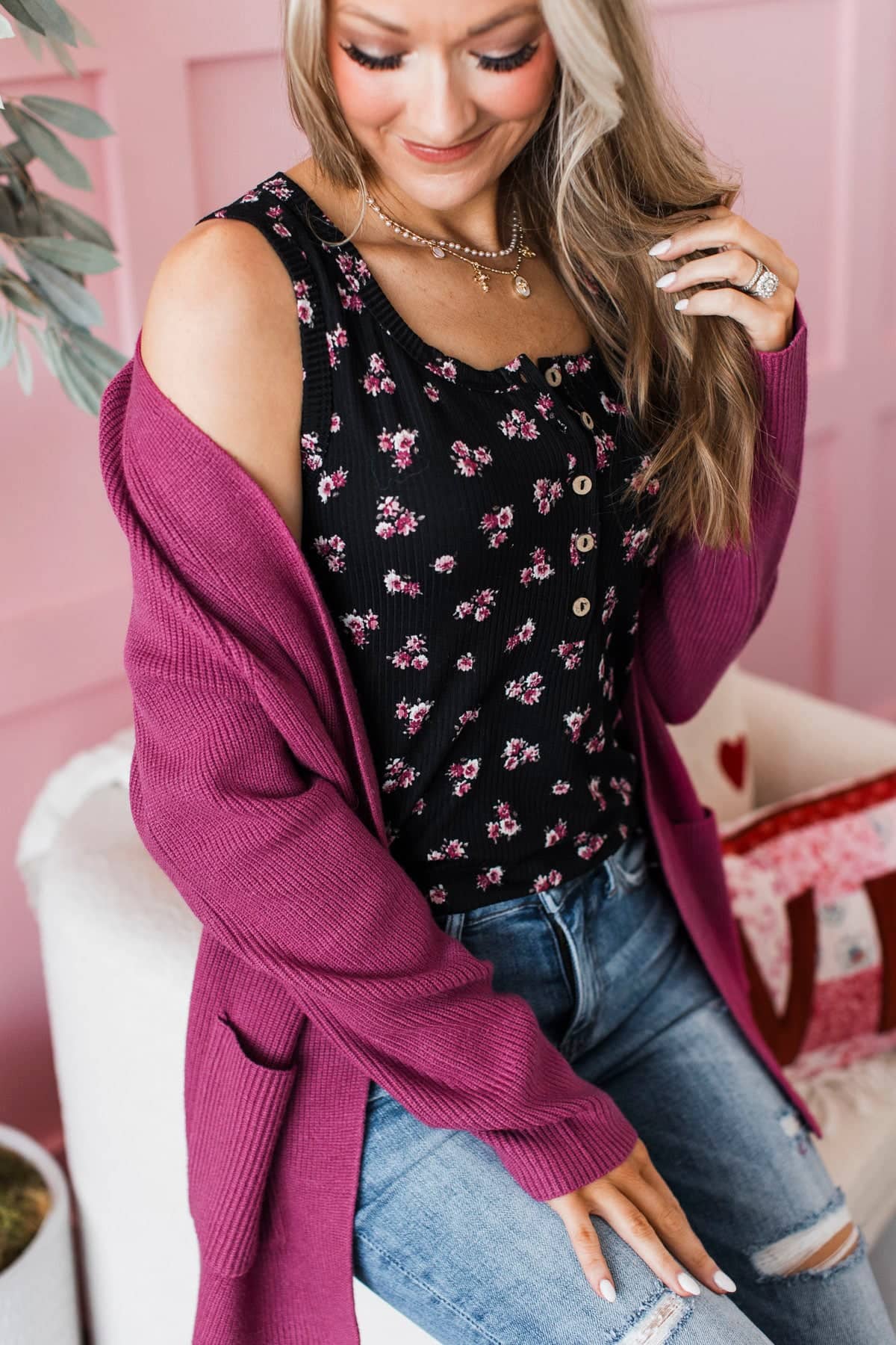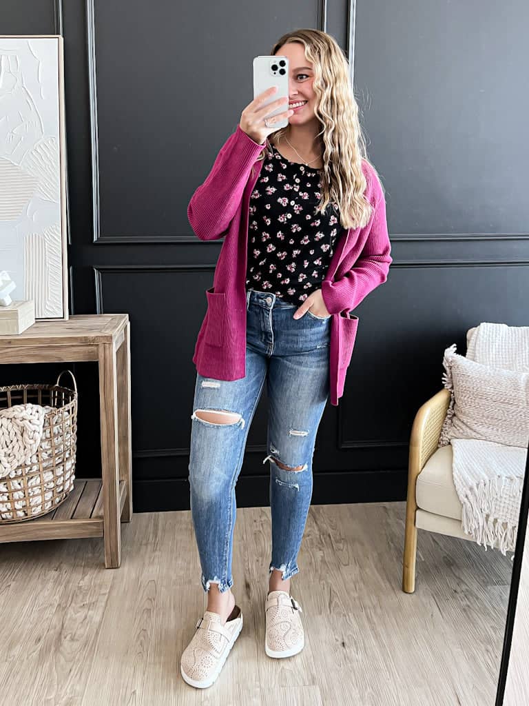 This adorable floral print tank top pairs so well with our new berry cardigan! Style with jeans and mules for a cute and casual outfit.