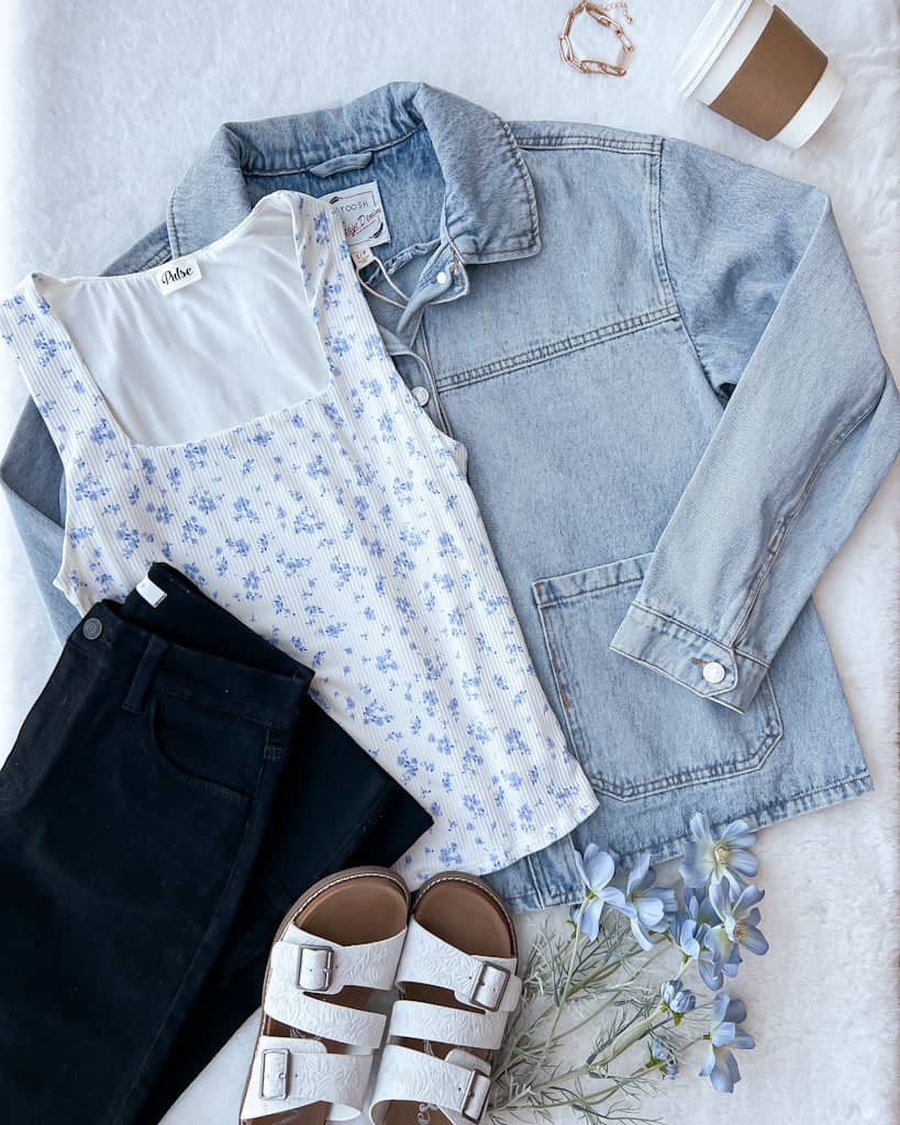 This adorable floral print tank top is perfect to style with our new light wash denim jacket! Pair with black jeans and sneakers or sandals for cute Spring outfit.