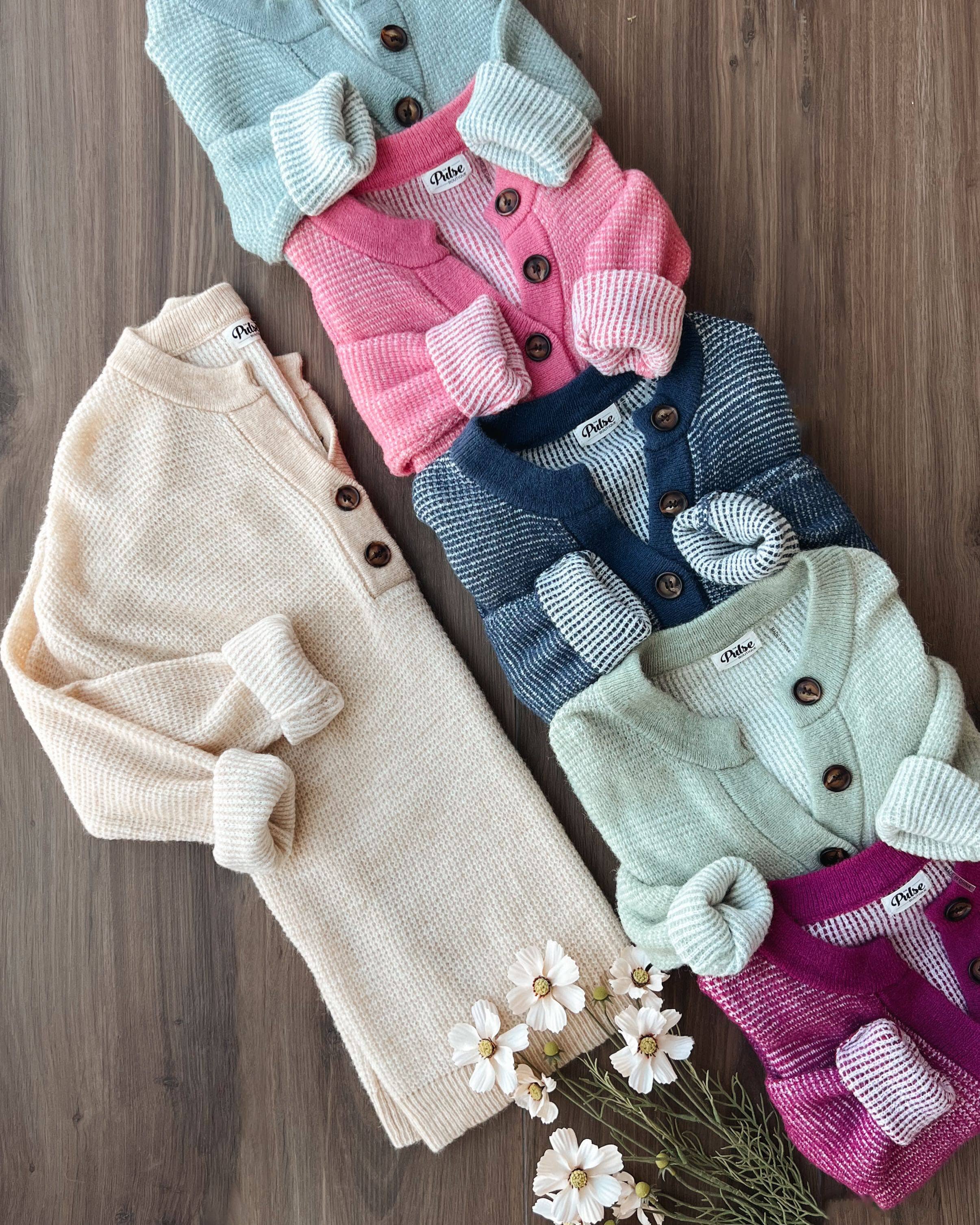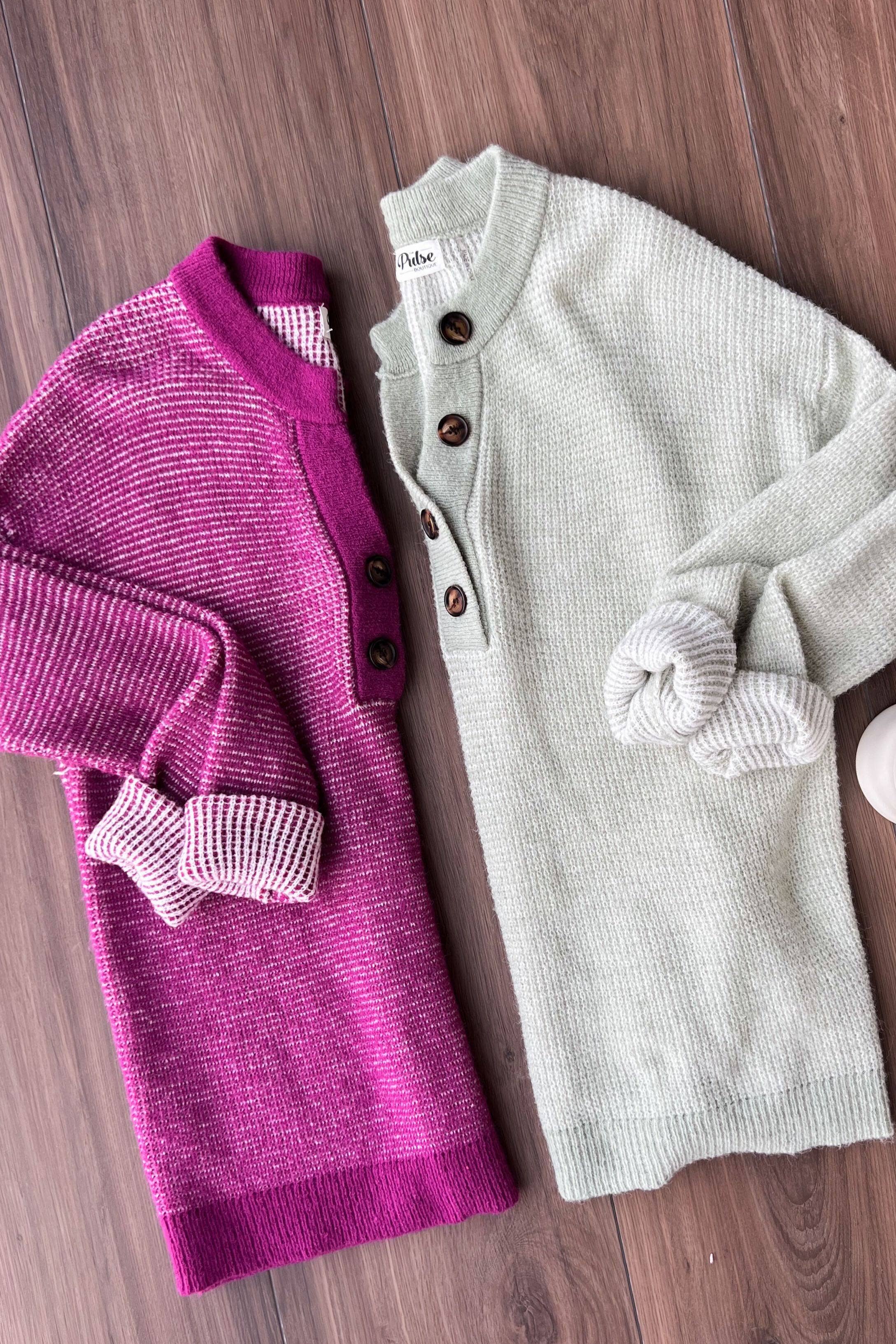 One of our best selling sweaters is available in so many colors! This knit sweater features a button detail on the necklace and is so soft. Style with leggings, shorts or jeans!