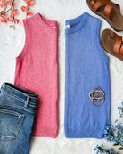 This stunning periwinkle sleeveless top is the perfect top for transitioning into the Spring! Style with skinny jeans and a cardigan.