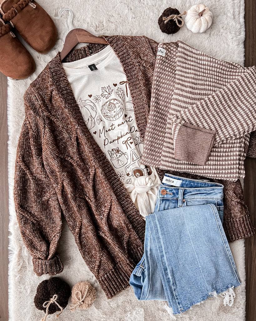 This adorable graphic tee is perfect to style with either of these cozy brown cardigans! Pair with light wash jeans and booties.