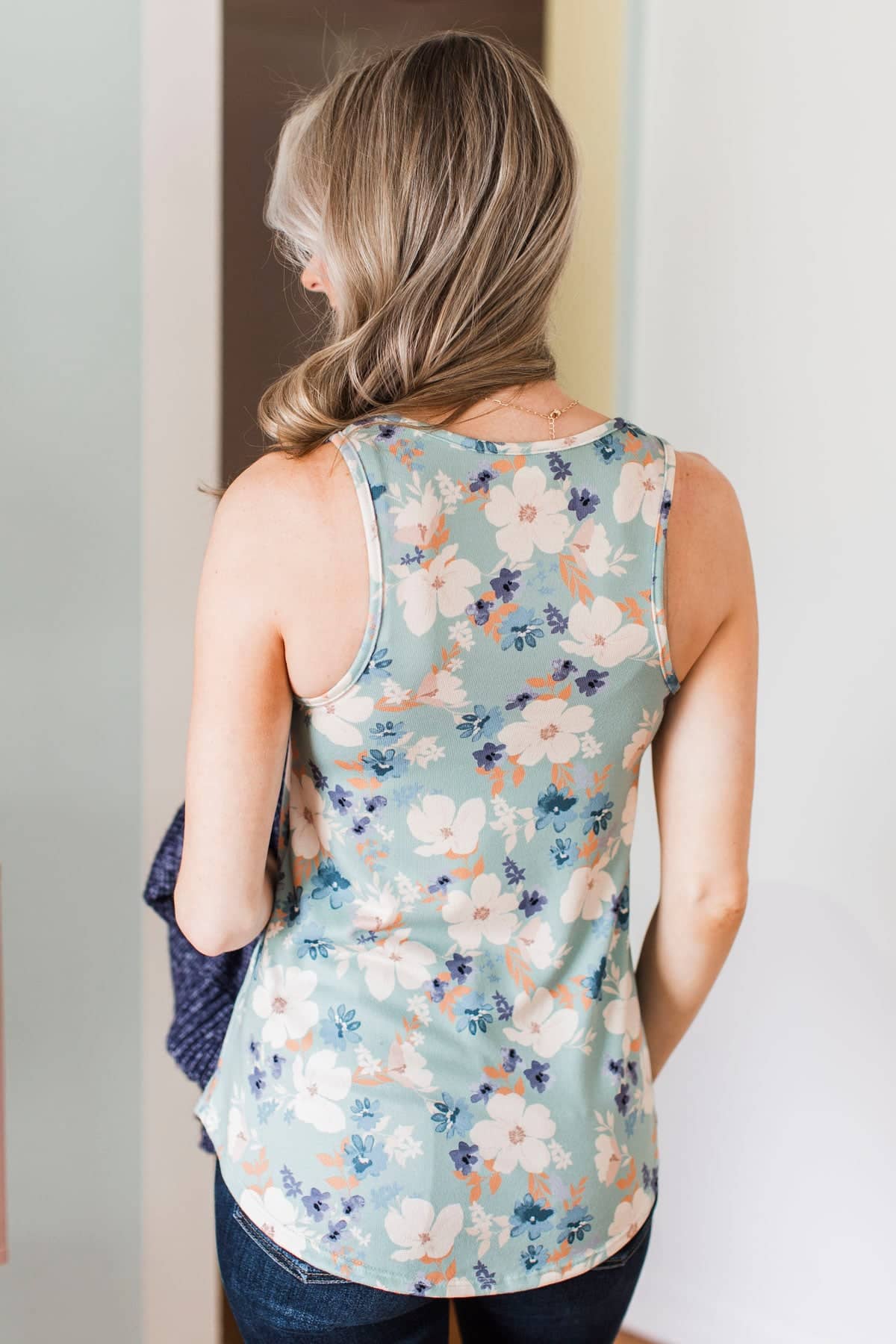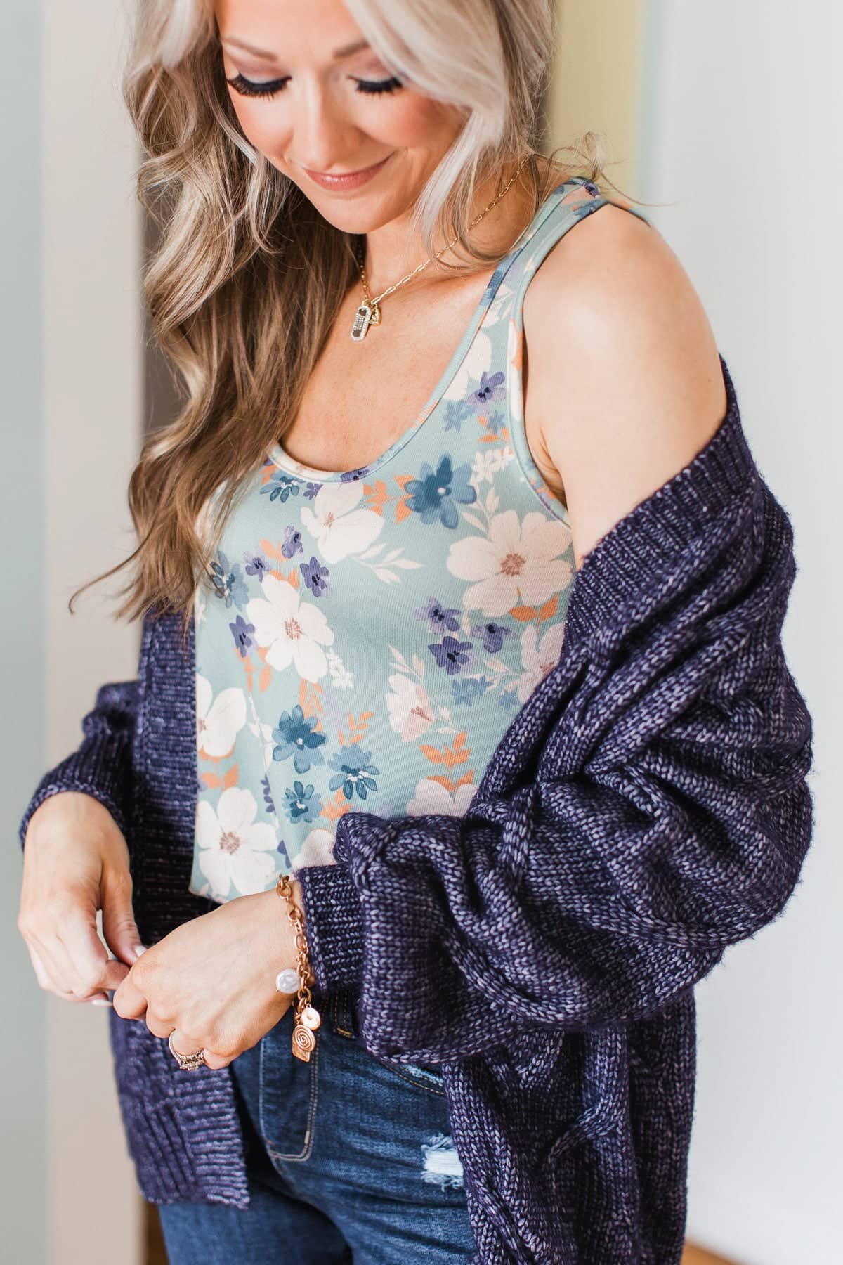 This floral tank top is such a great transition piece for Spring! Style with jeans, mules and this denim colored cardigan.
