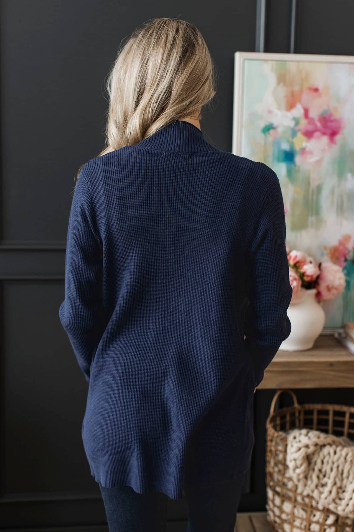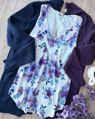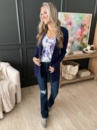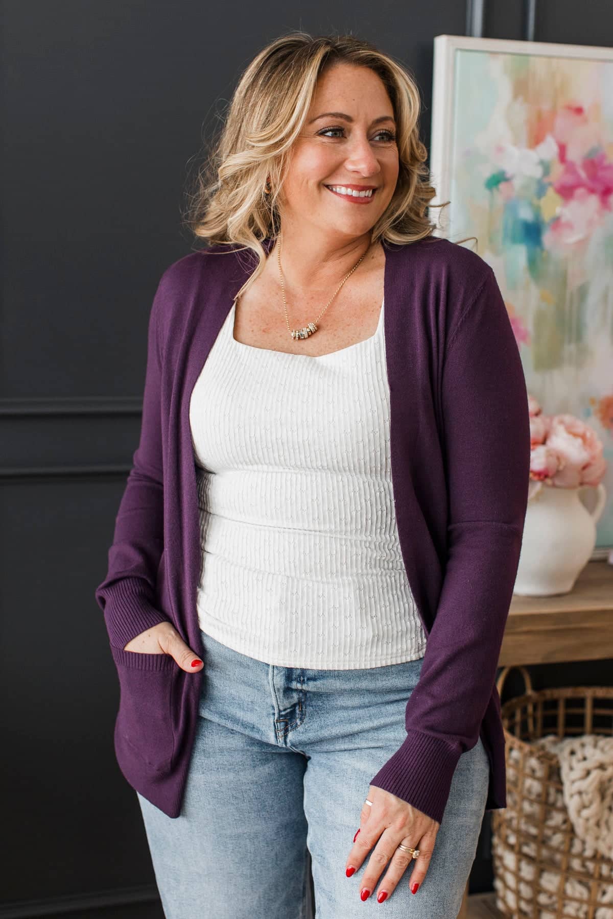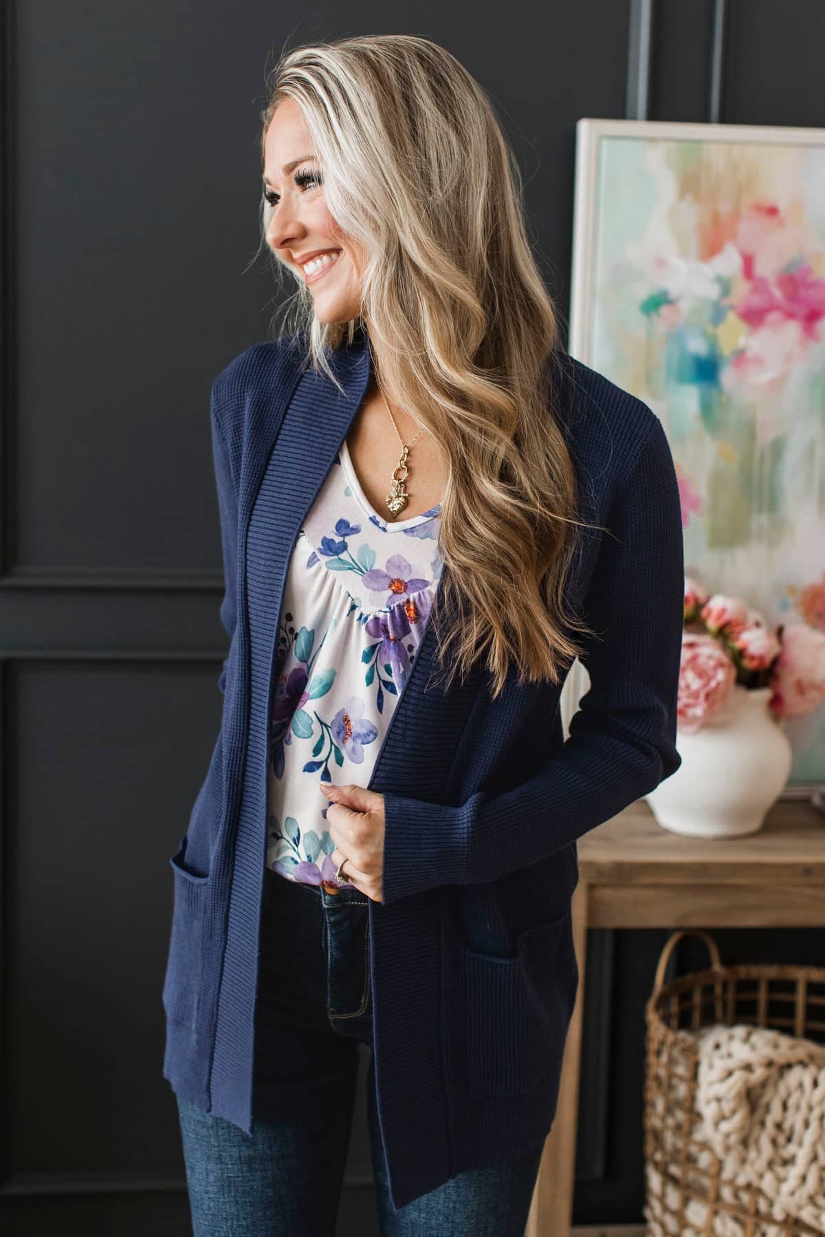 This stunning navy and eggplant colored cardigan pair so well with our new floral print tank top! Mix and match all Winter long. This outfit is work-friendly and so colorful!