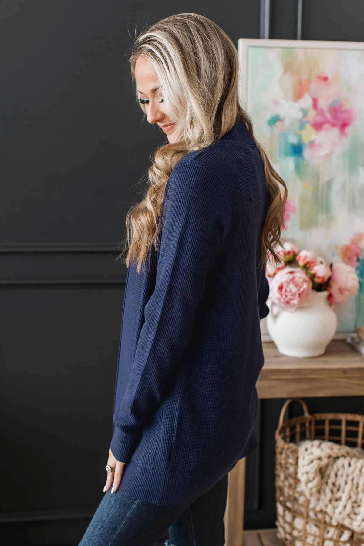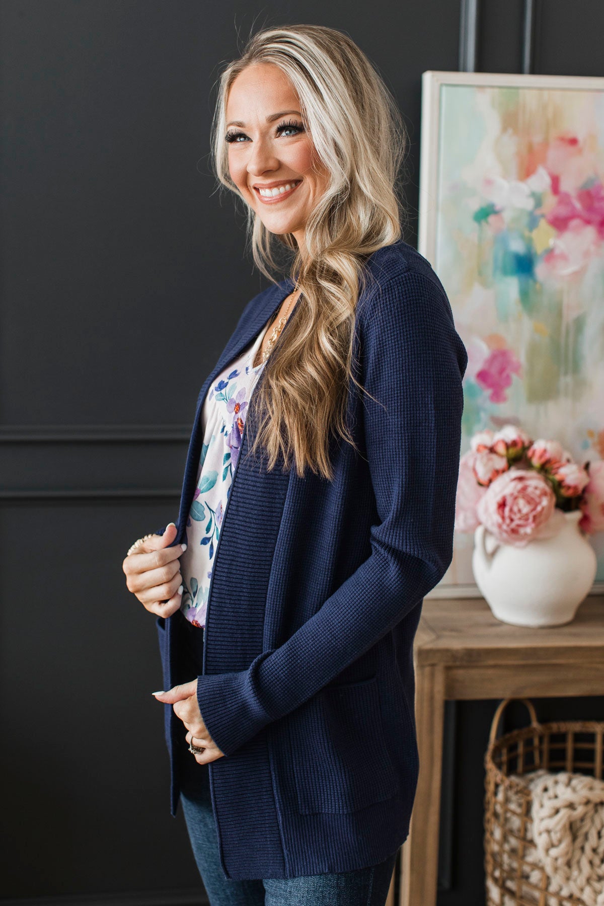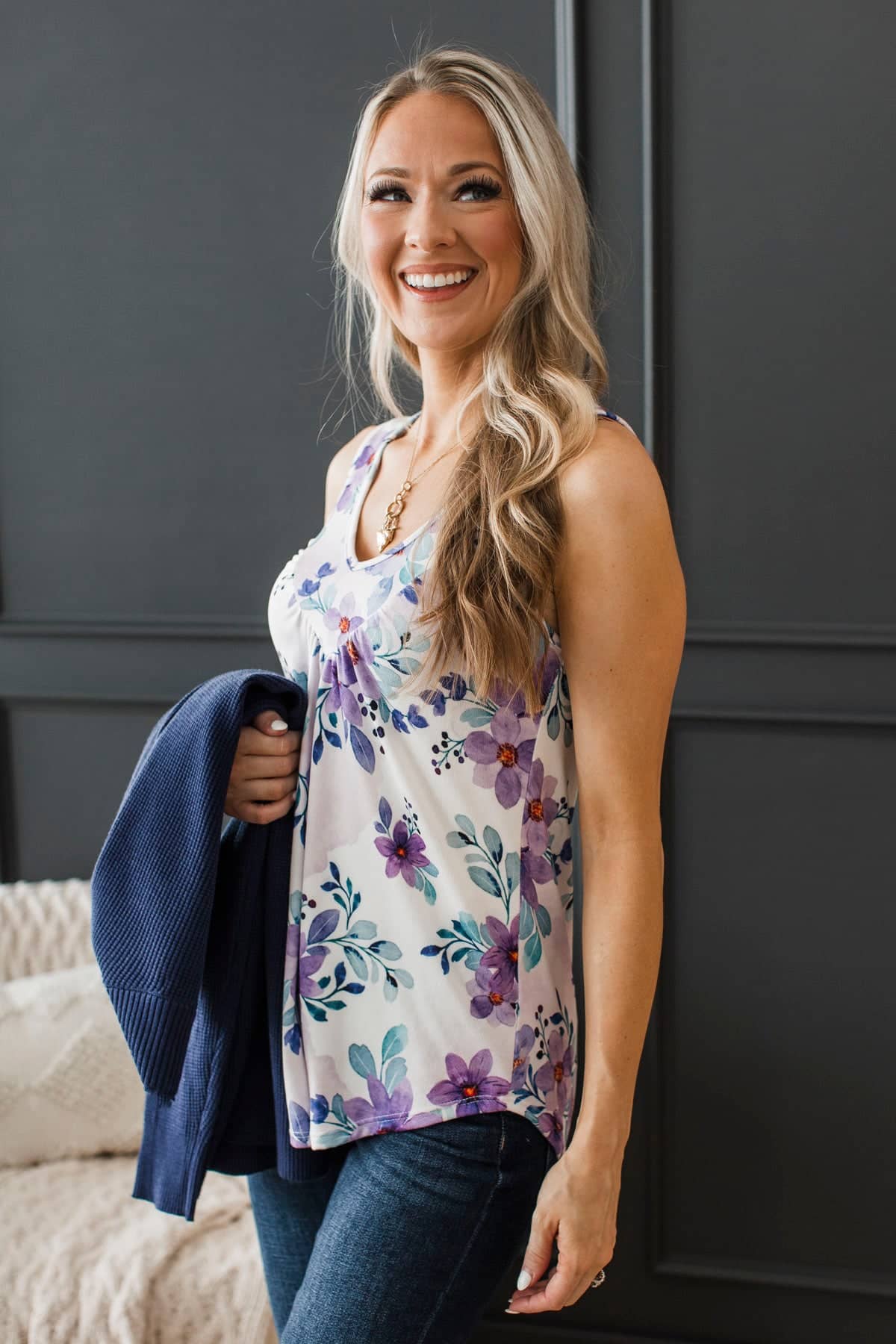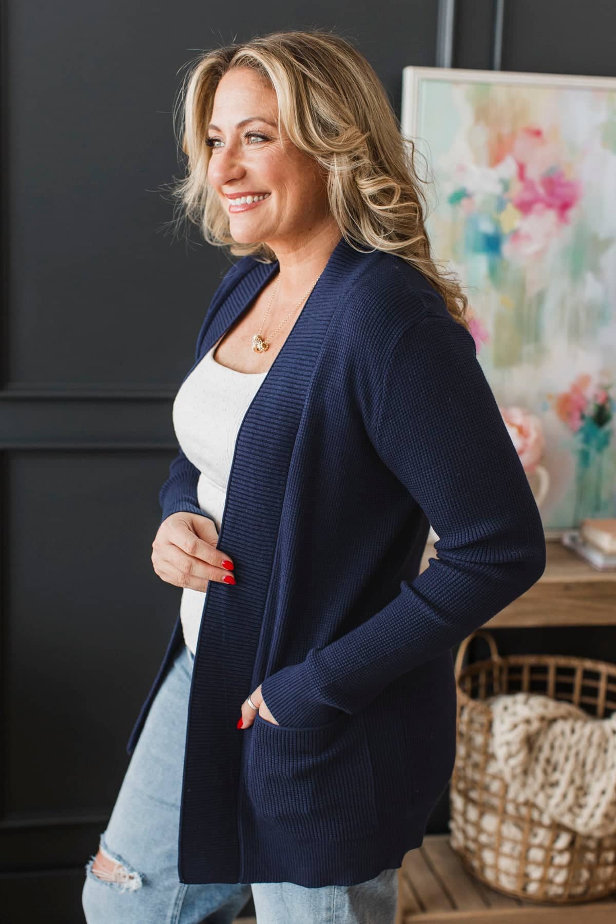 This stunning navy and eggplant colored cardigan pair so well with our new floral print tank top! Mix and match all Winter long. This outfit is work-friendly and so colorful!