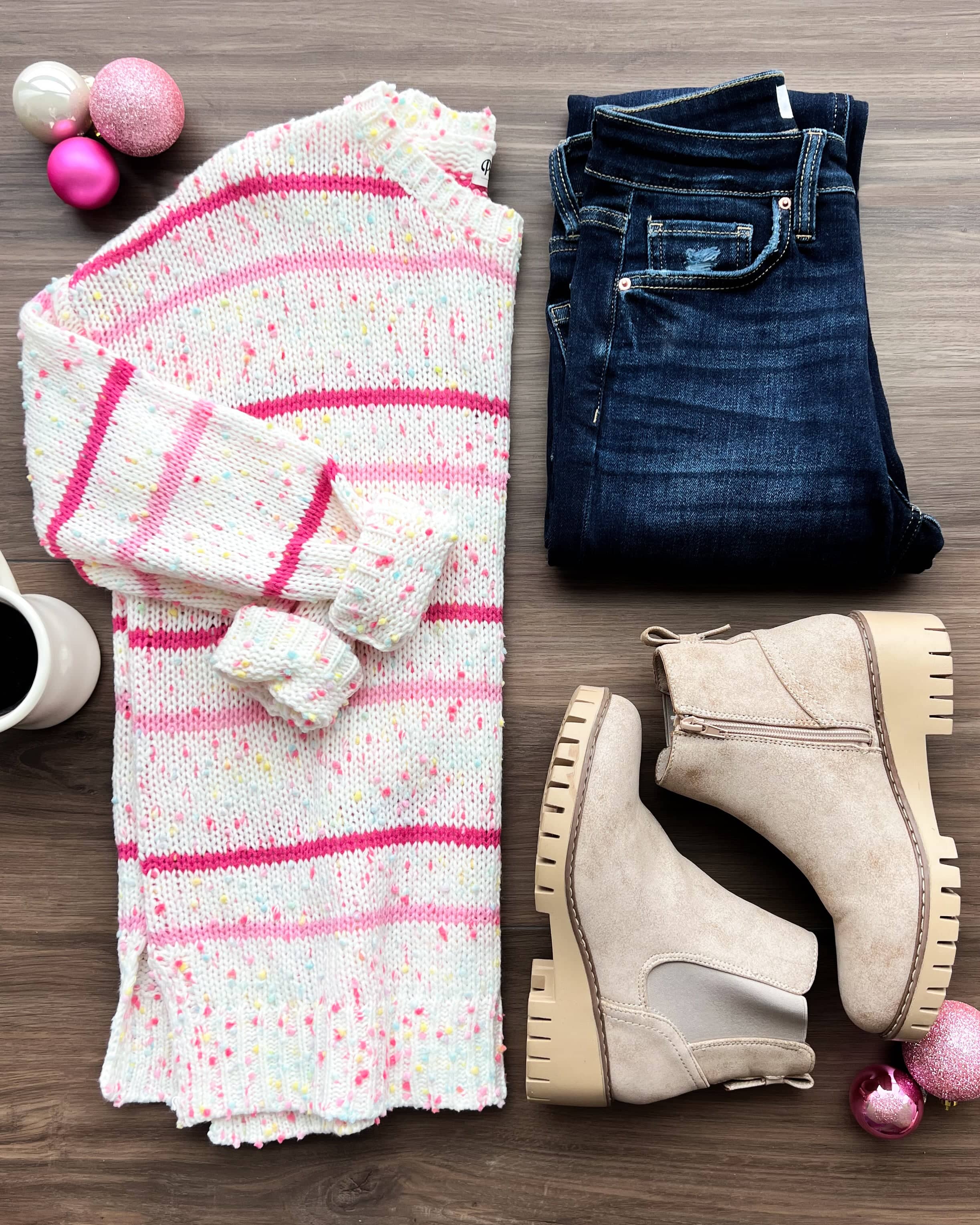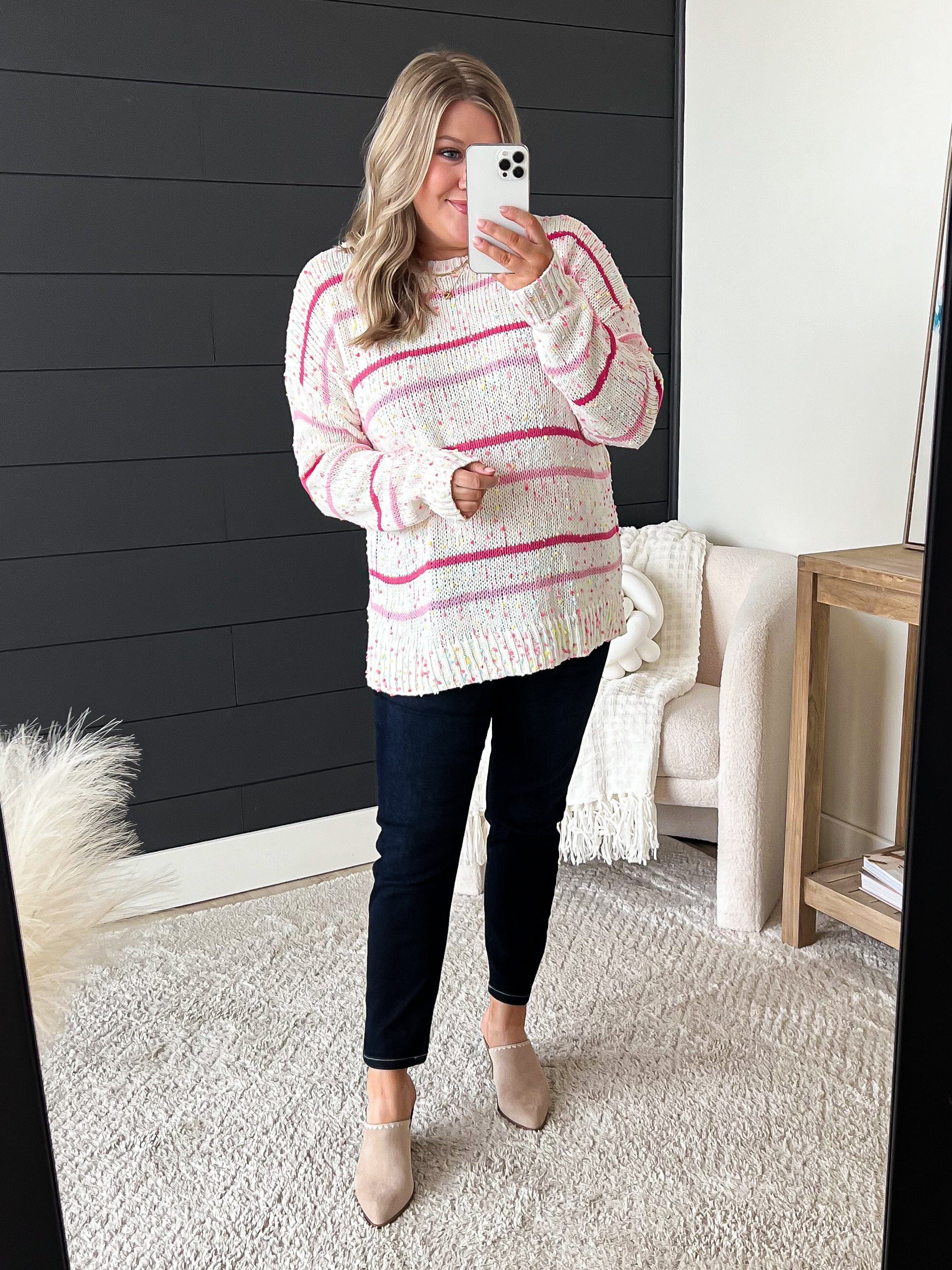 This gorgeous confetti knit sweater is perfect for the holidays! Style with dark wash jeans and booties for a comfy and chic outfit.
