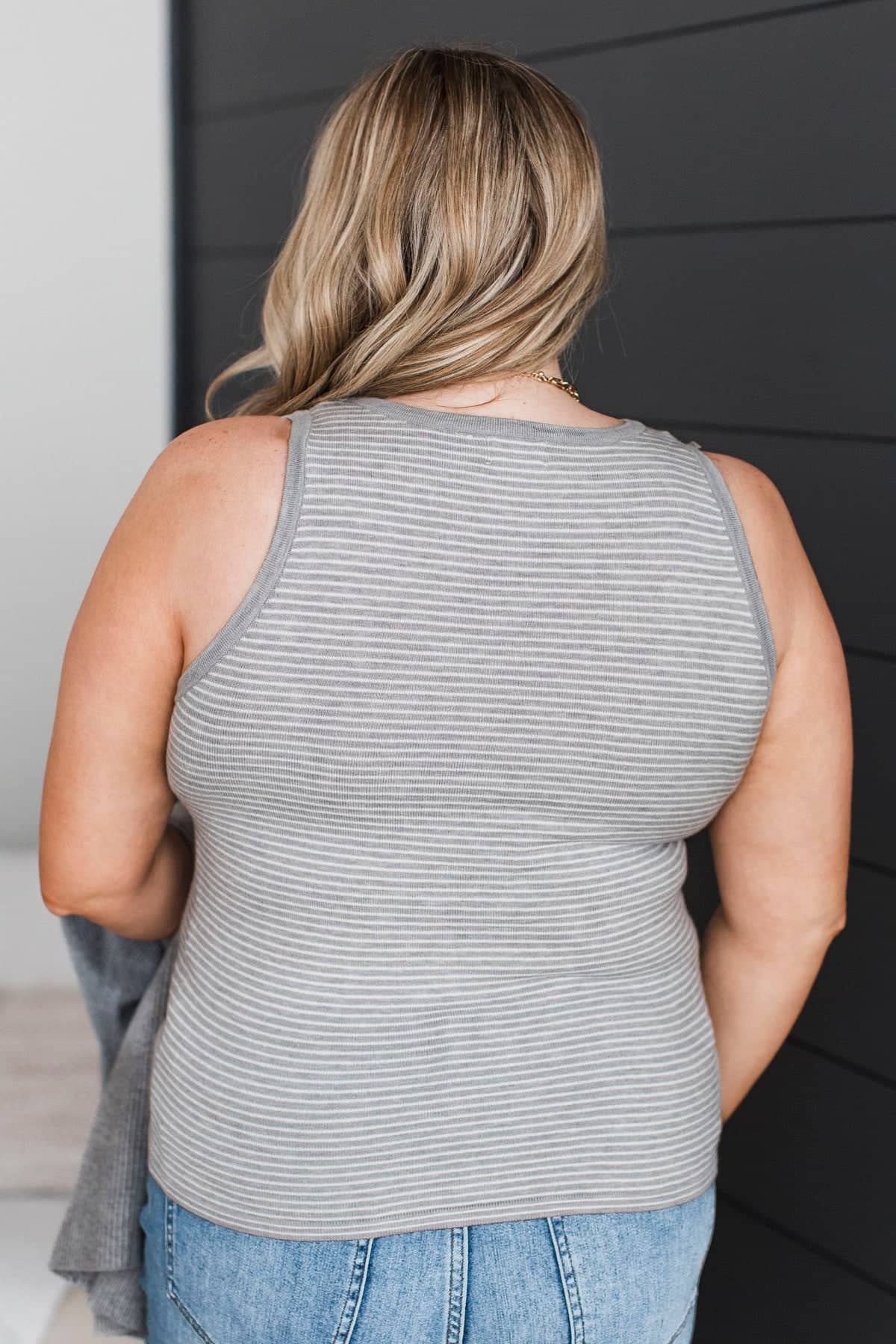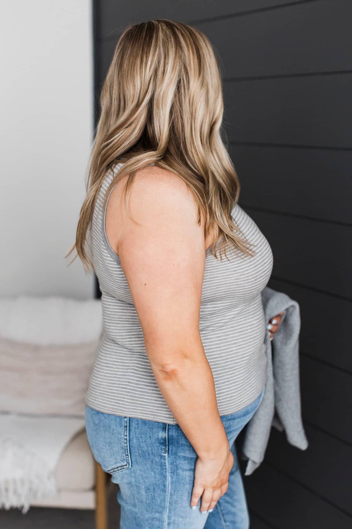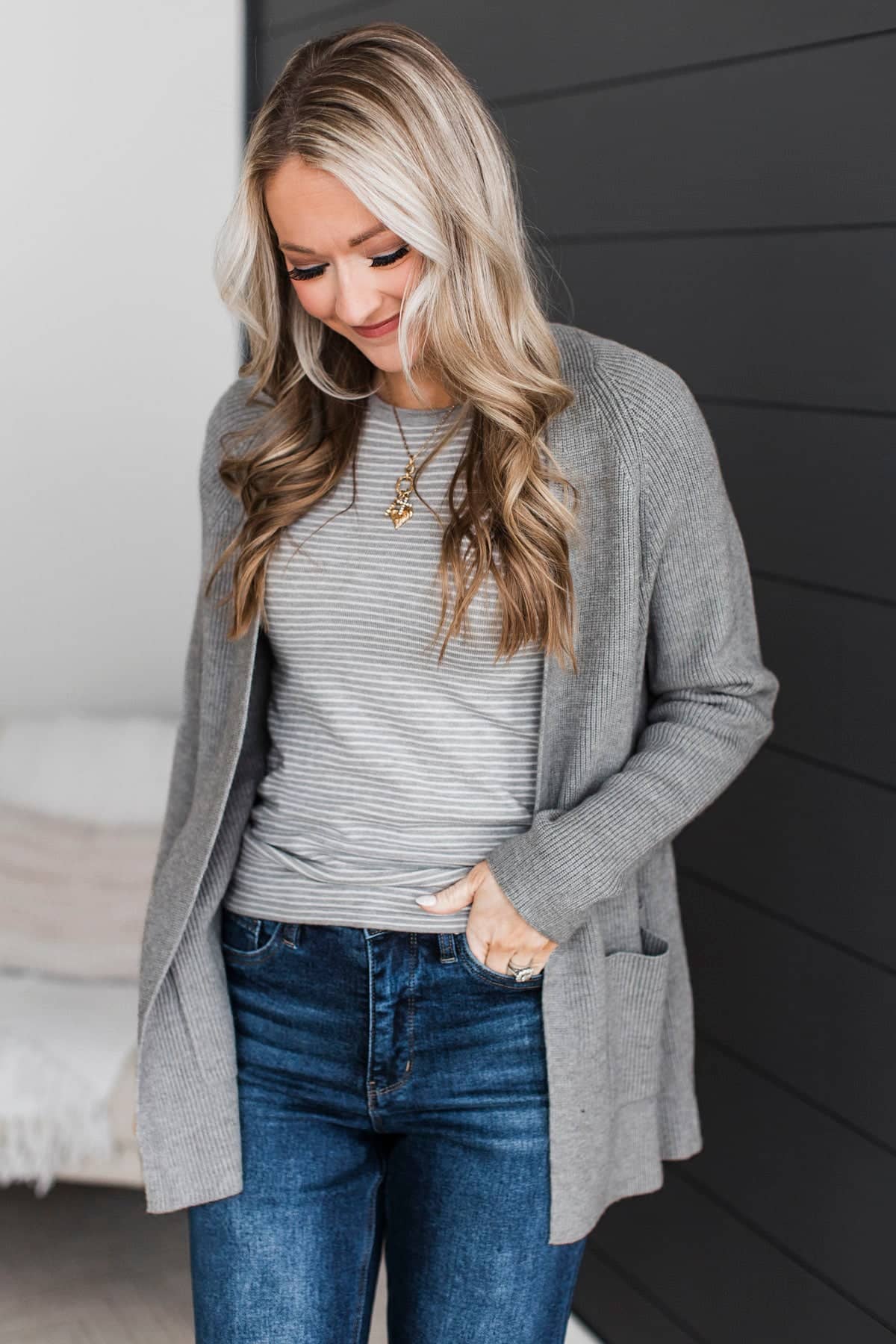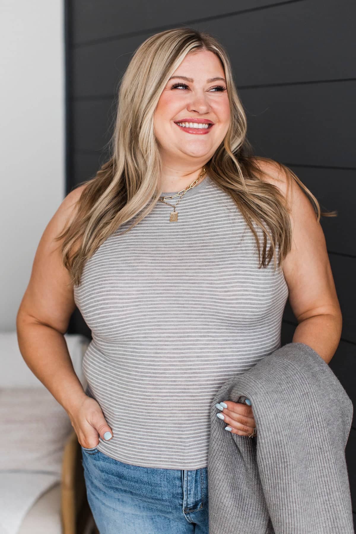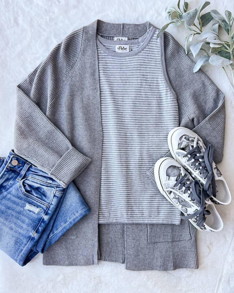 If you love neutral colors, this outfit is for you! Pair our new striped tank top with our grey cardigan for the cutest, comfiest look!