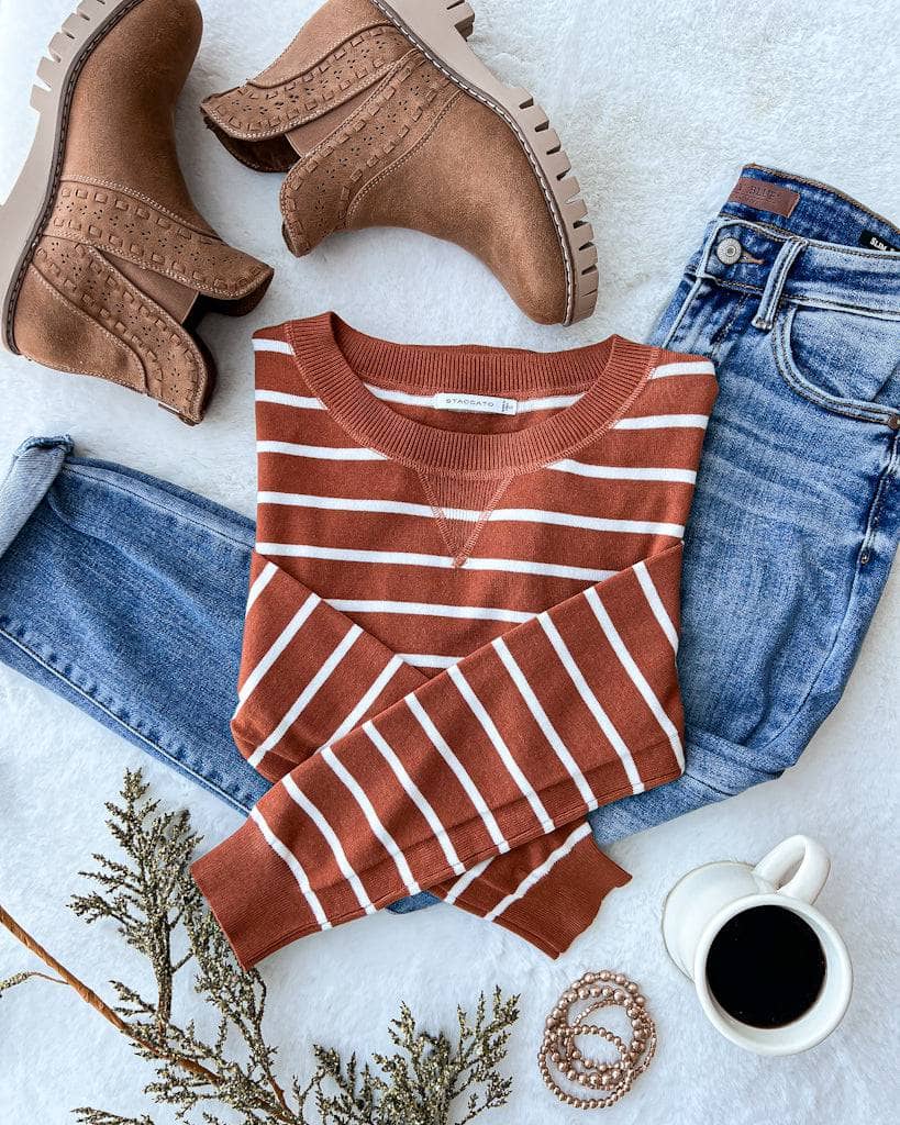 This adorable striped copper sweater is so cozy and chic! Pair with jeans and brown booties for an adorable Fall outfit.