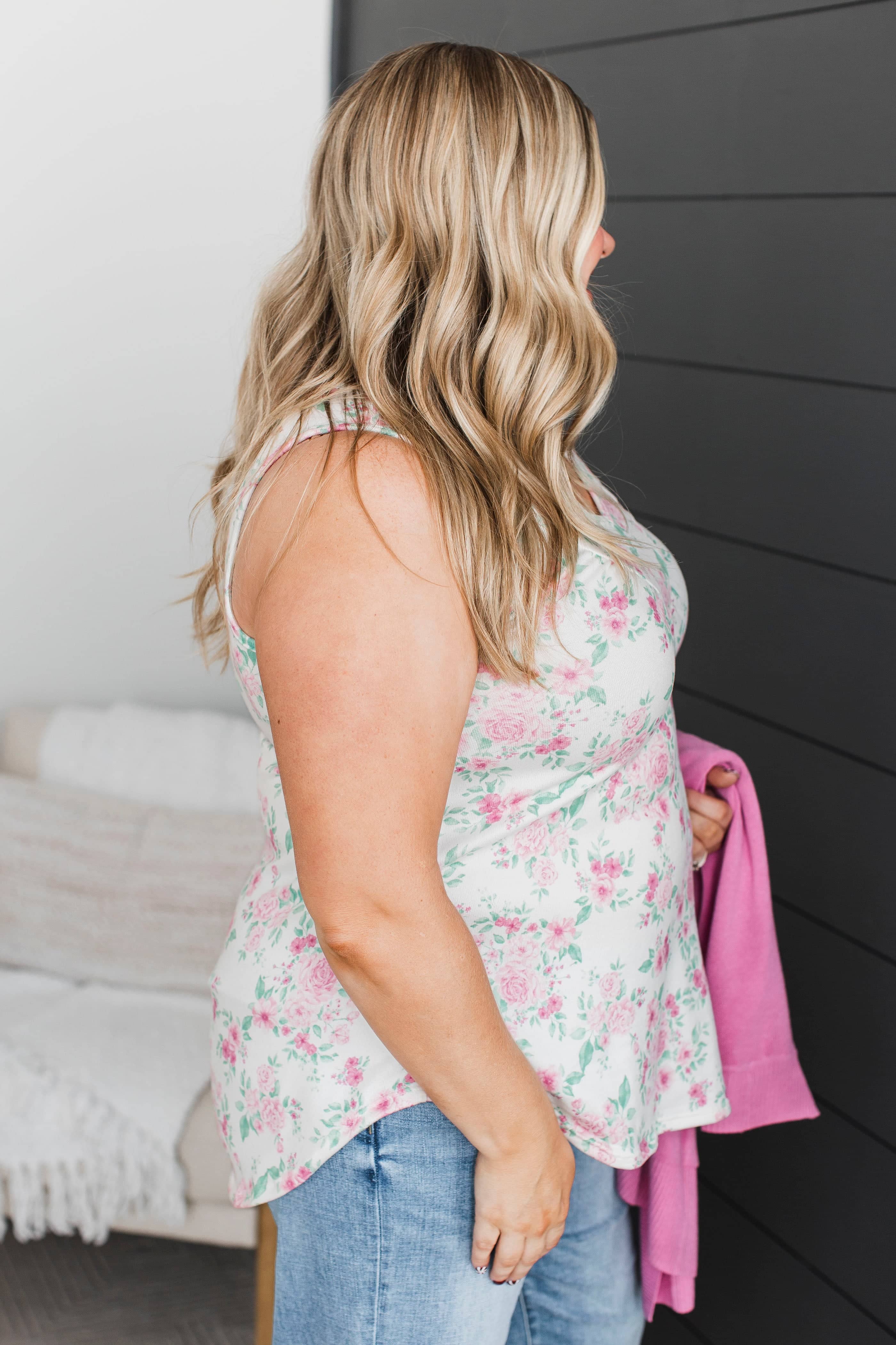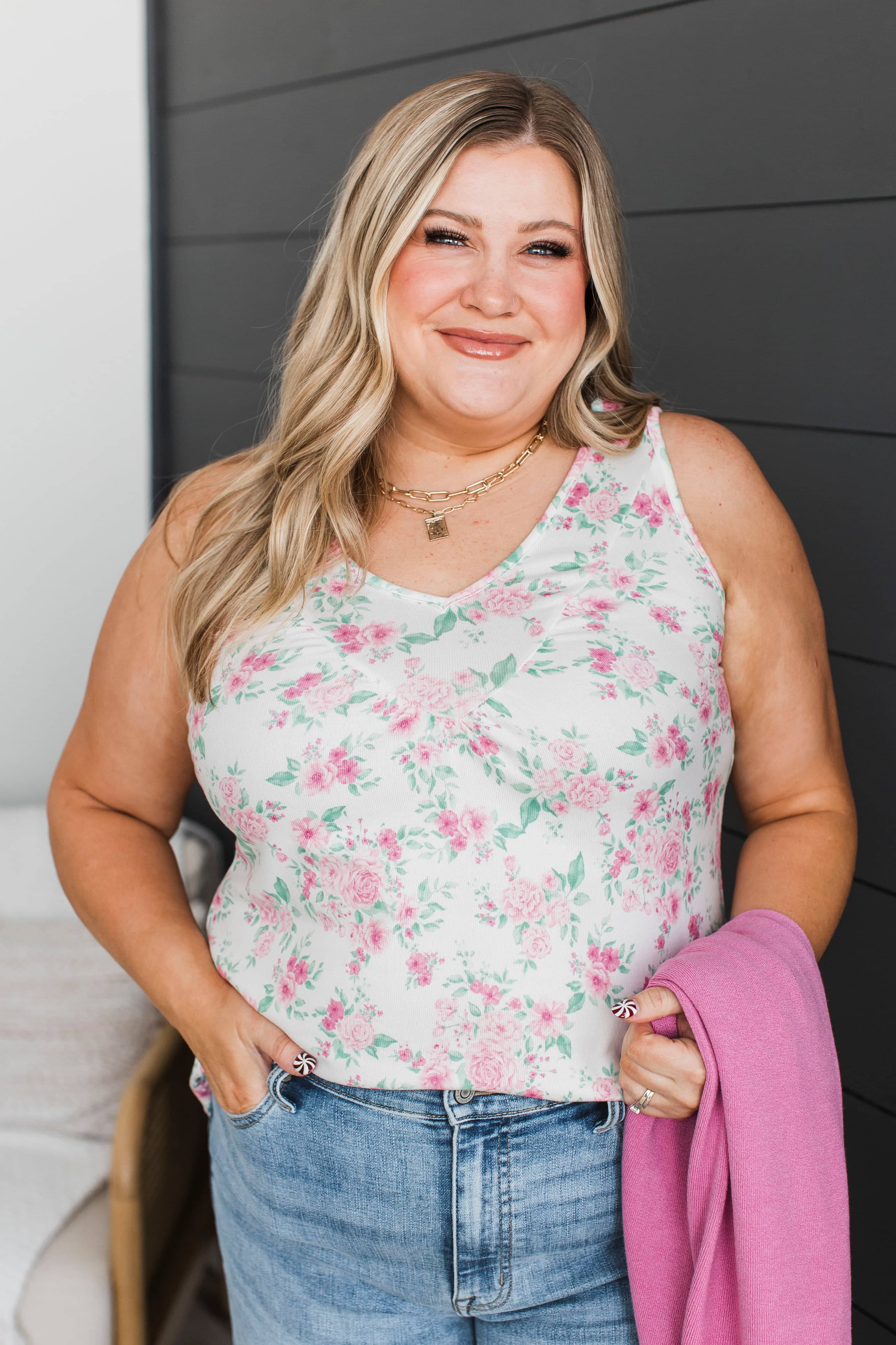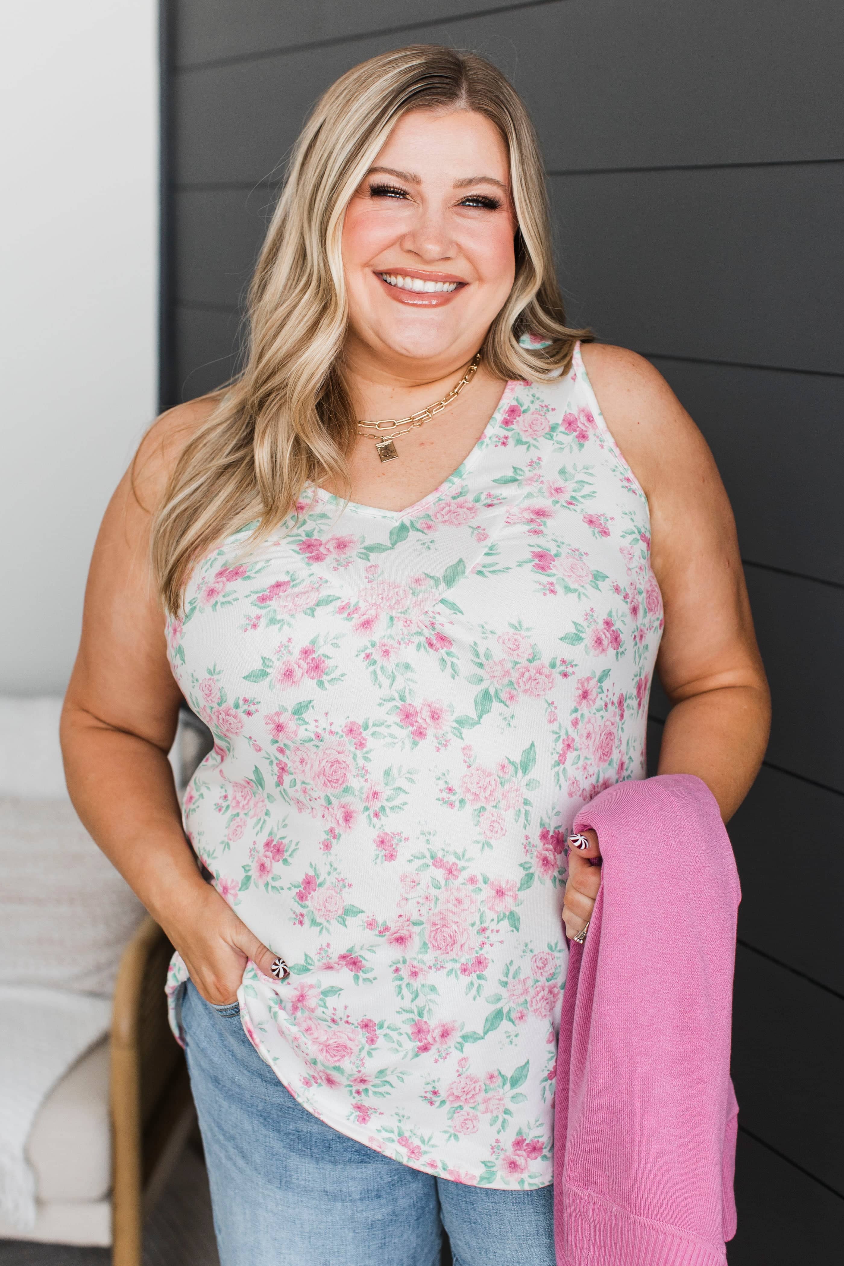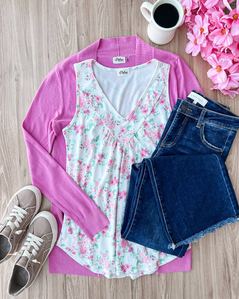 Pair this stunning new floral tank top with our new favorite pink cardigan! Throw on your favorite pair of jeans to complete the look!