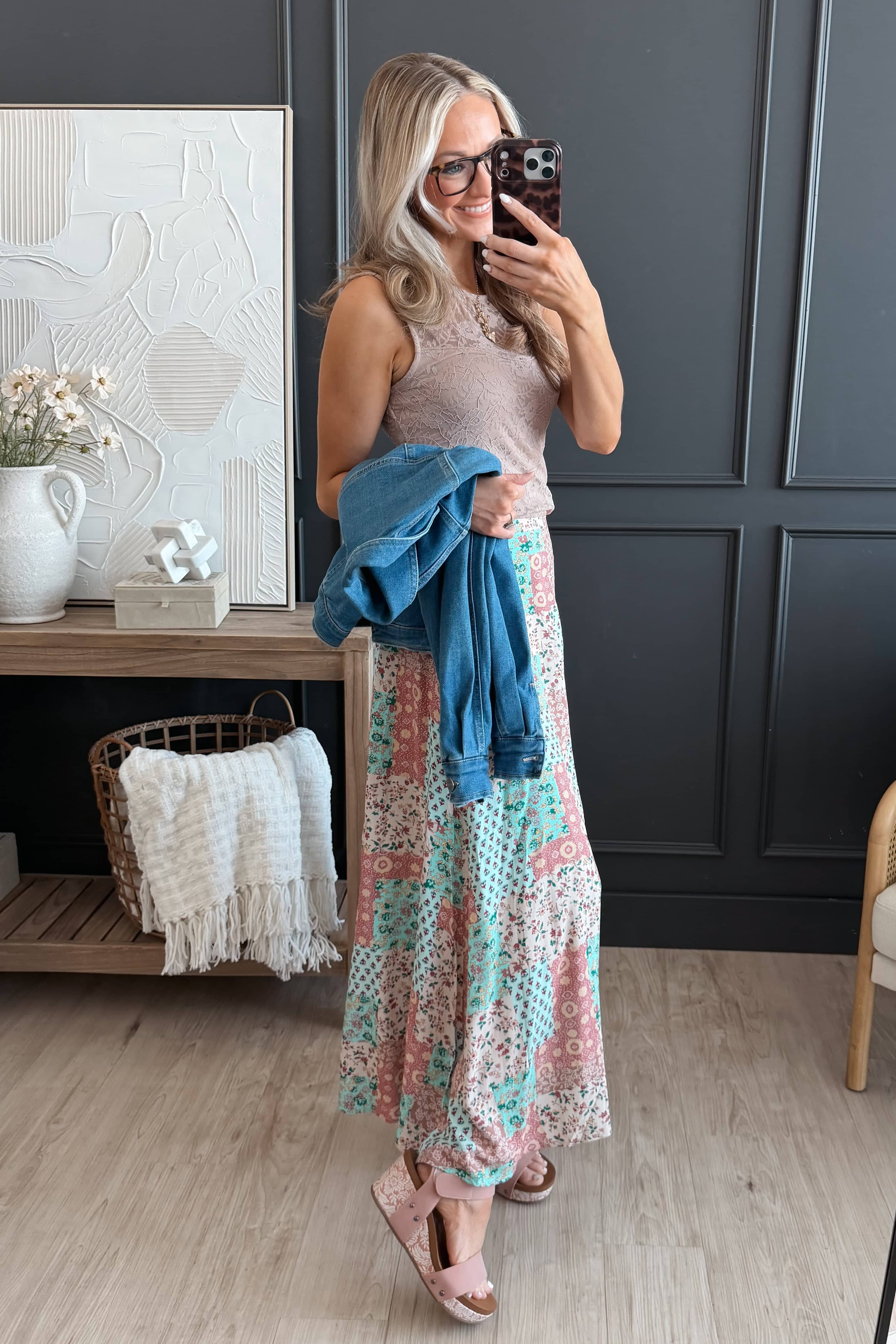This stunning patchwork floral skirt is such a fun statement piece to style in the Spring or Summer! Pair with this neutral lace top and sandals.