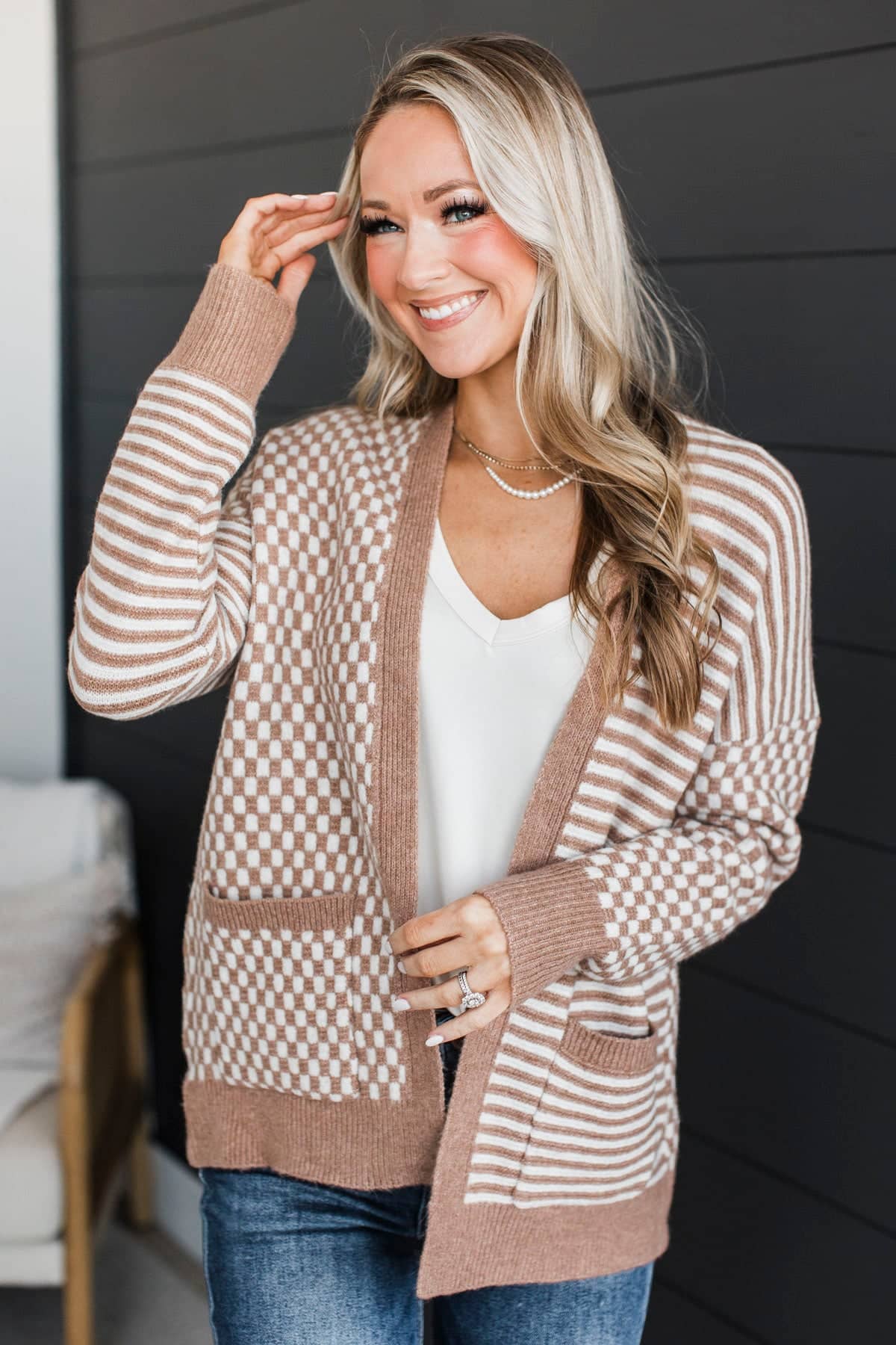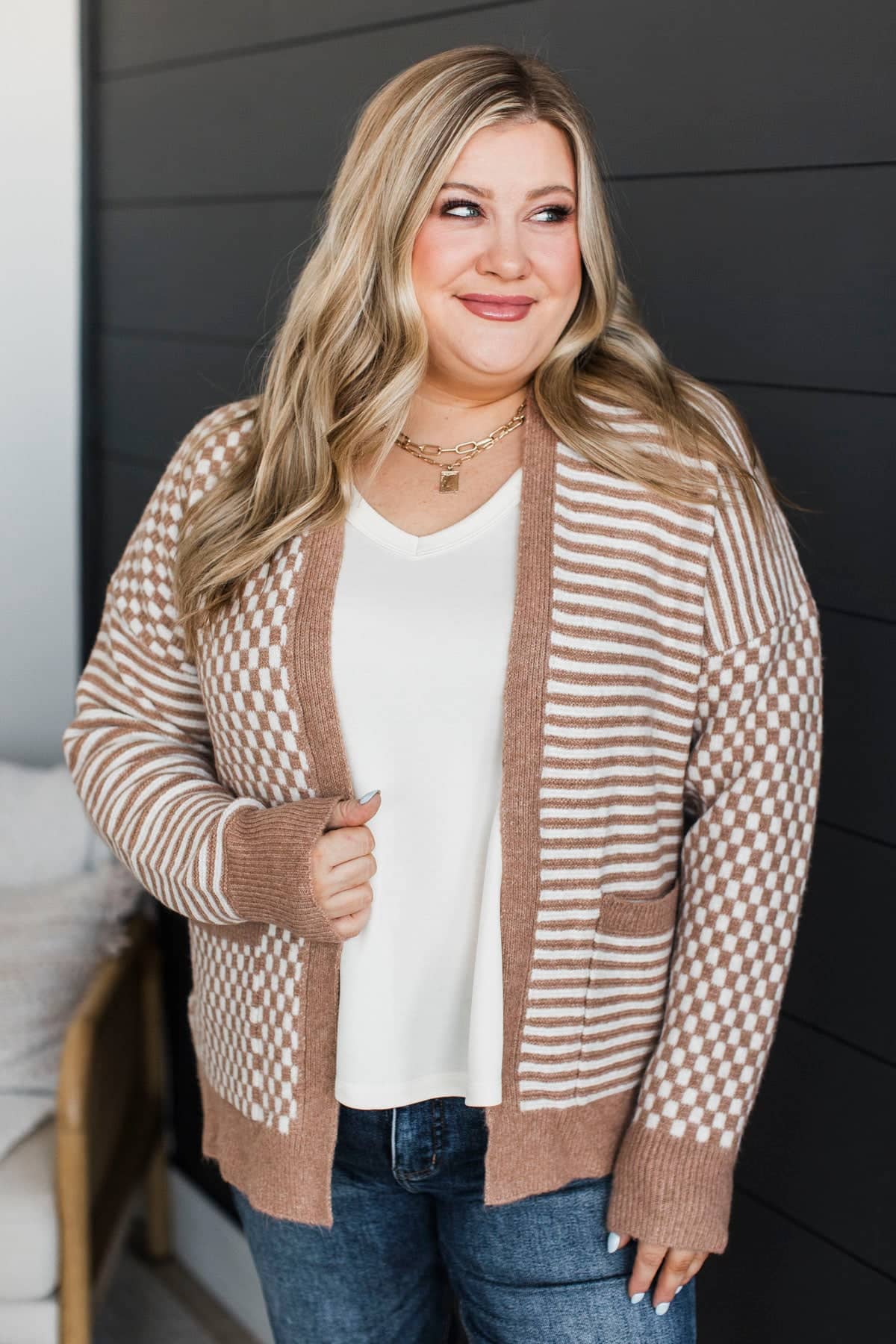 Lucky Me Striped & Checkered Knit Cardigan- Light Camel