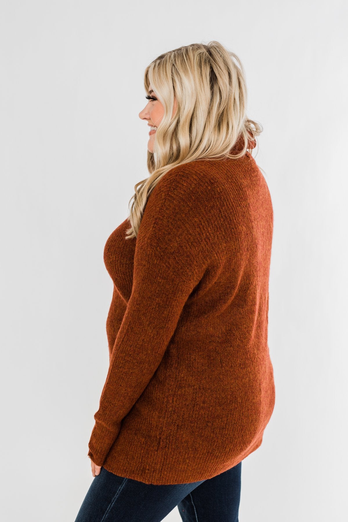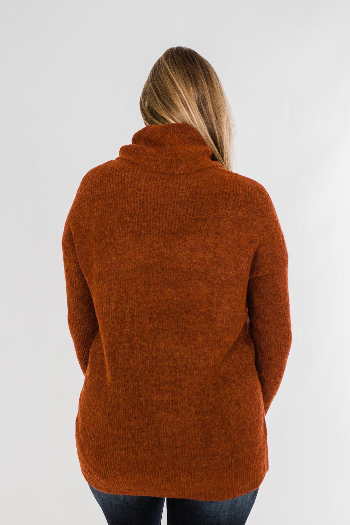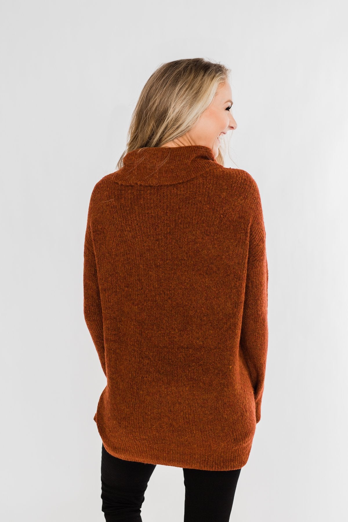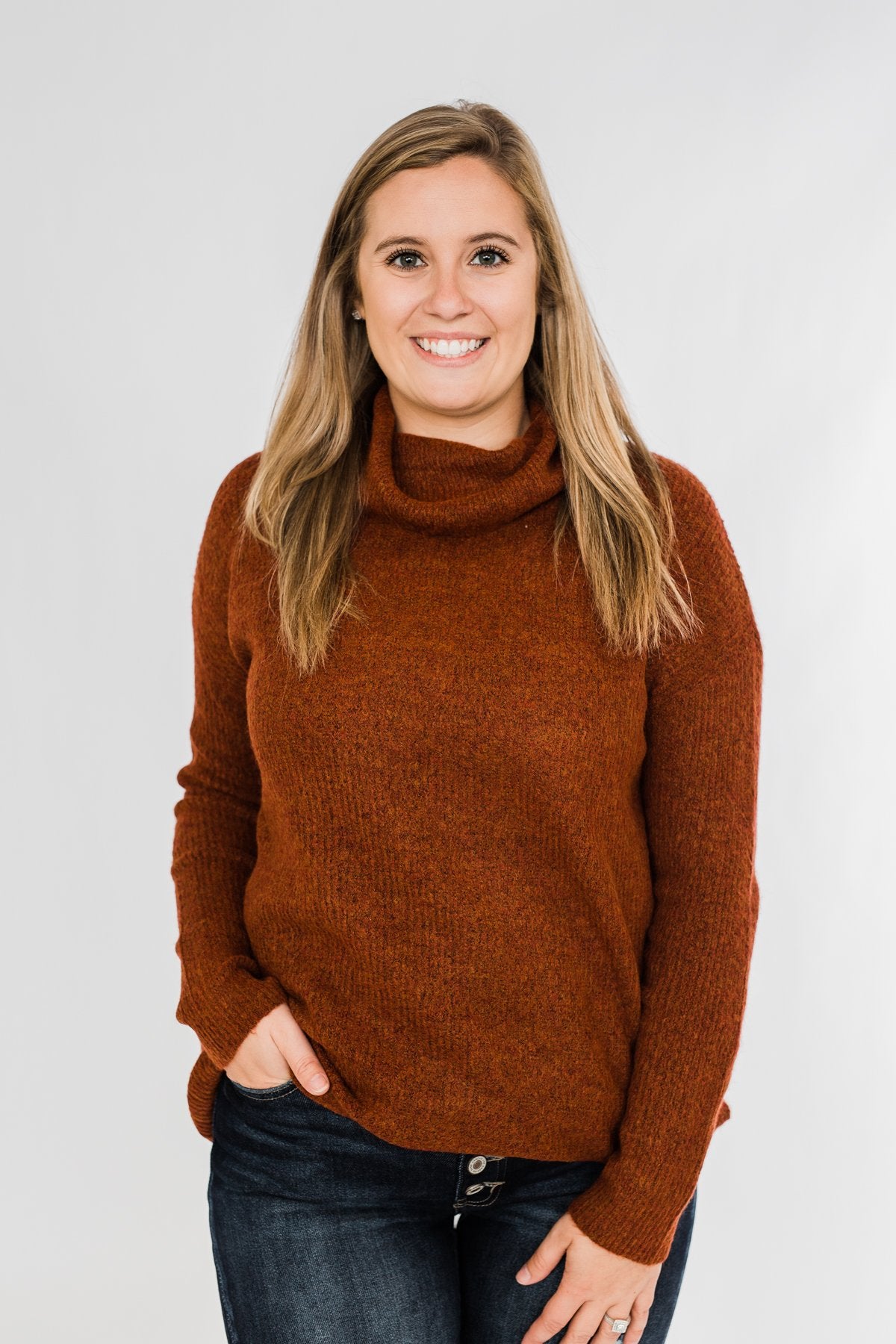 Cuddle By The Campfire Cowl Neck Sweater- Rust