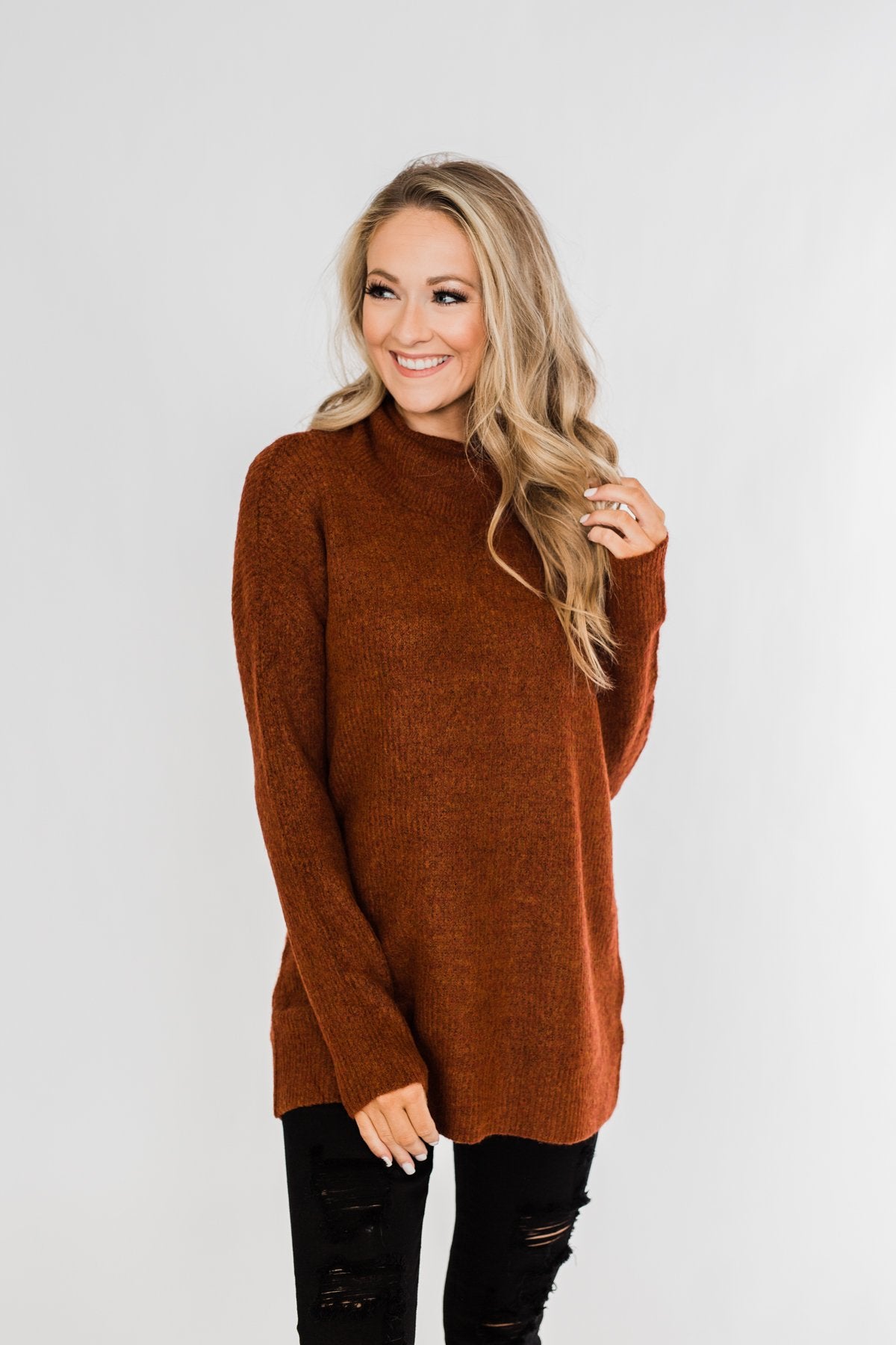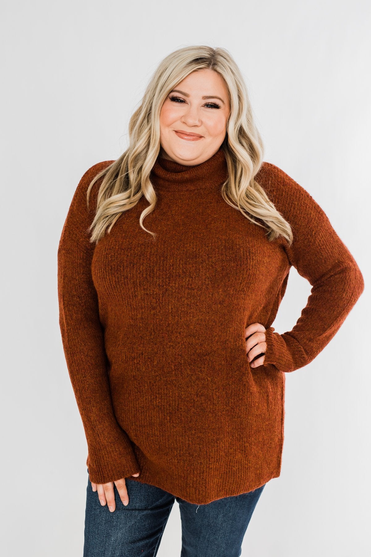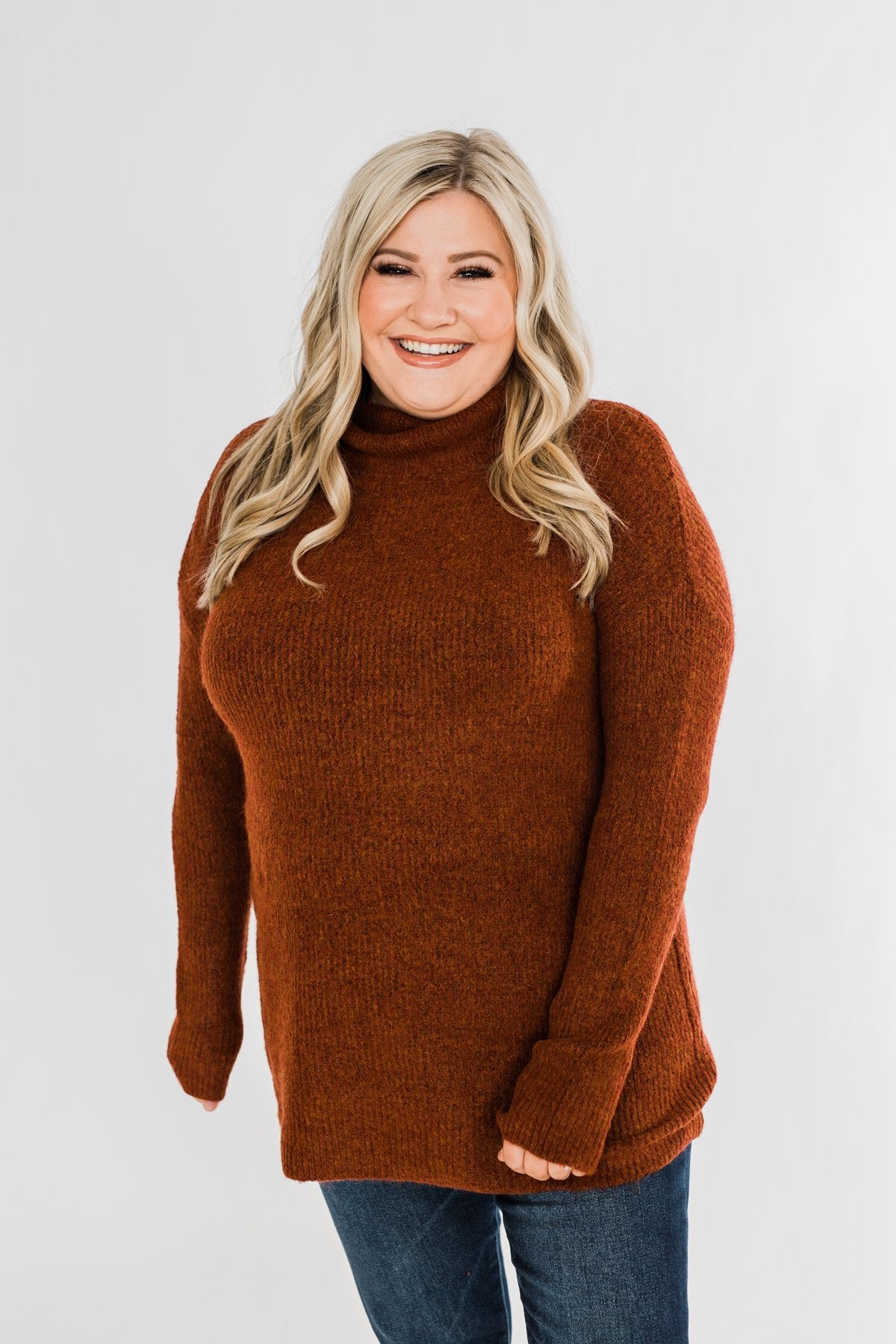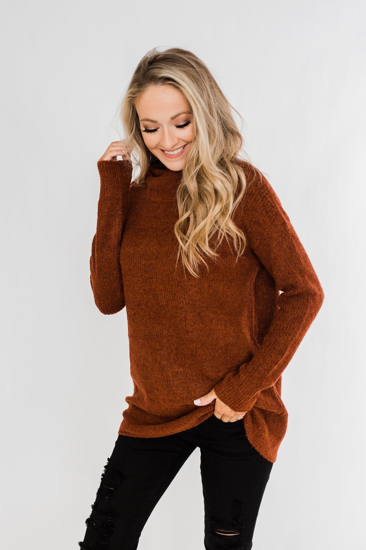 Cuddle By The Campfire Cowl Neck Sweater- Rust