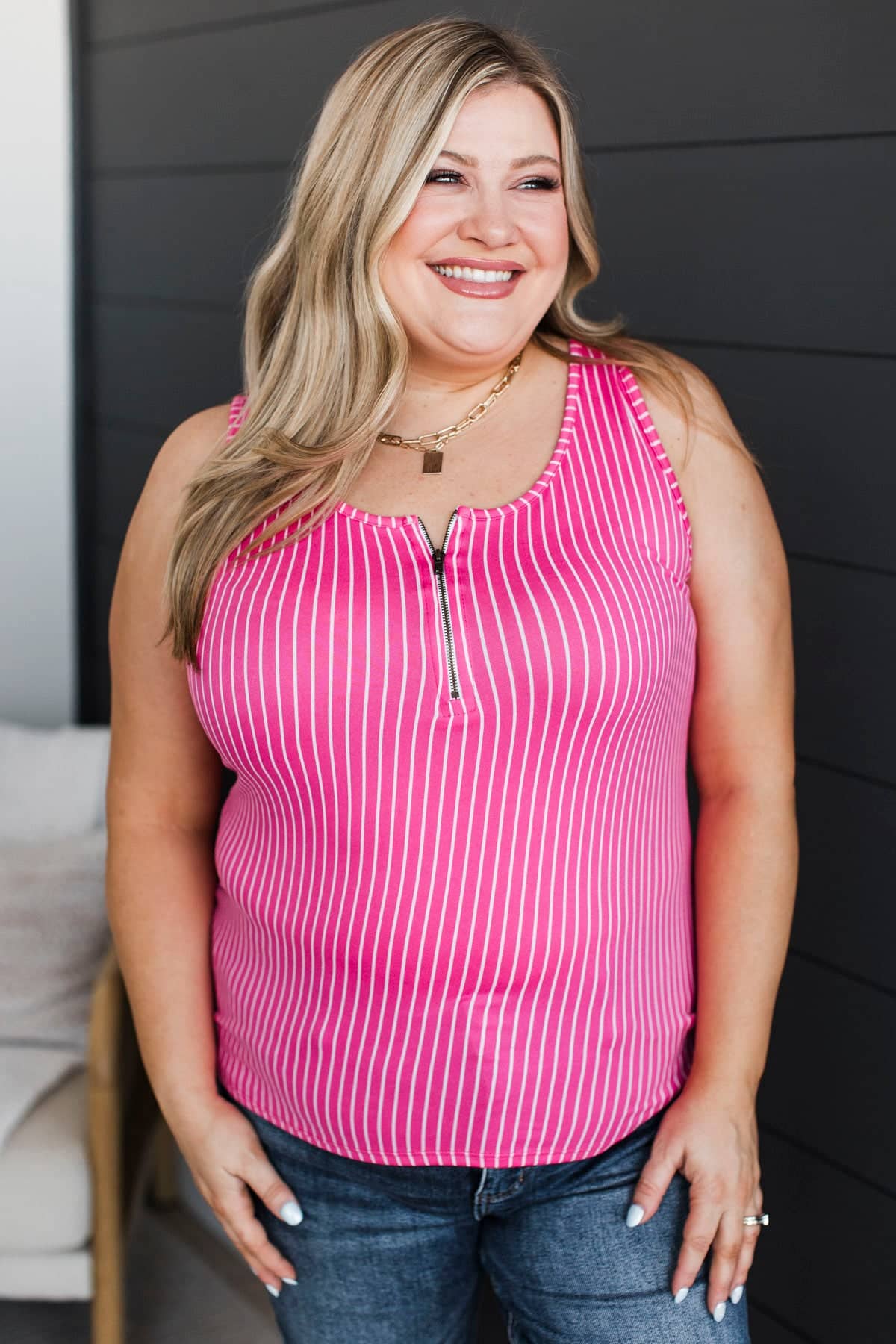 Just Glowing Striped Zipper Tank Top- Fuchsia & White
