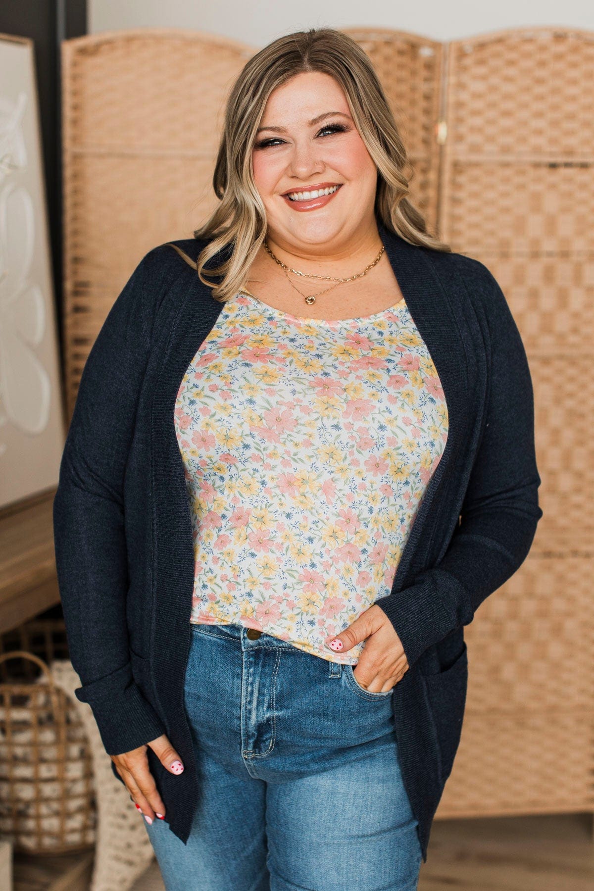 Keeping Cozy Open Front Cardigan- Two-Tone Blue