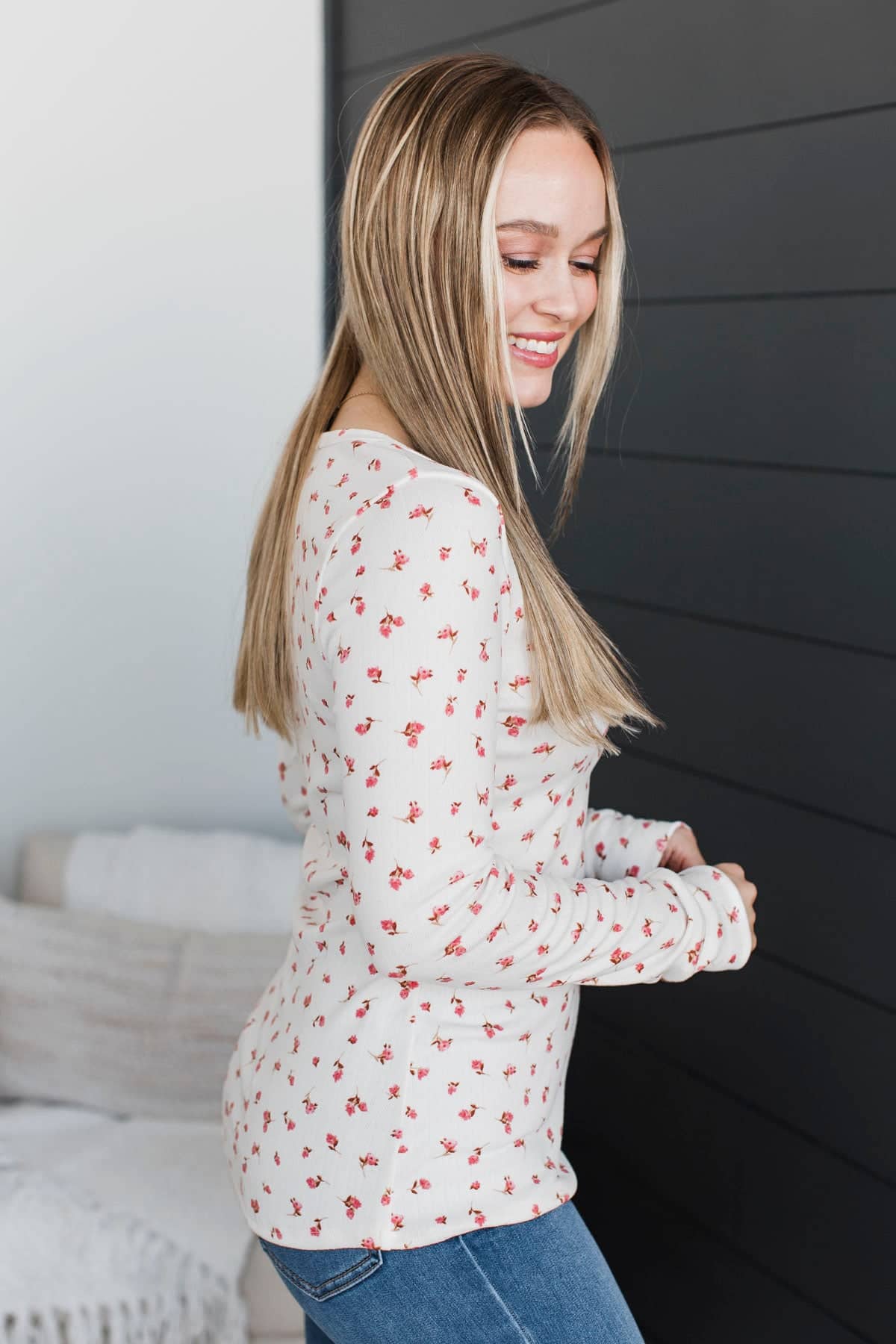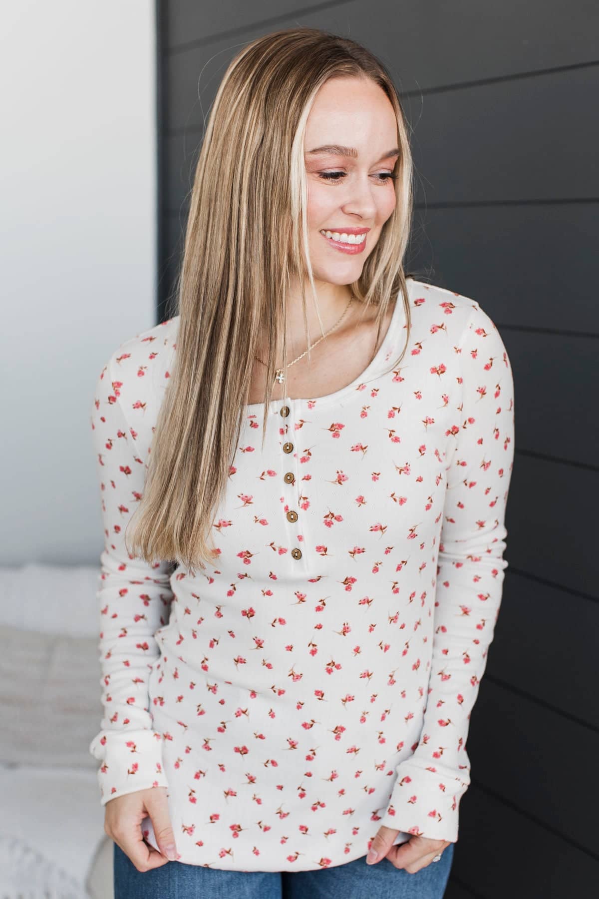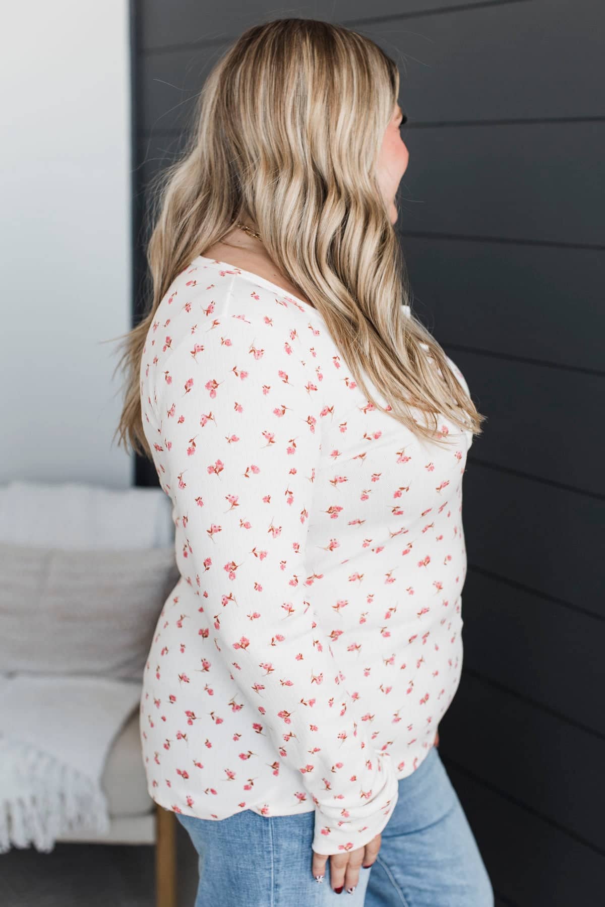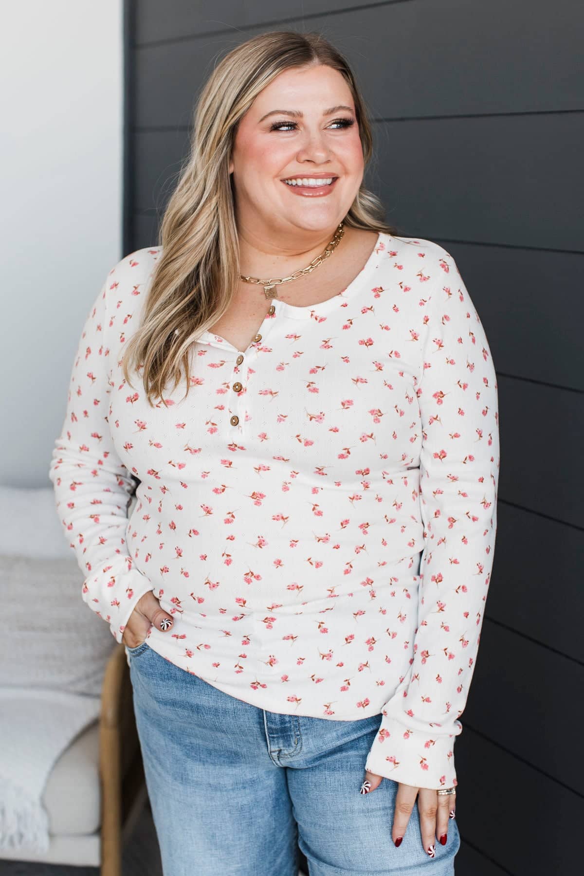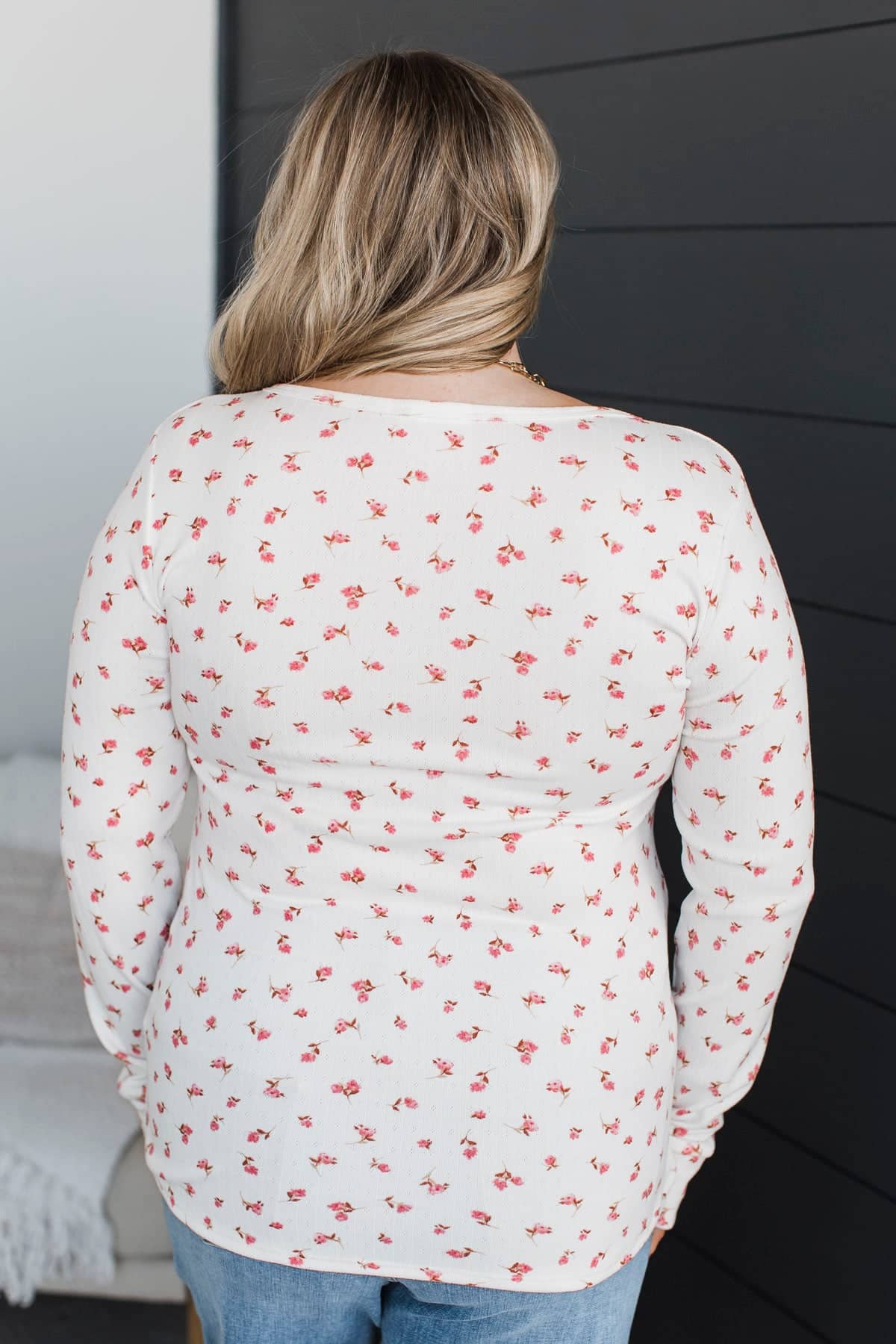 Open Your Heart Floral Henley Top- Ivory & Pink