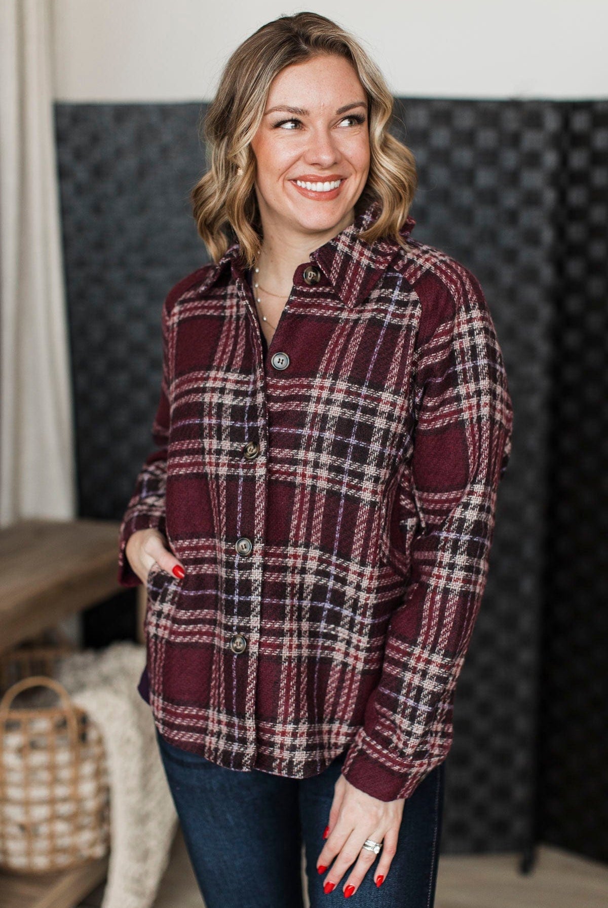 Pleasing Moments Plaid Jacket- Wine