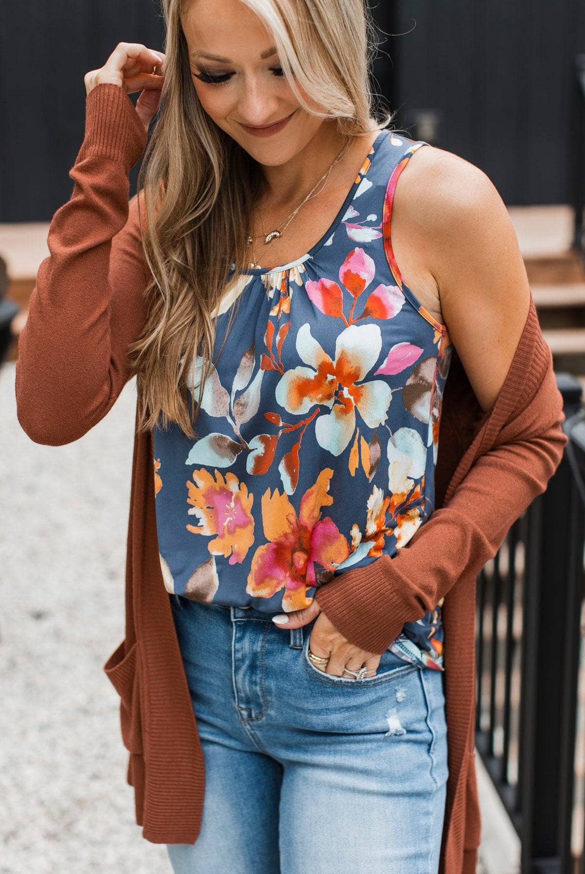 Whimsical Spirit Floral Tank Top- Denim Blue