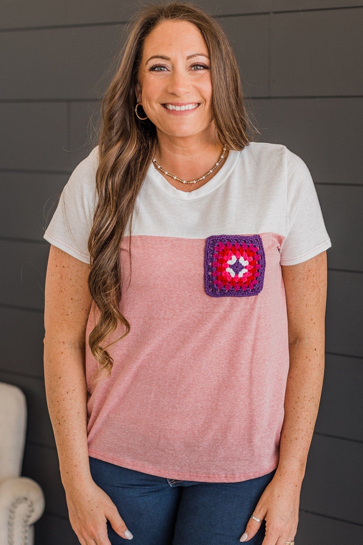 Simple Beauty Crochet Pocket Top- Ivory & Pink