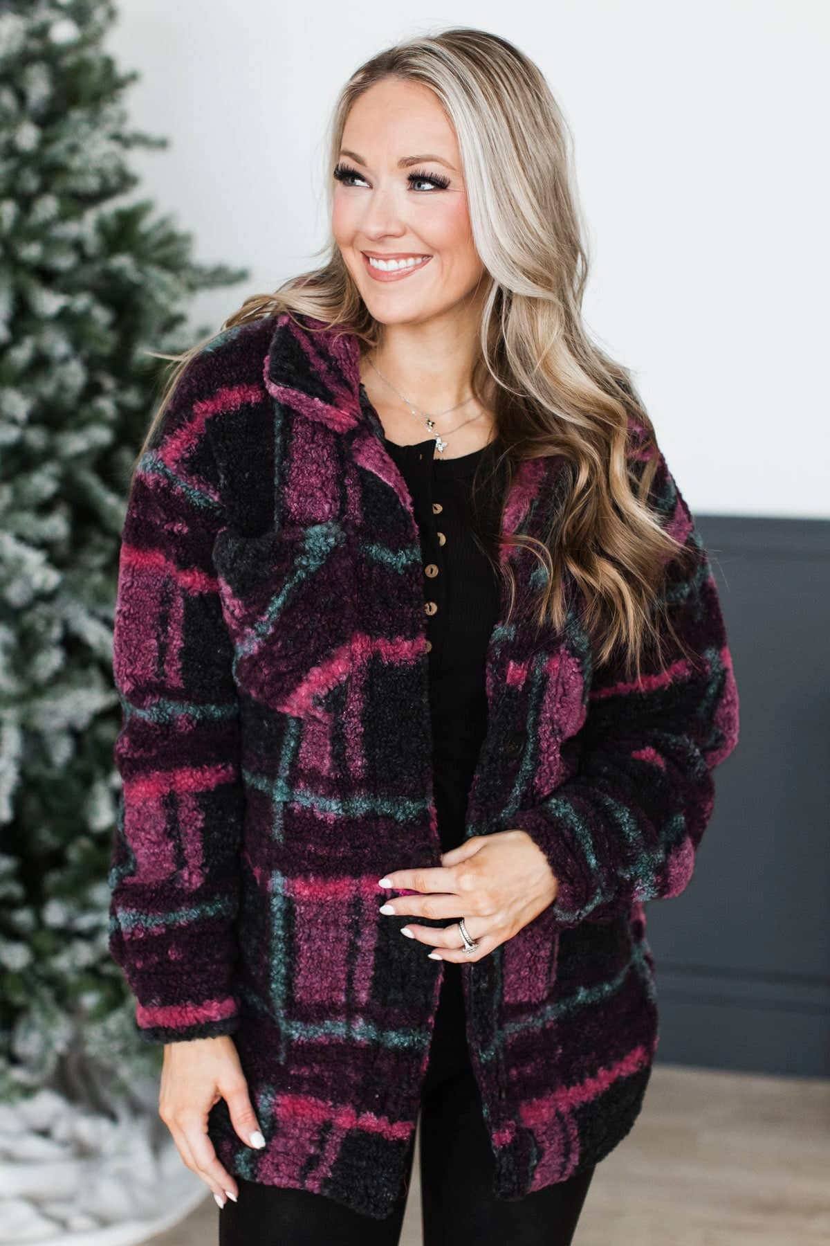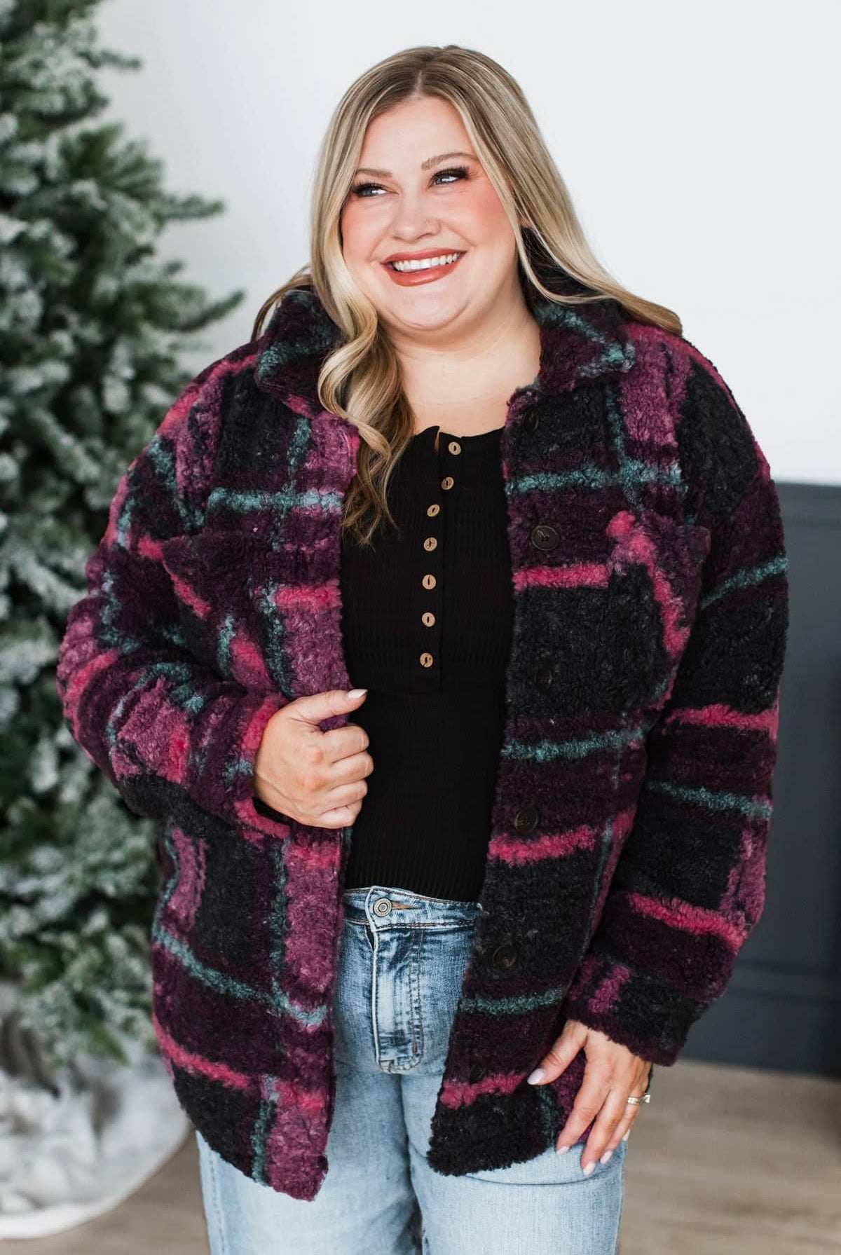 Thread & Supply Plaid Button Teddy Jacket- Black & Fuchsia