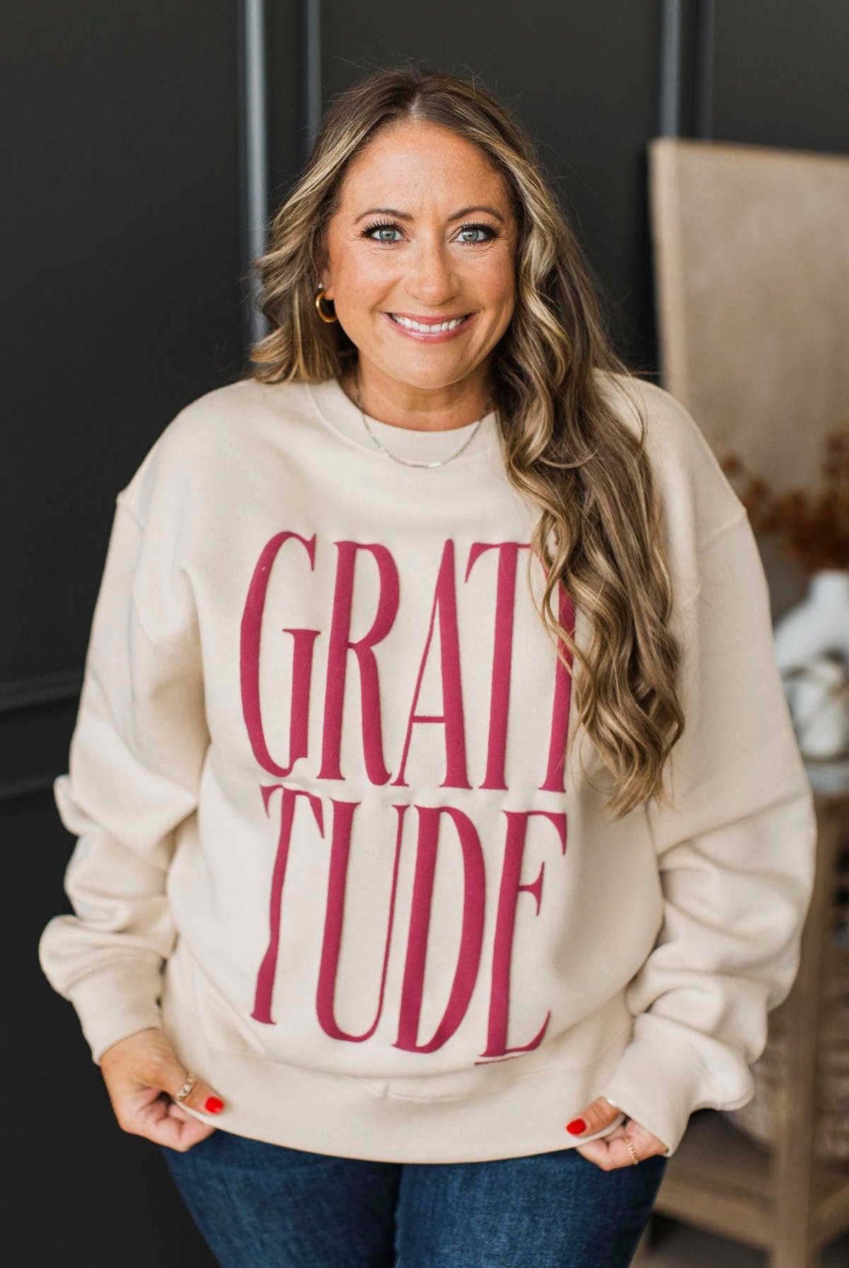 "Gratitude" Puff Crew Neck Pullover- Cream