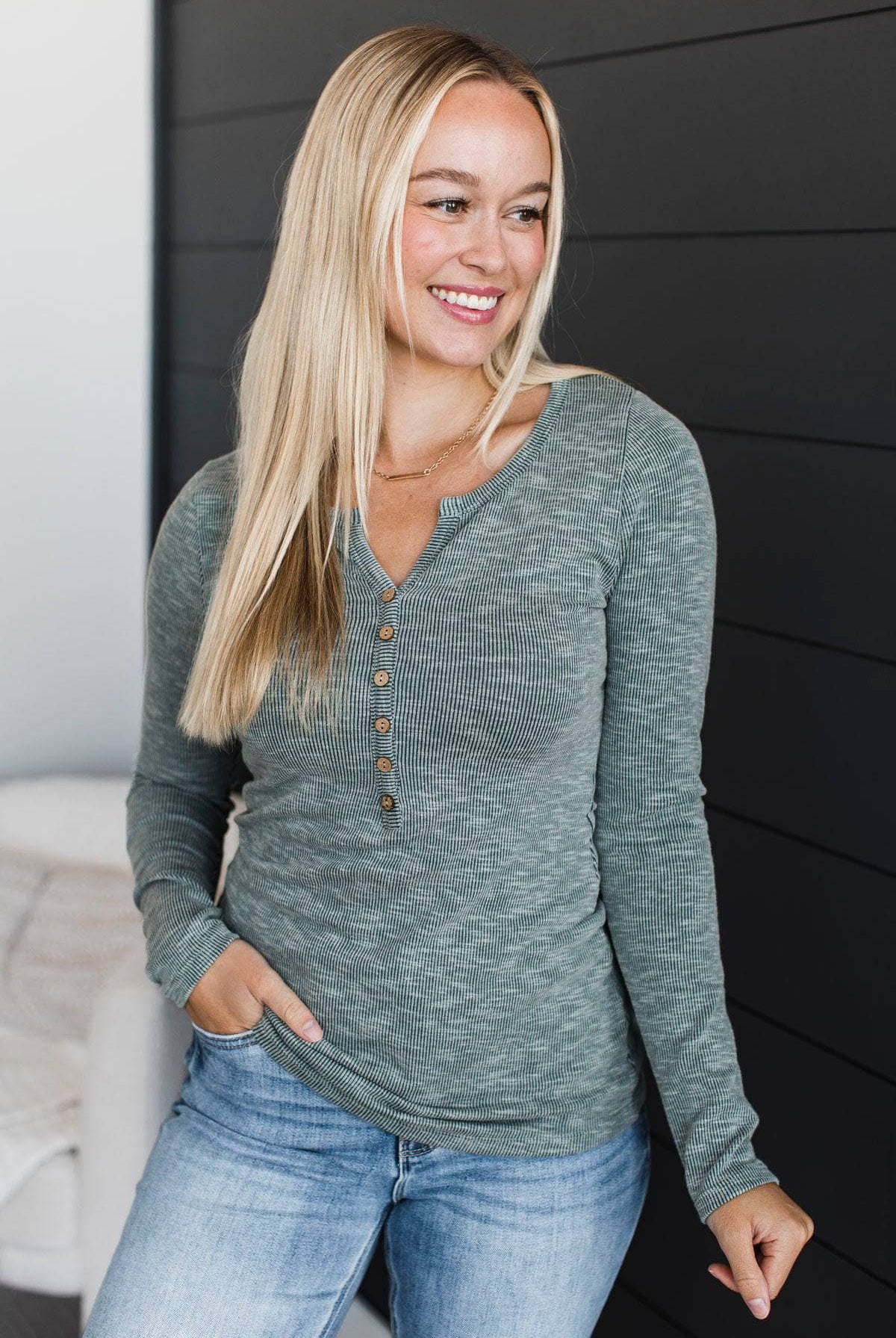 Just Living Long Sleeve Notched Top- Hunter Green