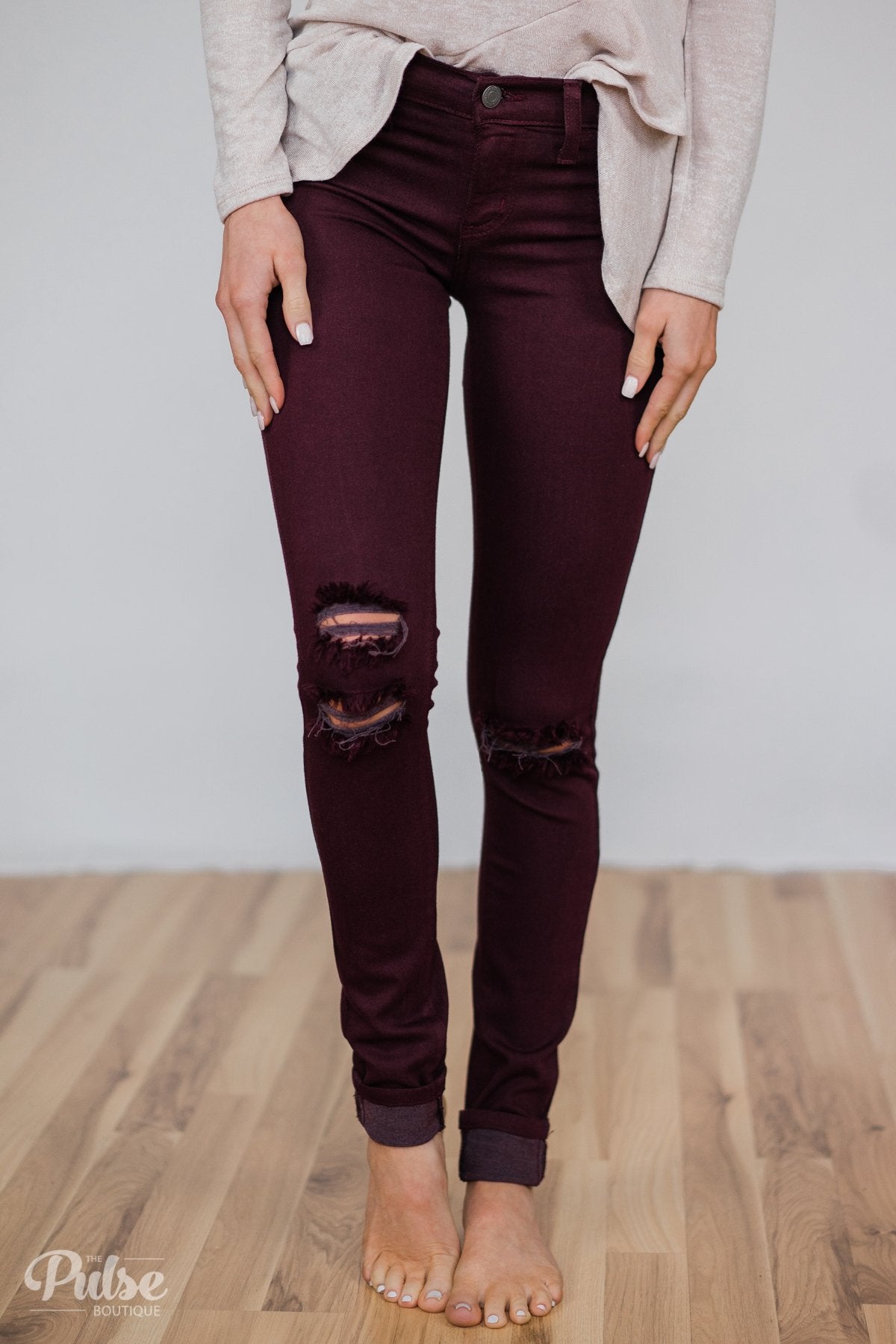 Kan Can Knee Distressed Skinnies- Deep Burgundy