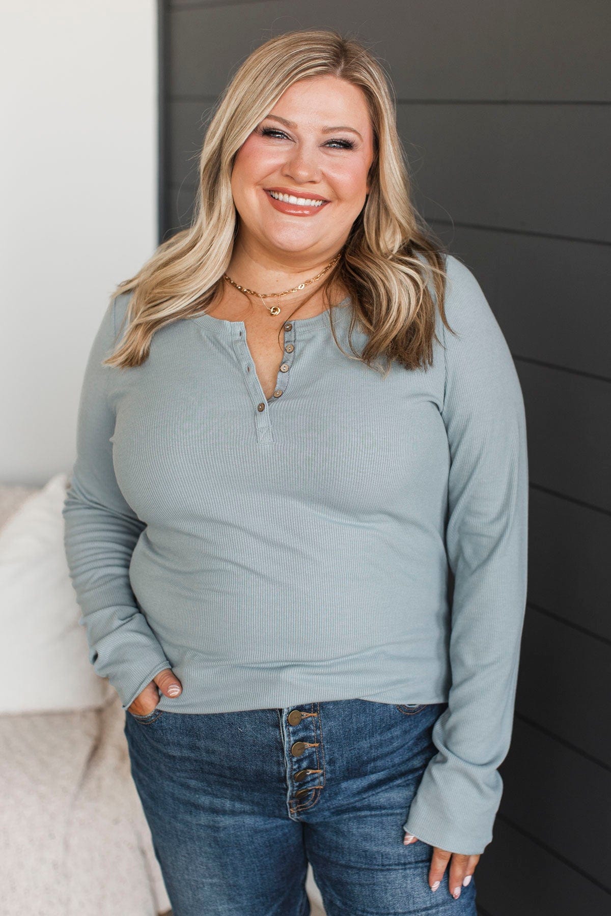 Rise To The Top Knit Henley Top- Dusty Blue