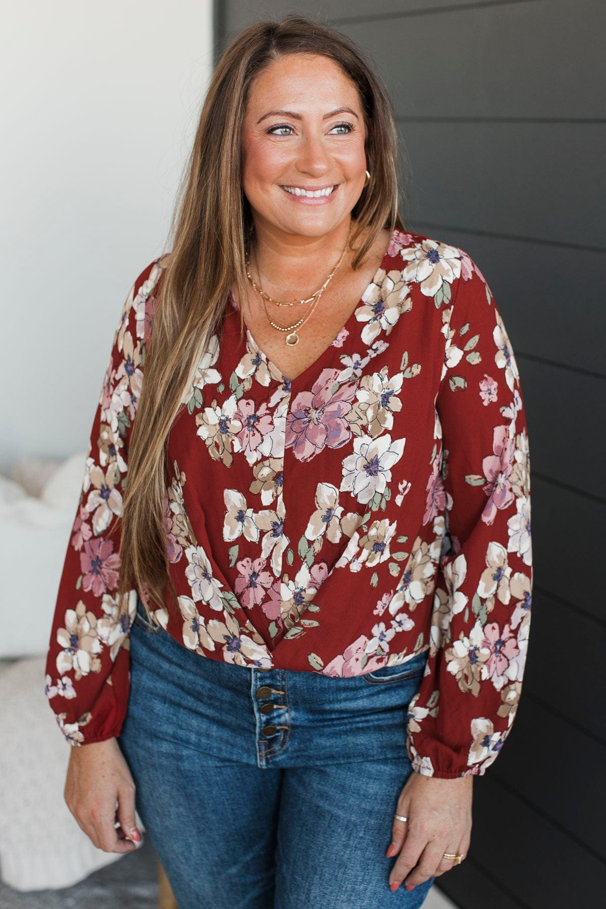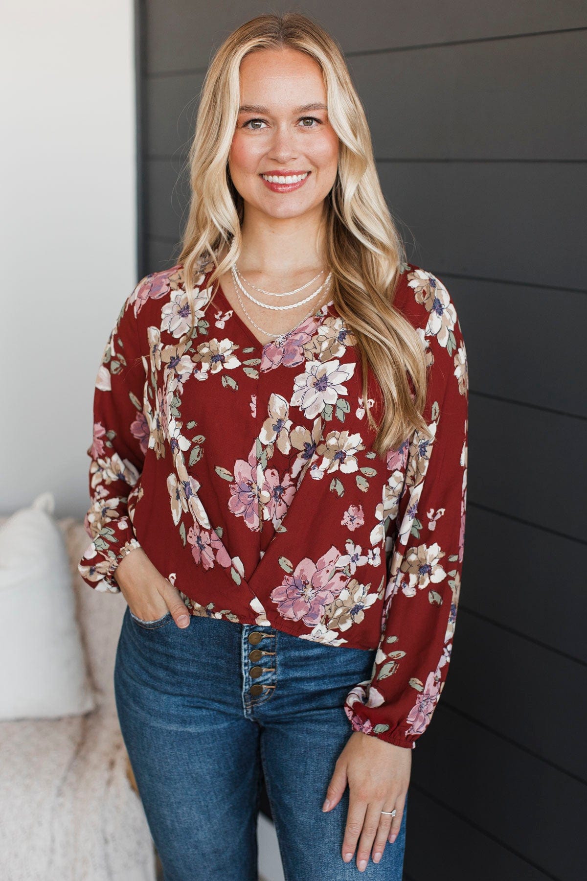 Incredible Life Long Sleeve Floral Top- Burgundy