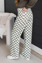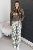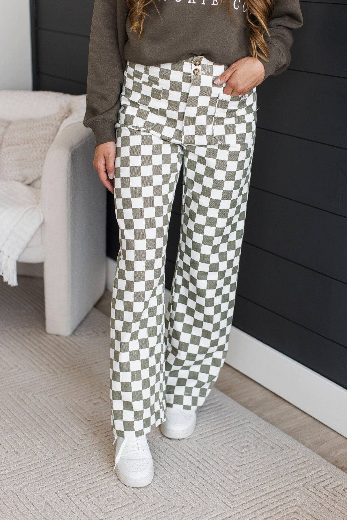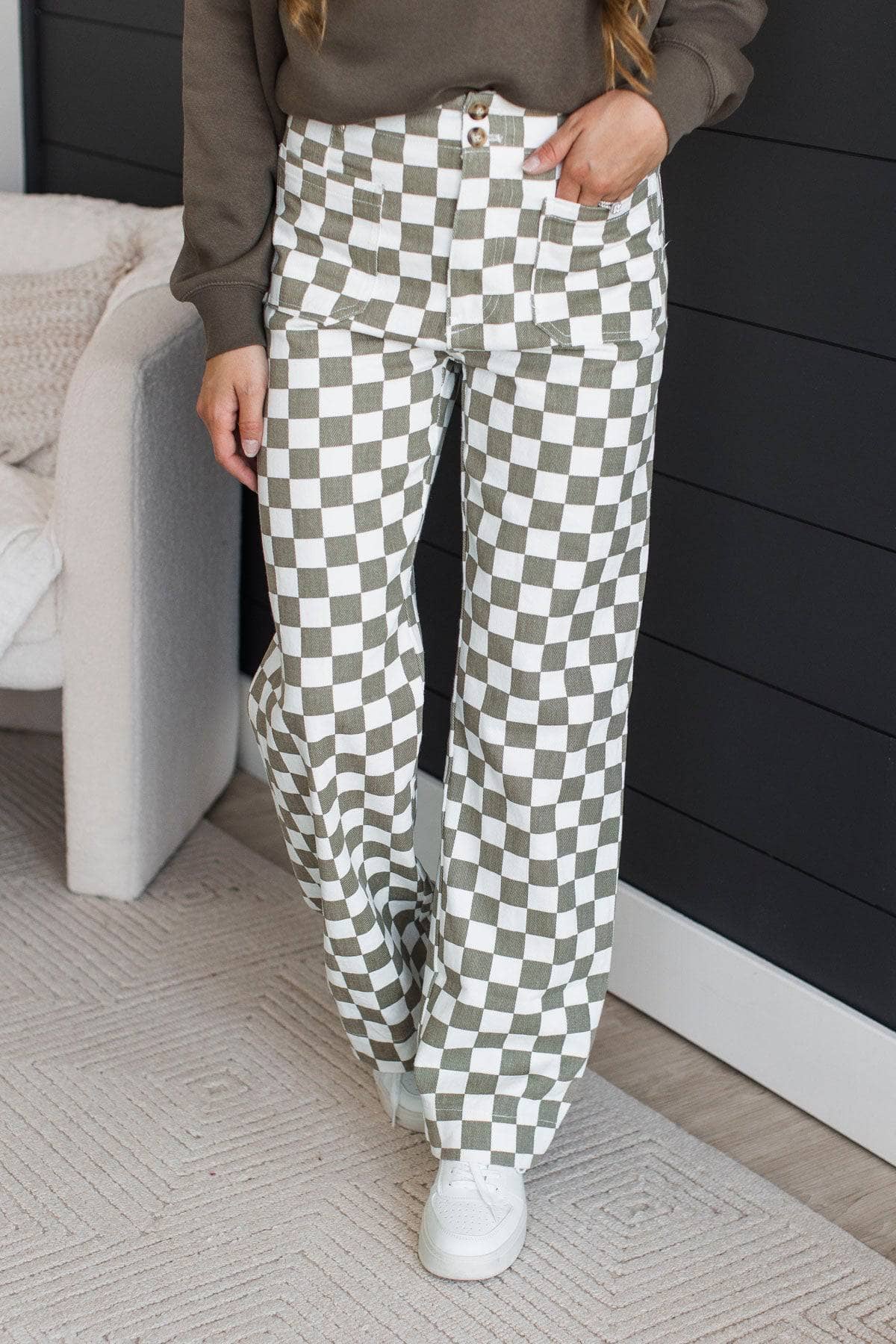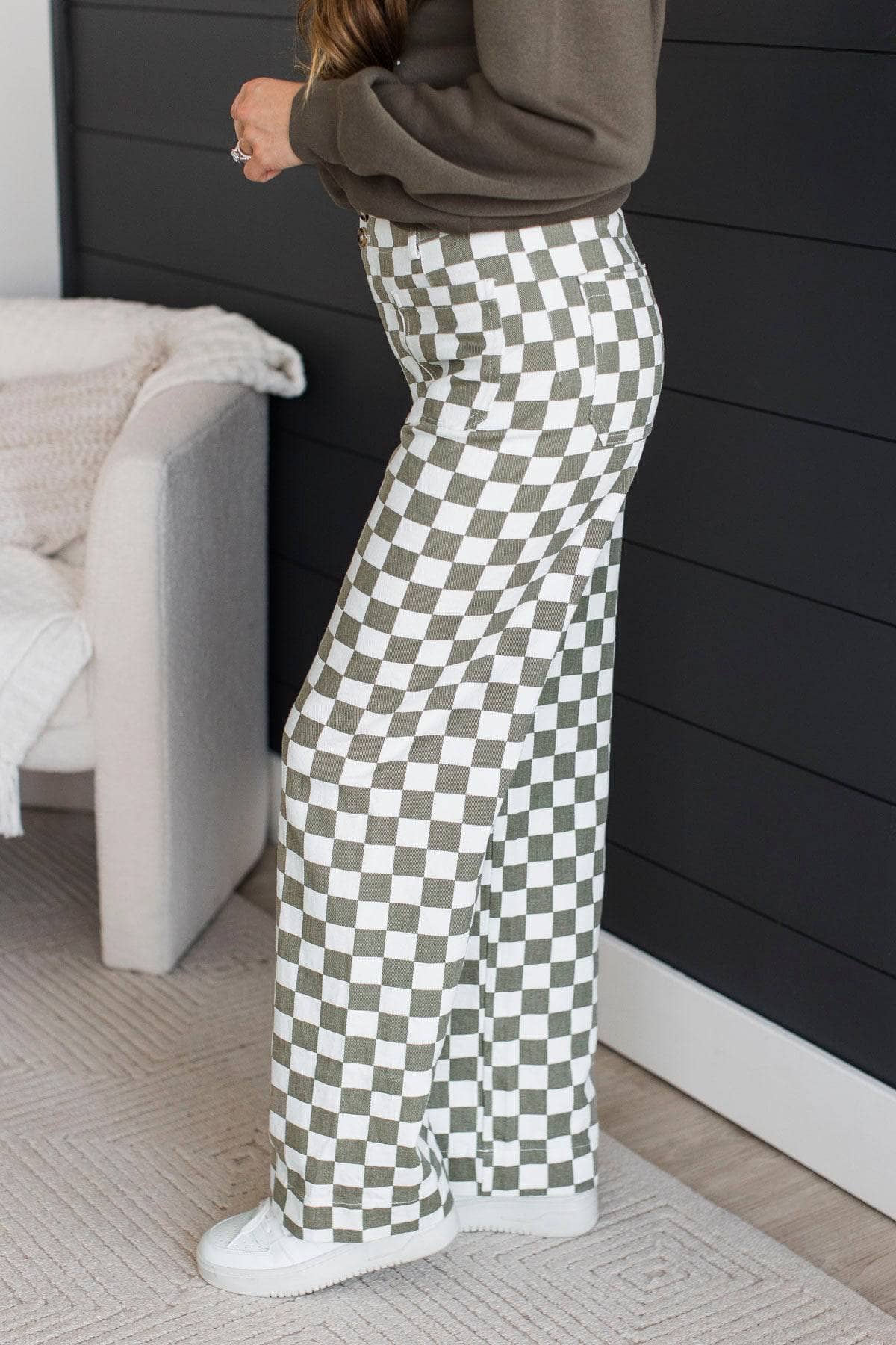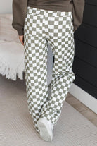 Checkered High-Rise Wide Leg Jeans- Dark Taupe & Ivory
