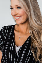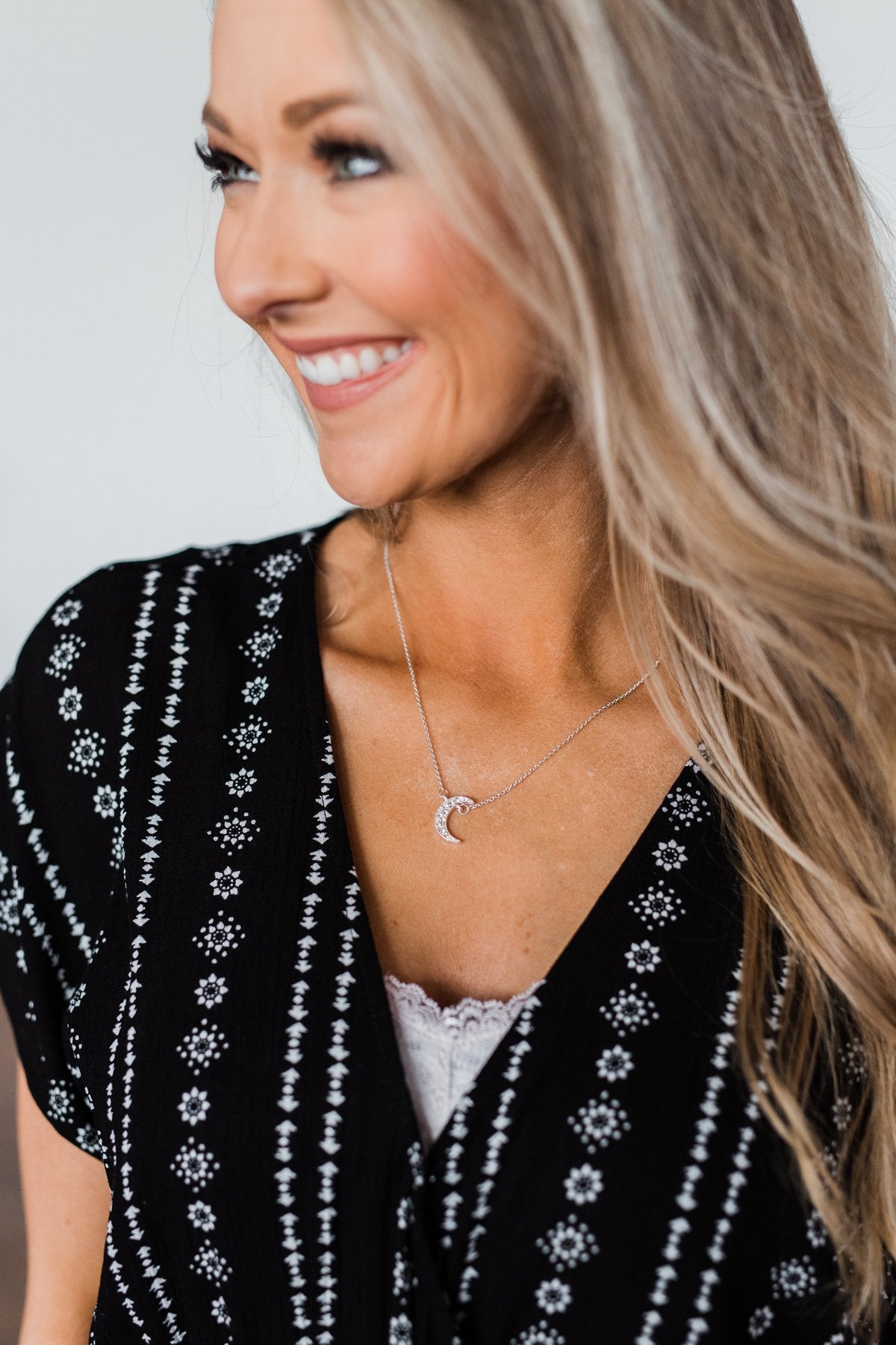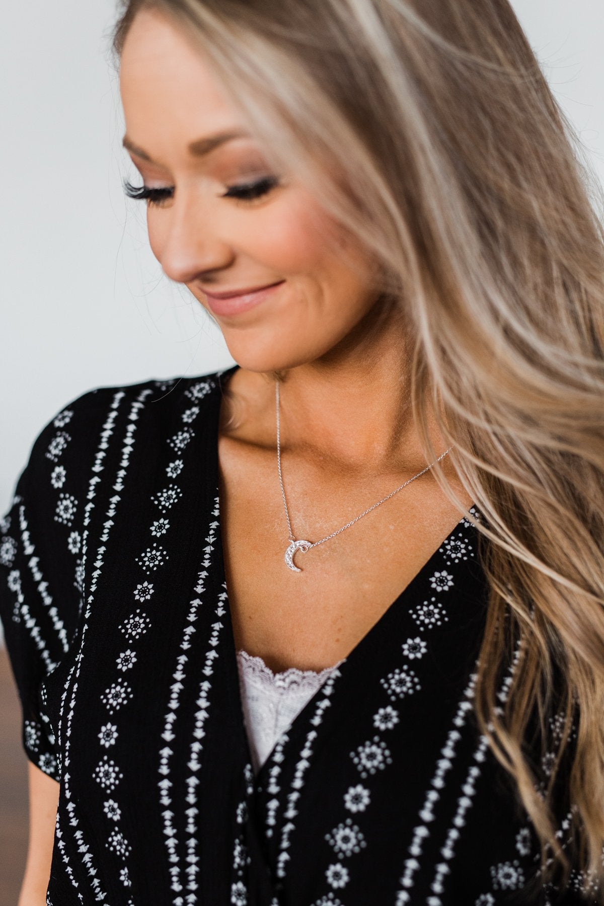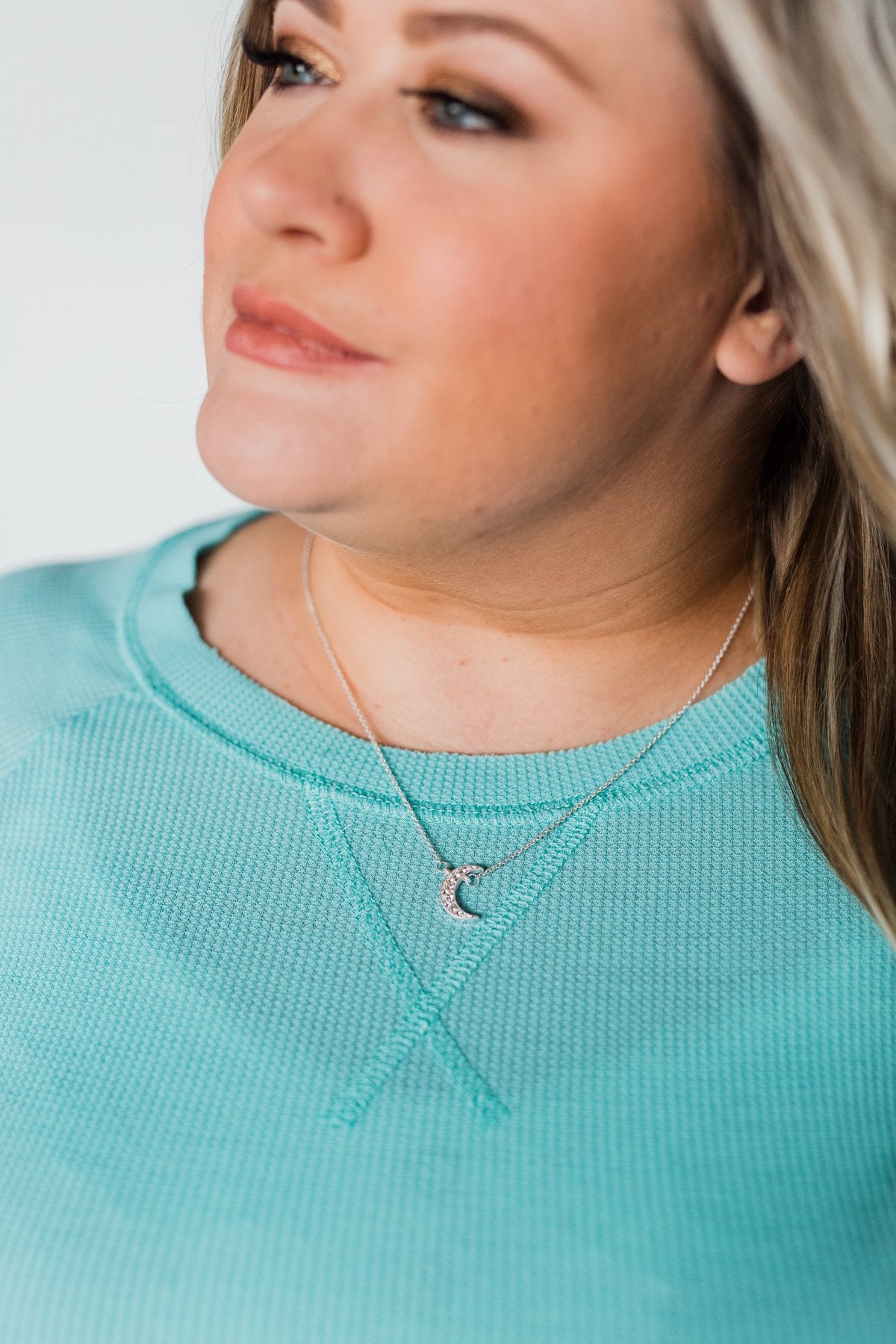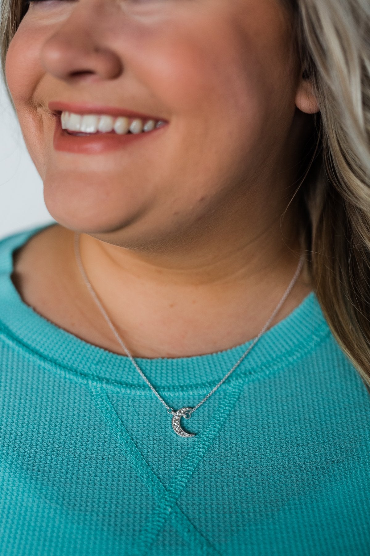Silver colored necklace with a diamond studded crescent. This simple necklace will add just enough charm to any outfit!