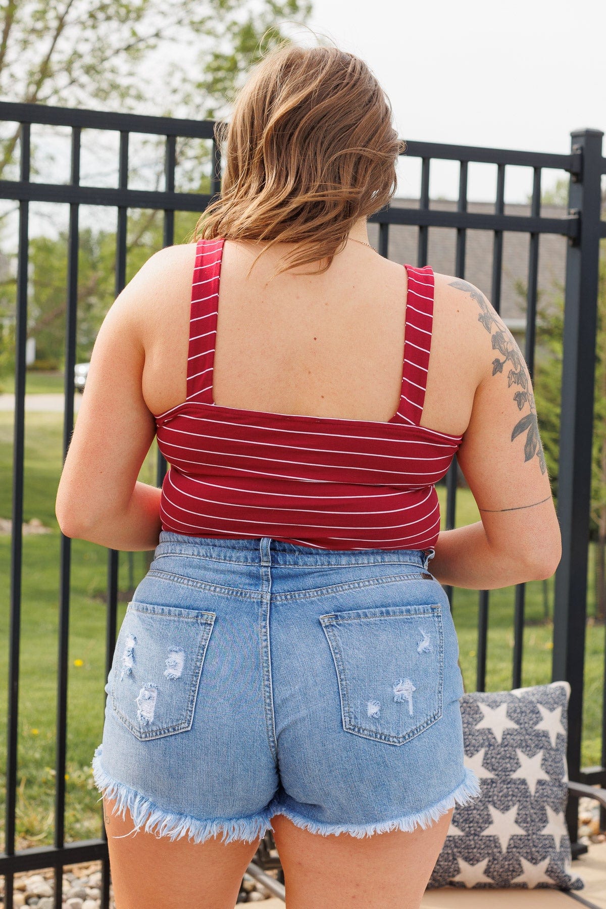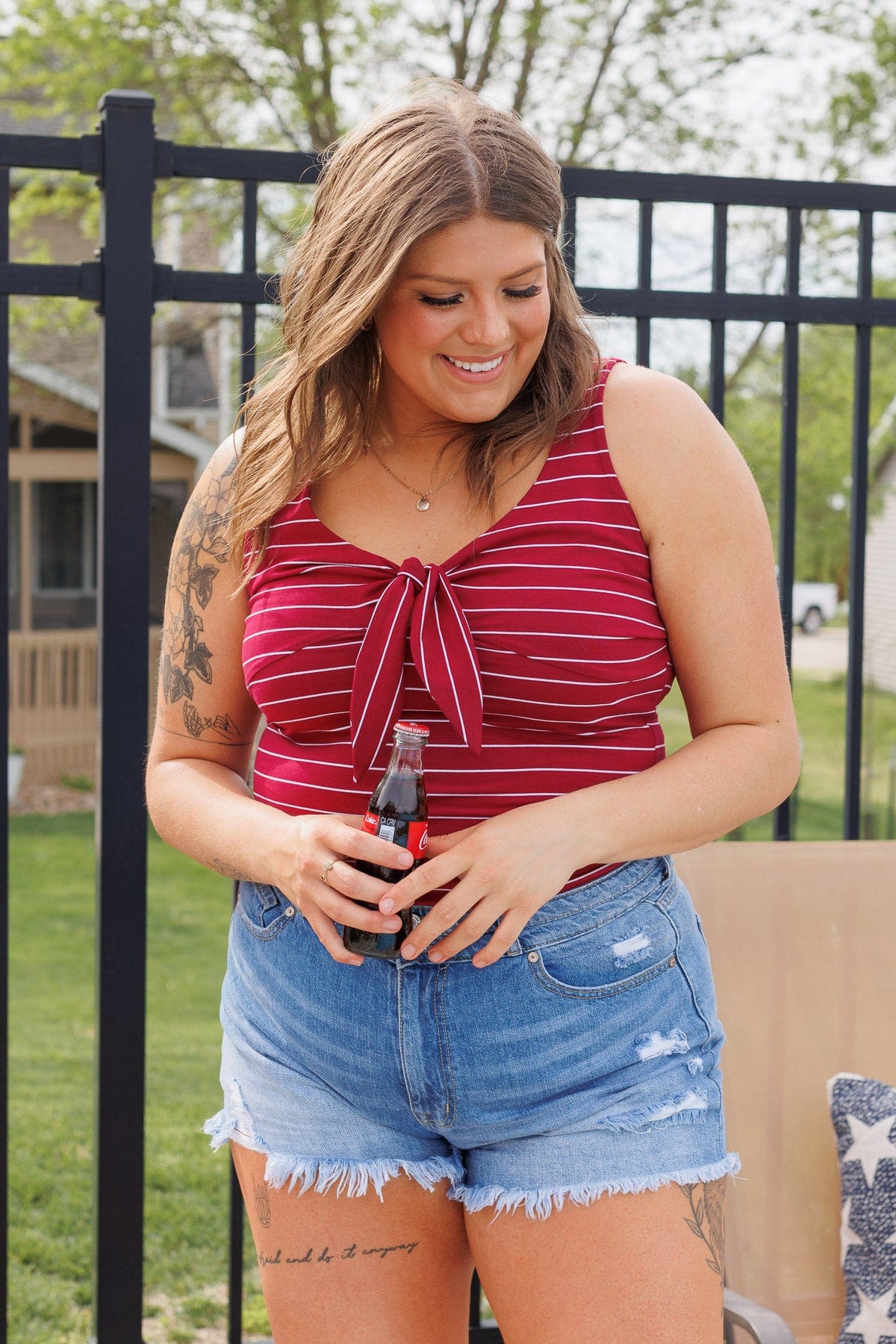 Keep it classy everywhere you go with this striking bodysuit! This piece has it all with details like the tie bust with a keyhole detail and the simple striped pattern that pairs well just about anything! Wear this on a Summer cruise or to the county fair!