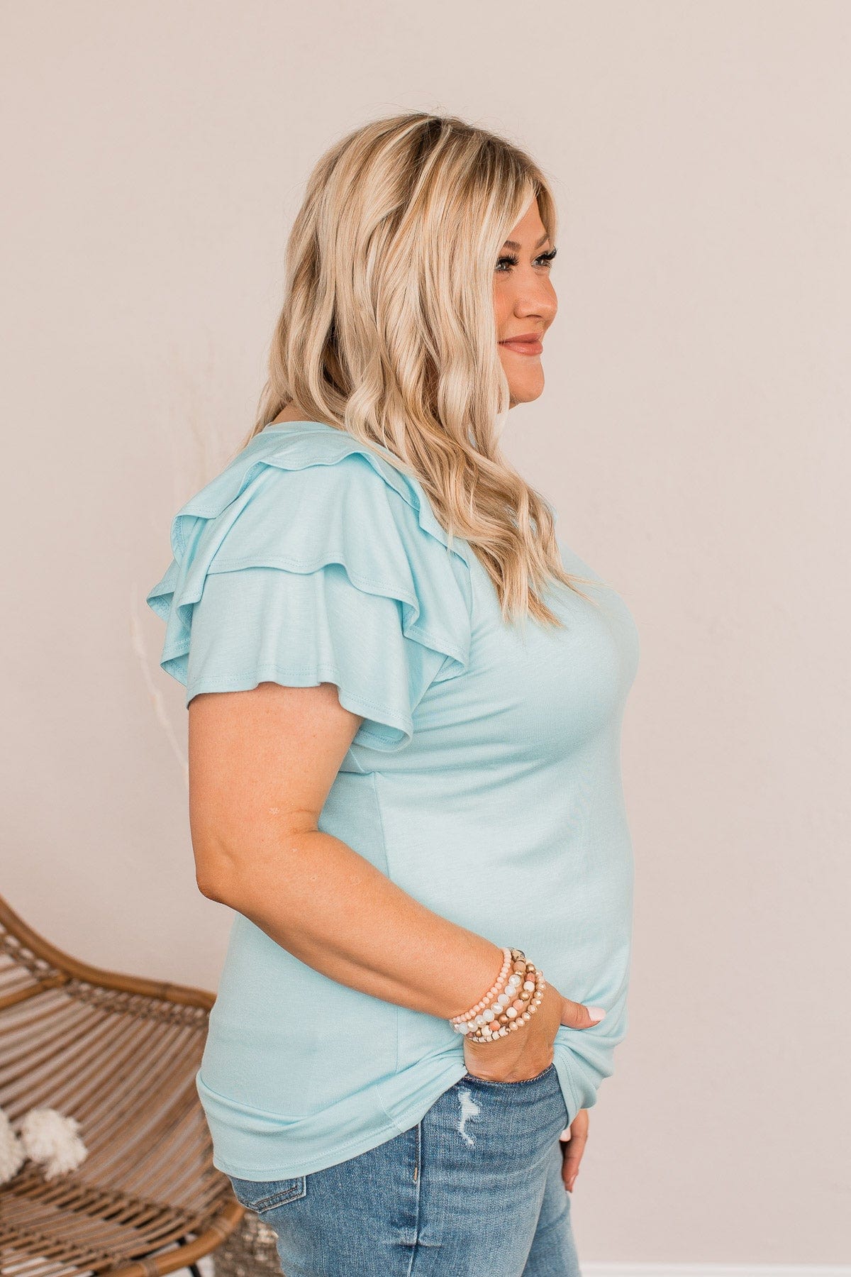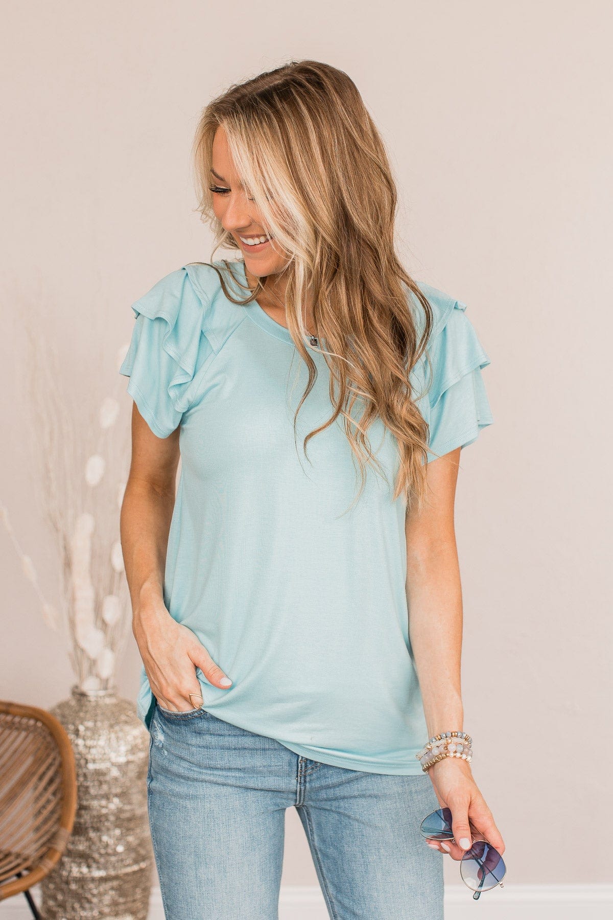 Almost There Tiered Flutter Sleeve Shirt- Light Blue