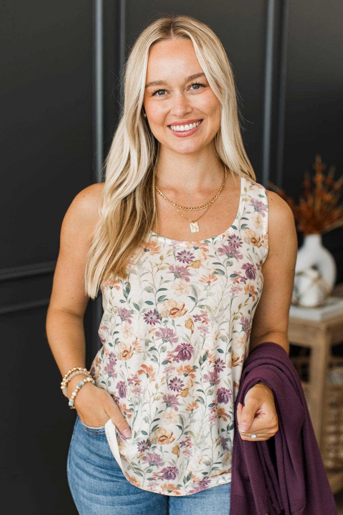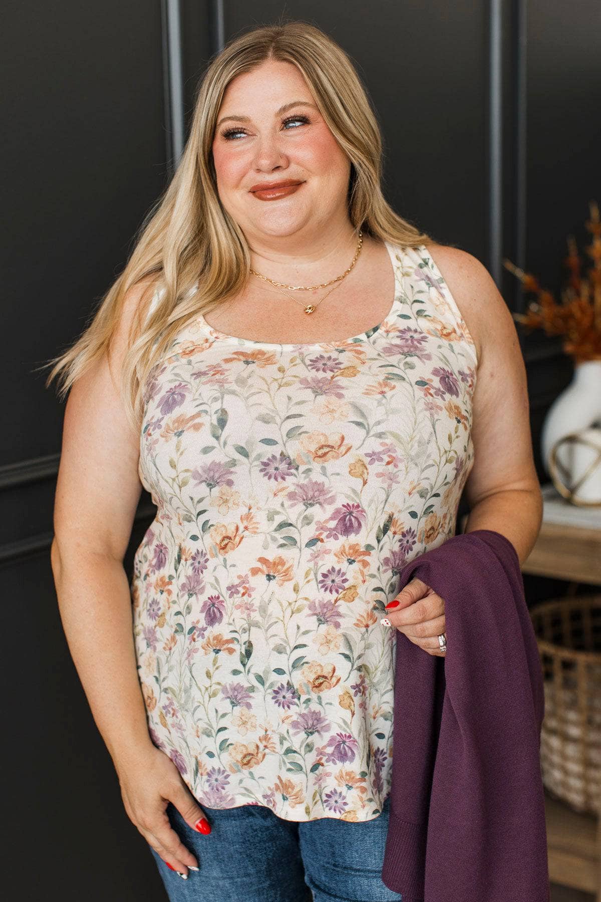 Plenty Of Smiles Floral Tank Top- Ivory & Purple