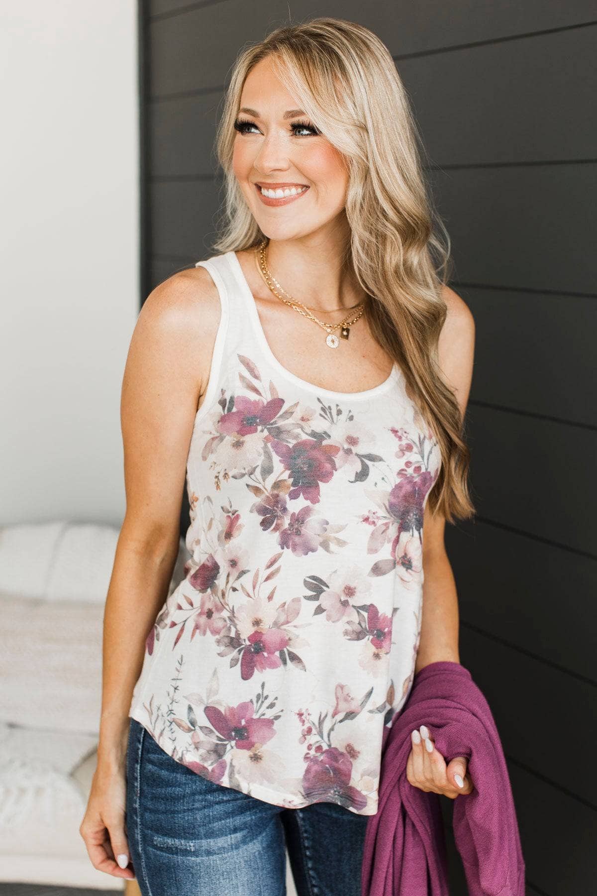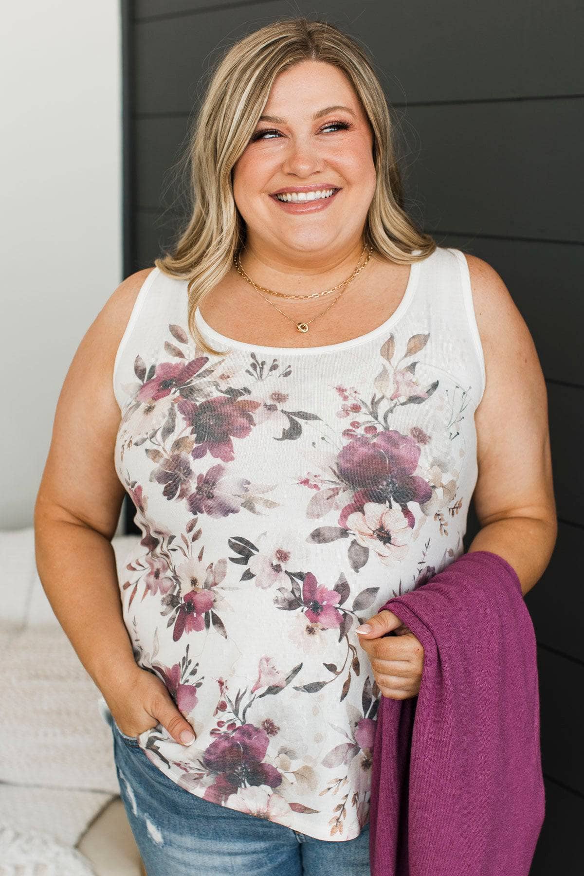 Simple Truths Floral Tank Top- Ivory & Deep Orchid