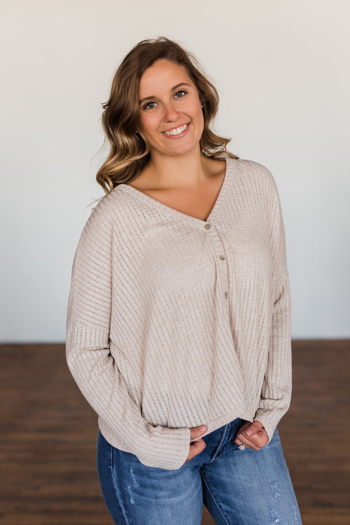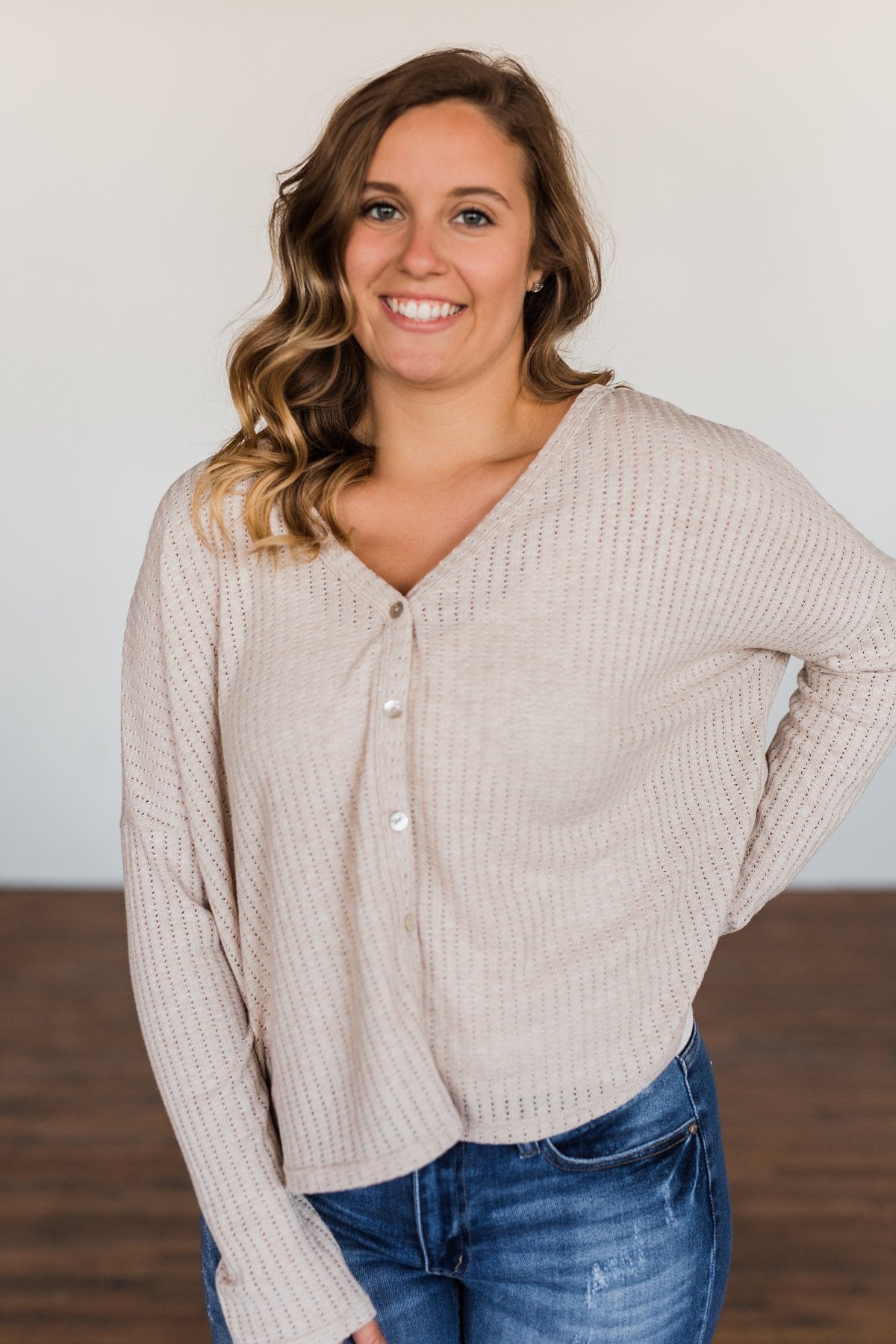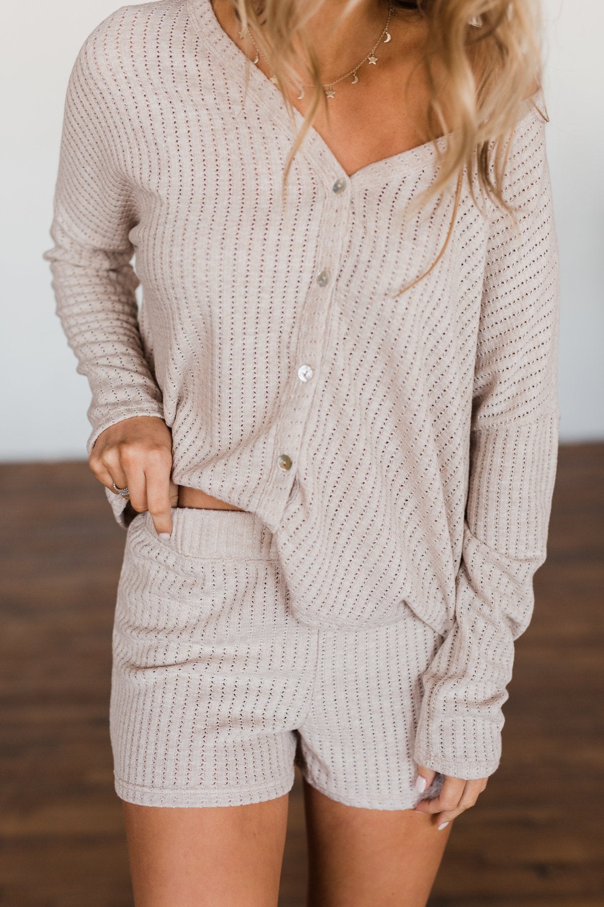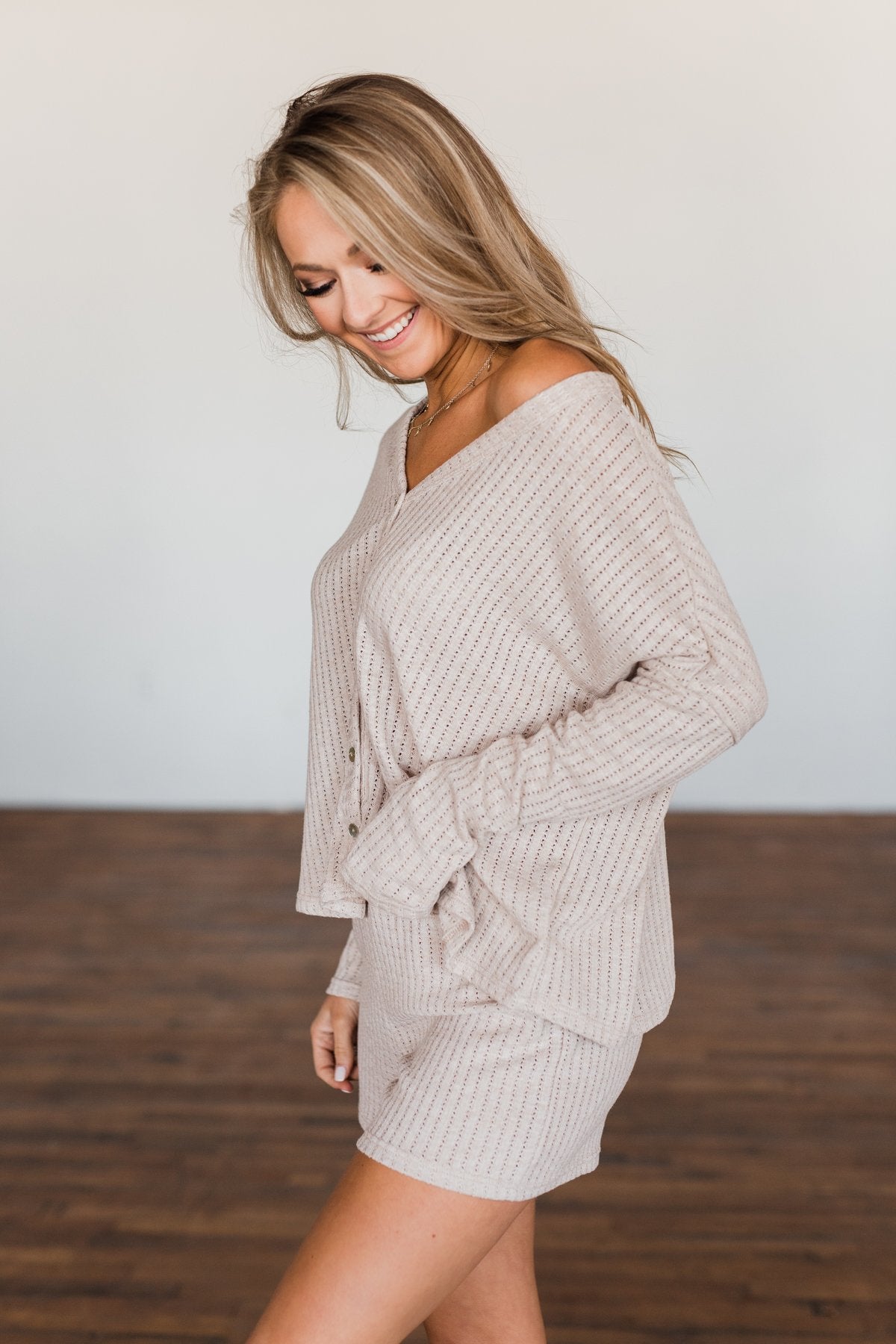 Spend your day in style without sacrificing comfort with dolman sleeve, knit button top! This versatile top can easily be paired with high waisted shorts and sandals for an adorable outfit on those warmer Autumn days or paired with the matching bottoms for the comfiest lounge outfit! The soft, lightweight knit material makes this top an easy choice for all day wear.