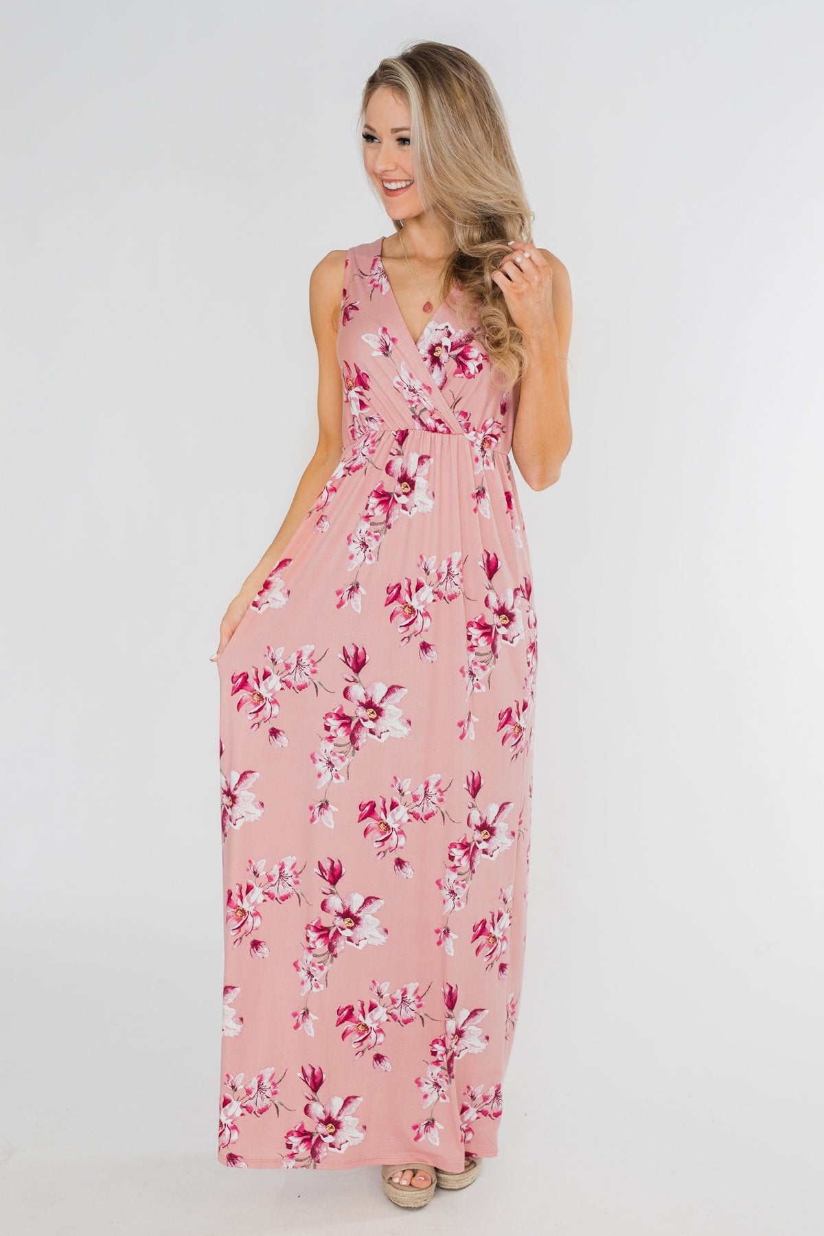 Super soft, v-neck soft pink maxi dress with the cutest floral pattern!