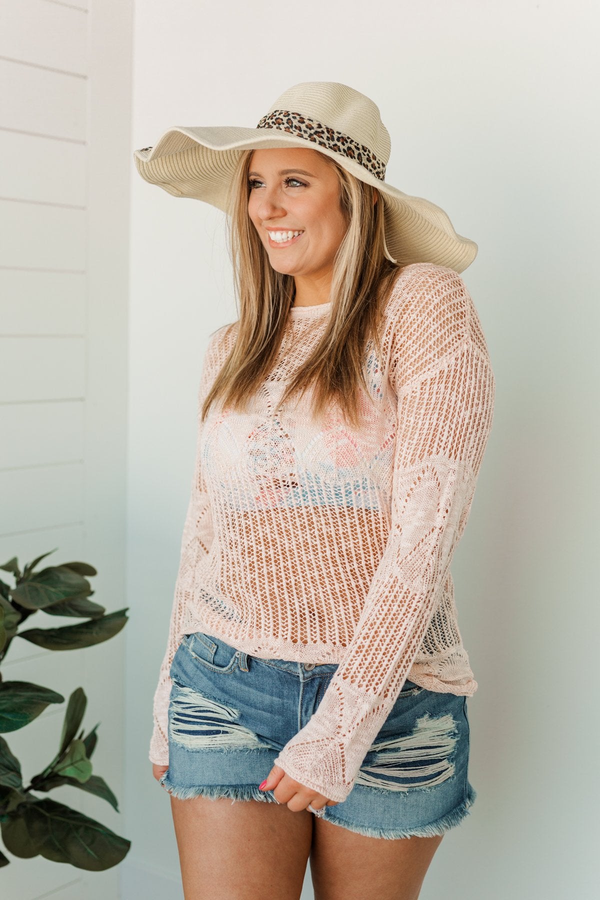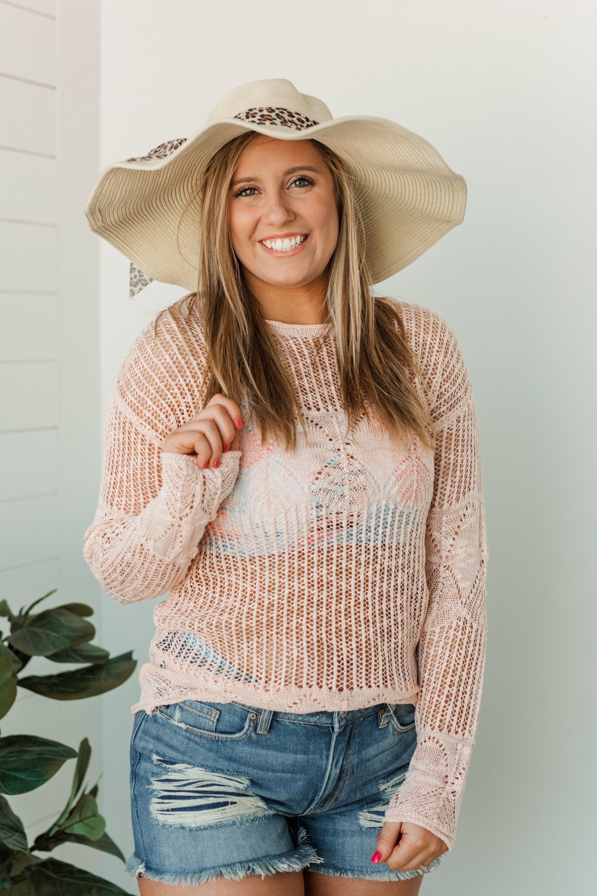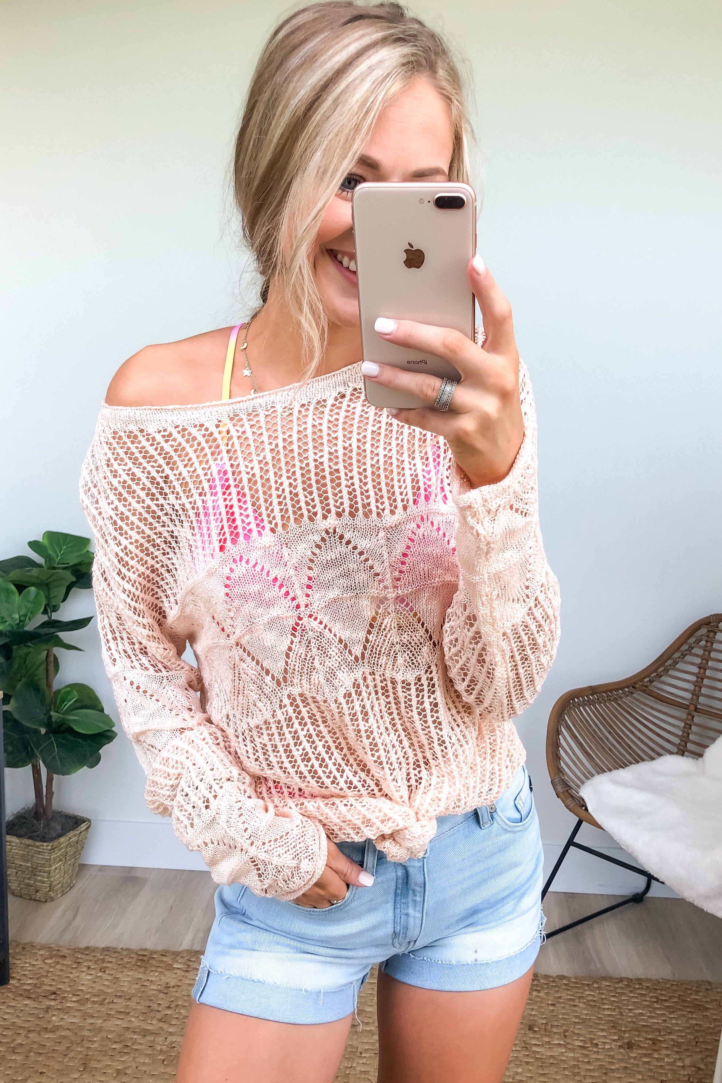 Lightweight open knit sweater that you can wear on or off the shoulder! This sweater is the perfect transition piece from Spring to Summer! It even looks fantastic over all of our swimwear!