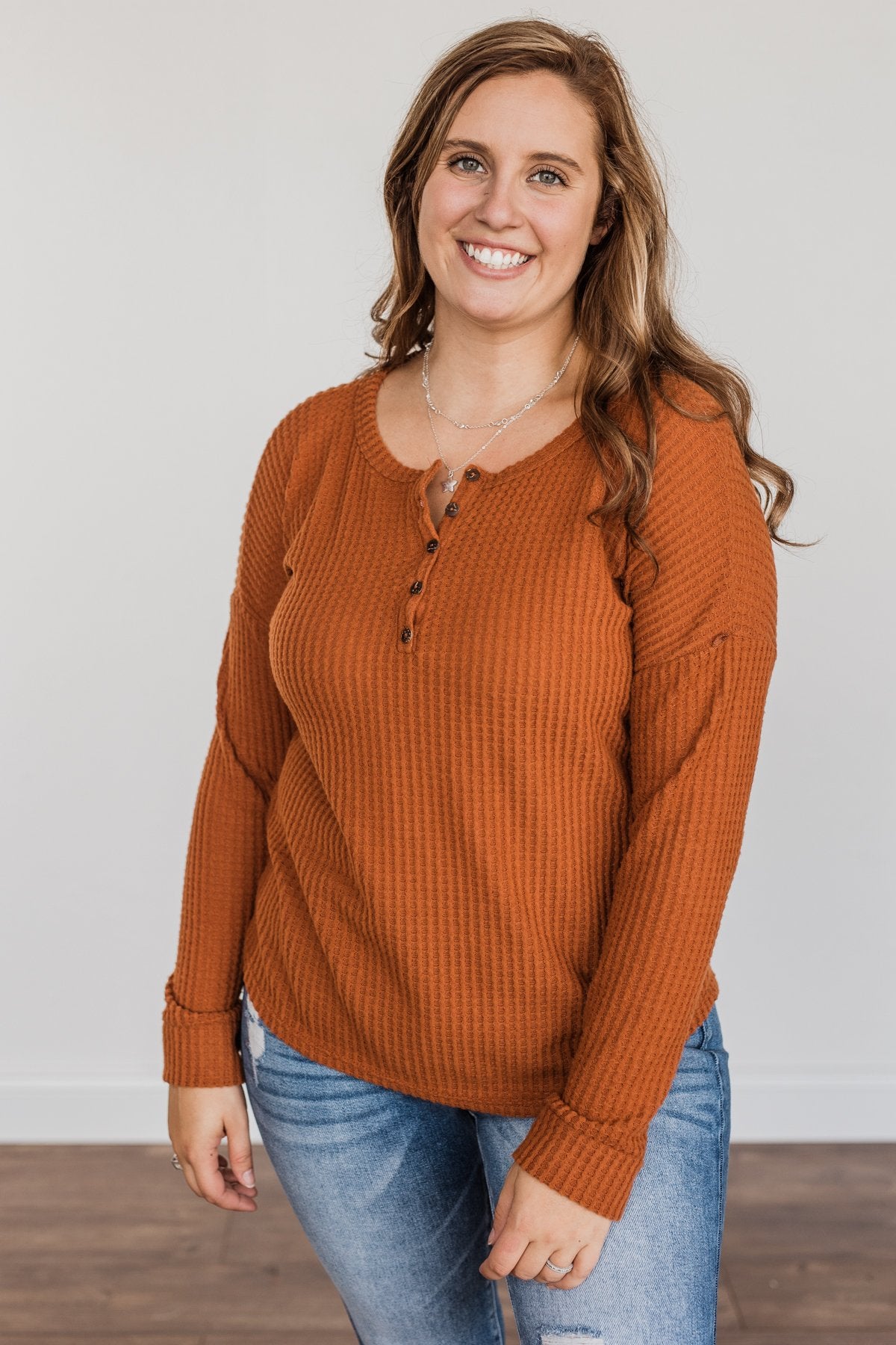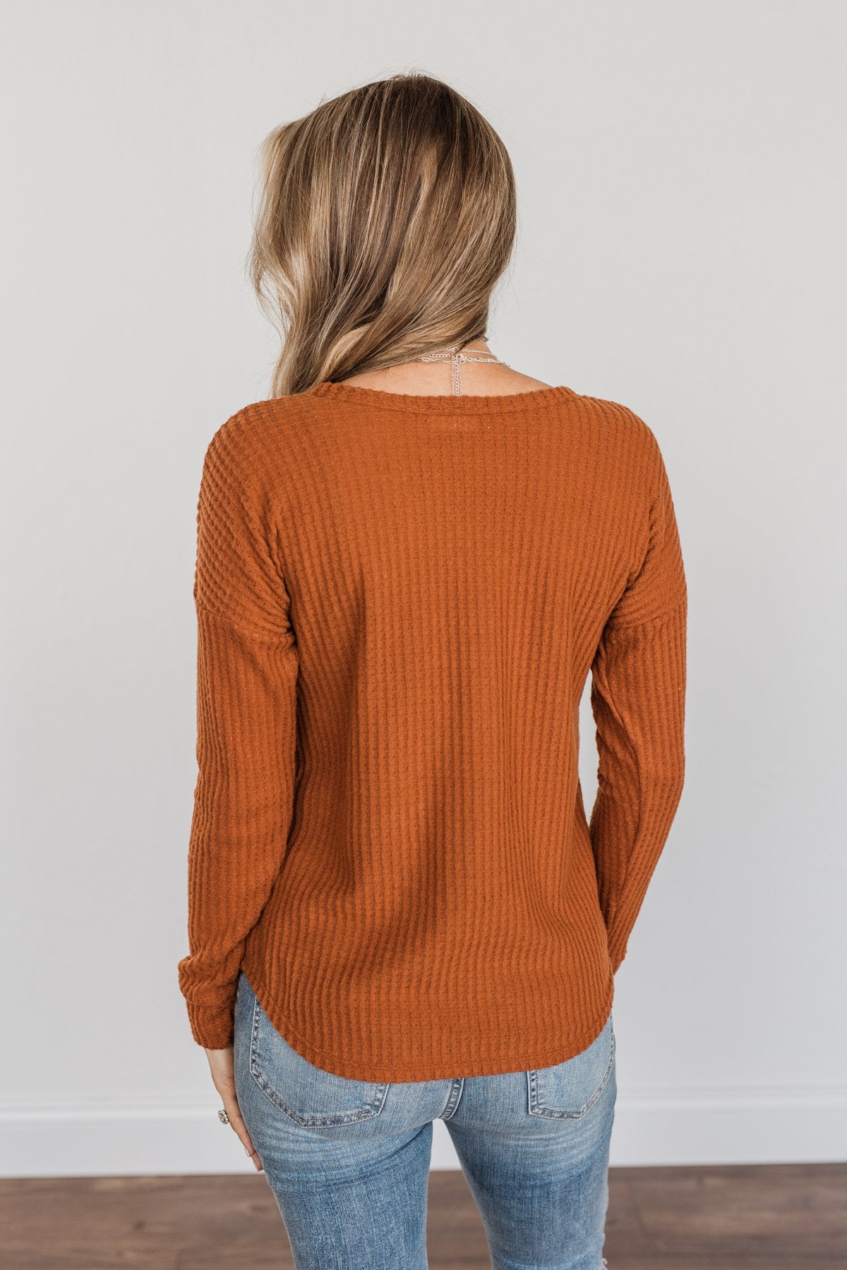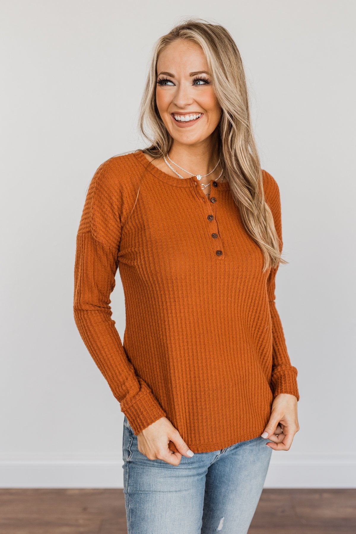 Happy Harvest Waffle Knit Button Top- Copper Orange