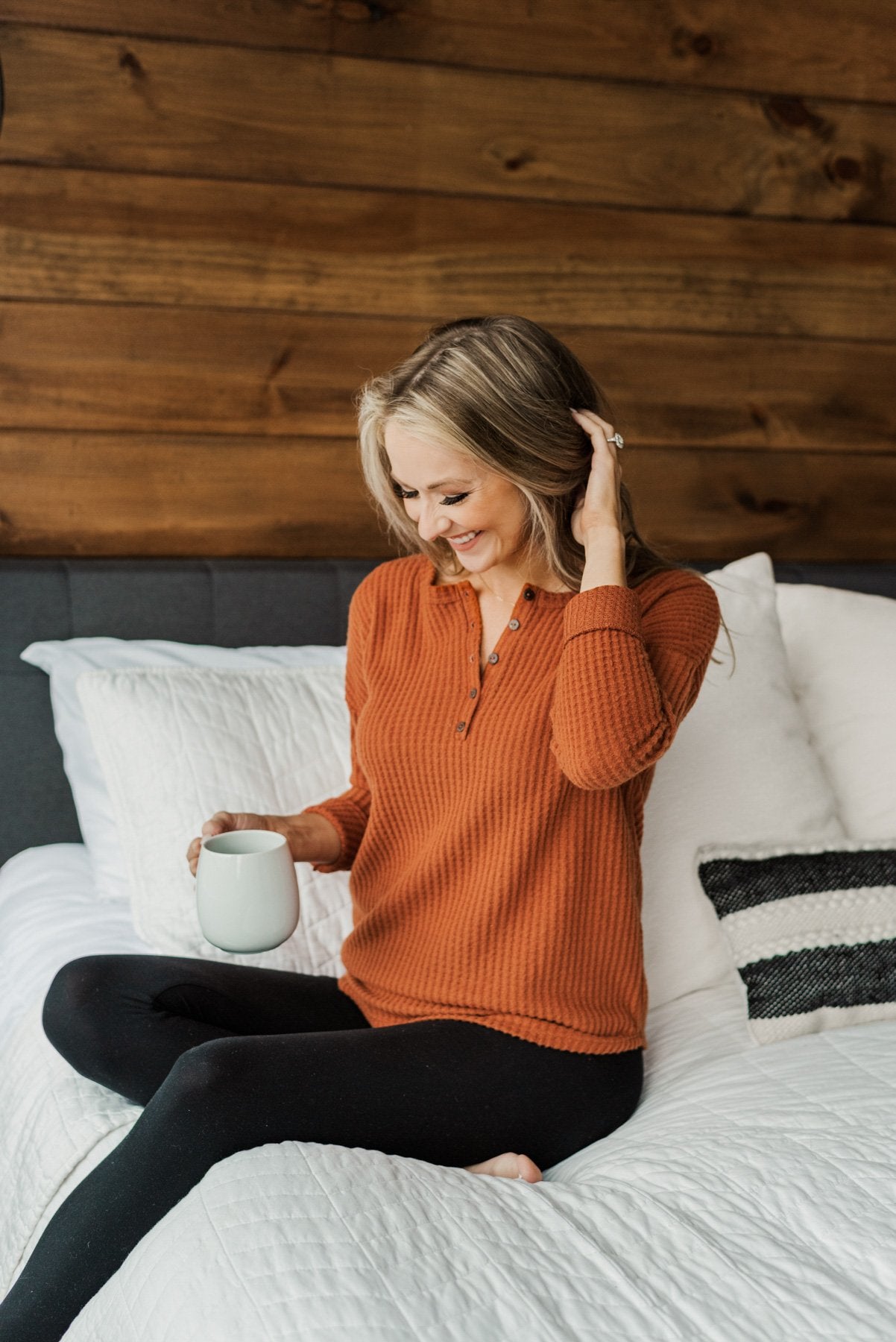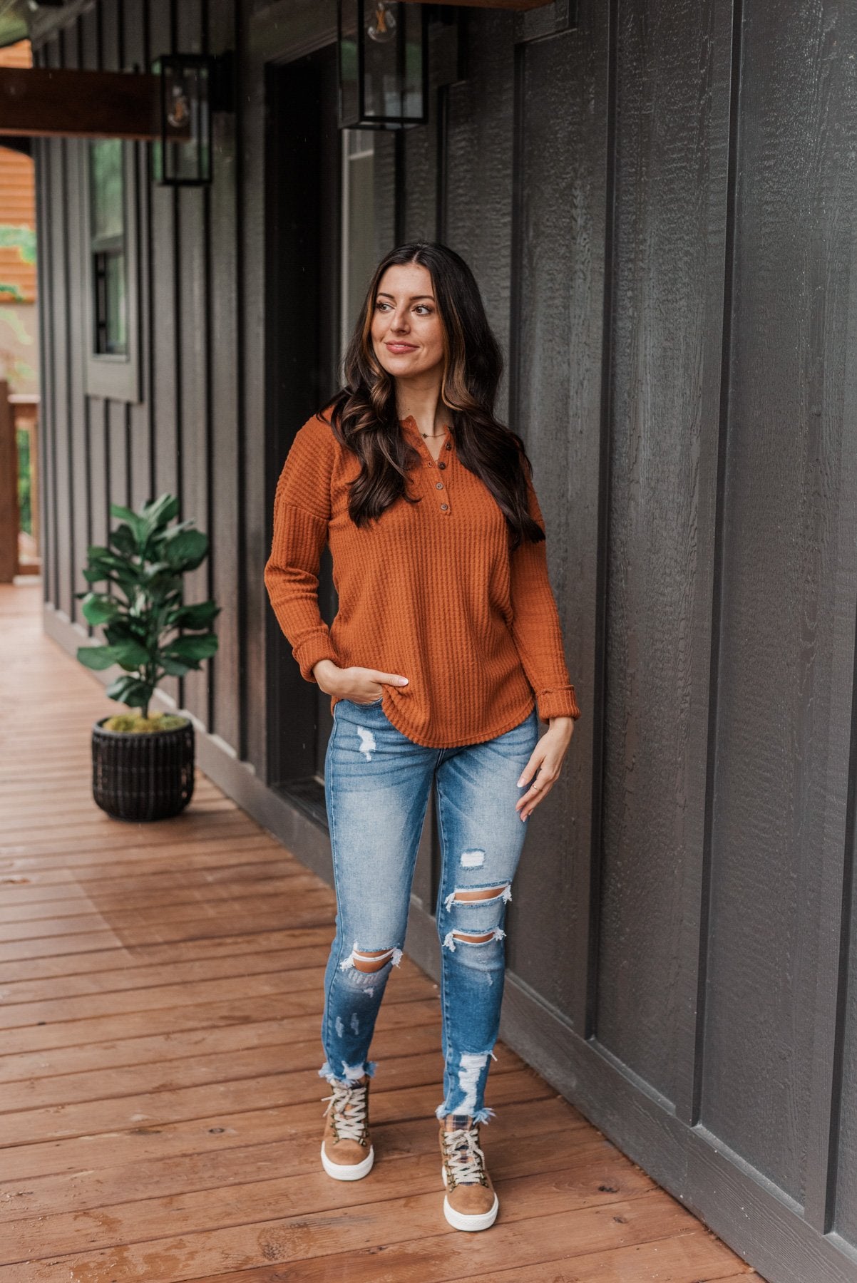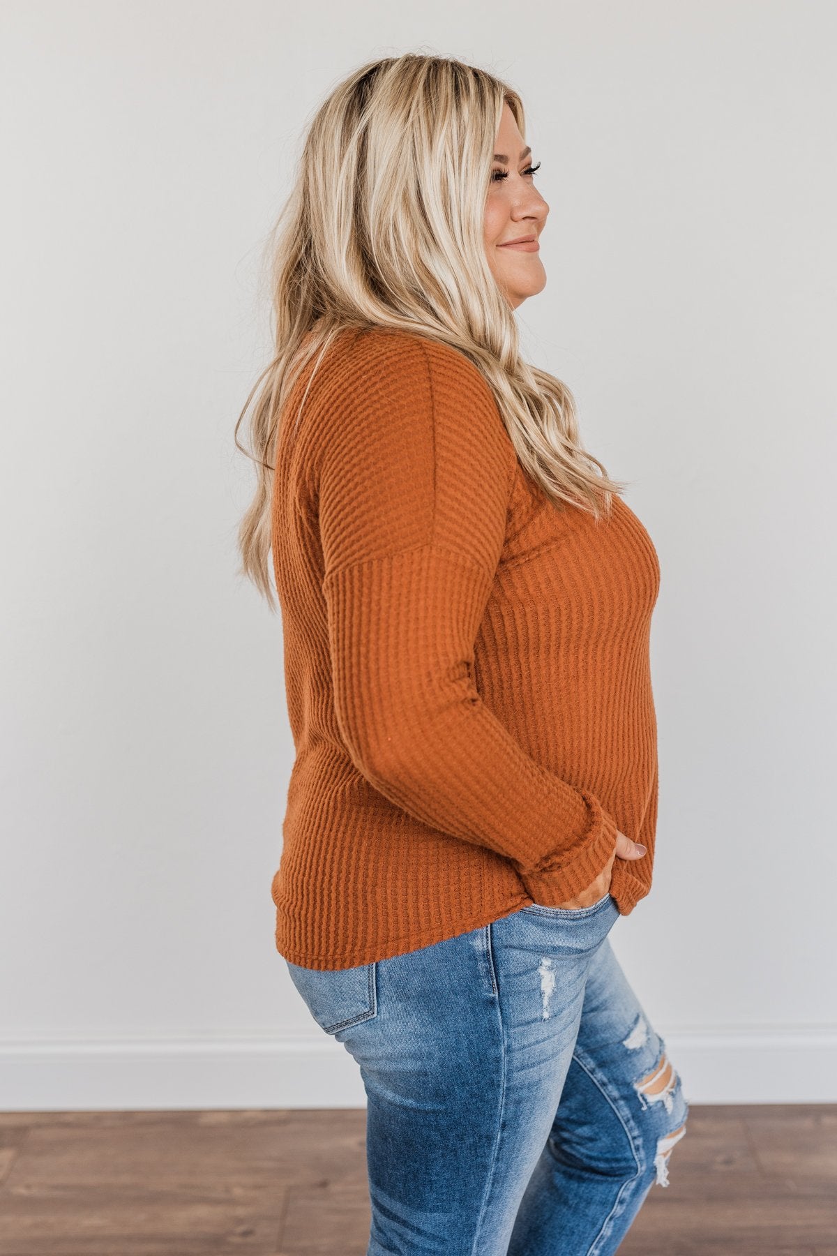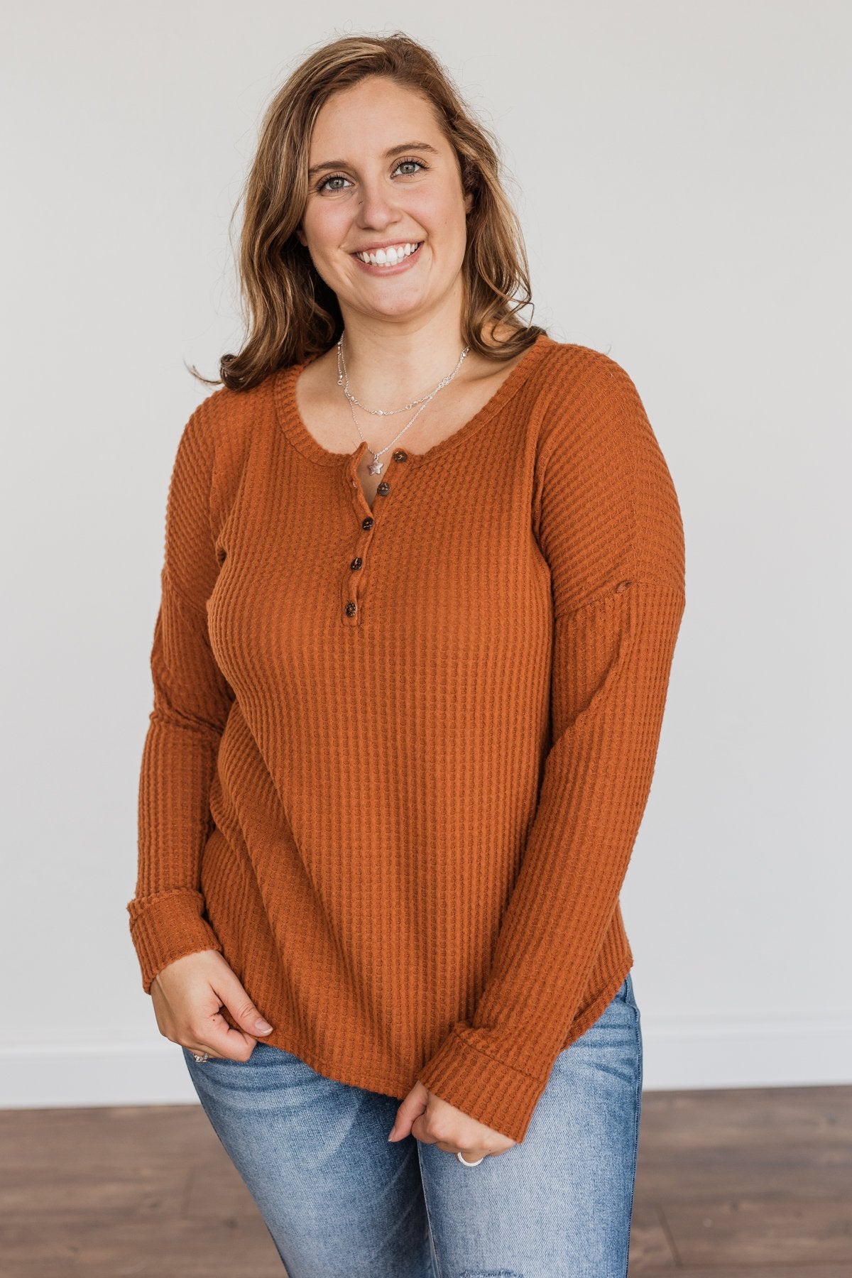 Happy Harvest Waffle Knit Button Top- Copper Orange