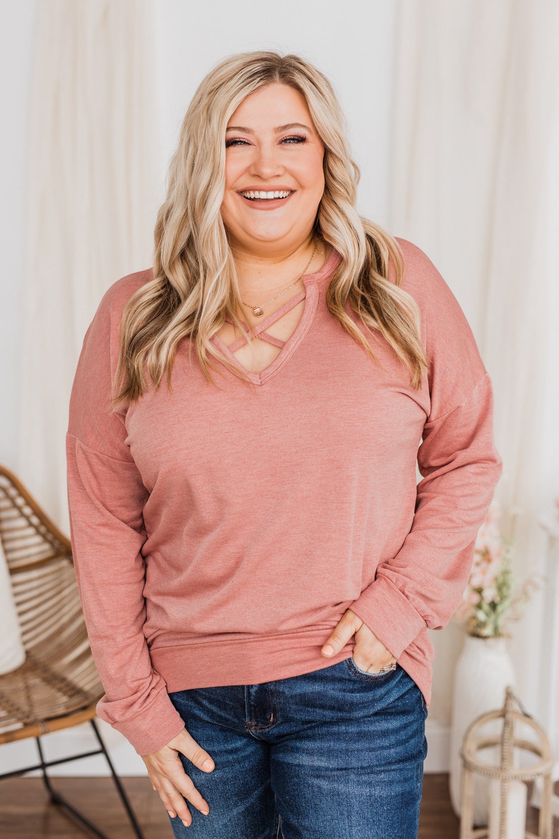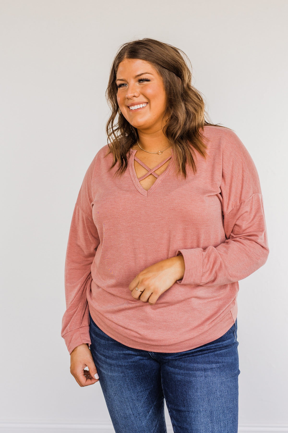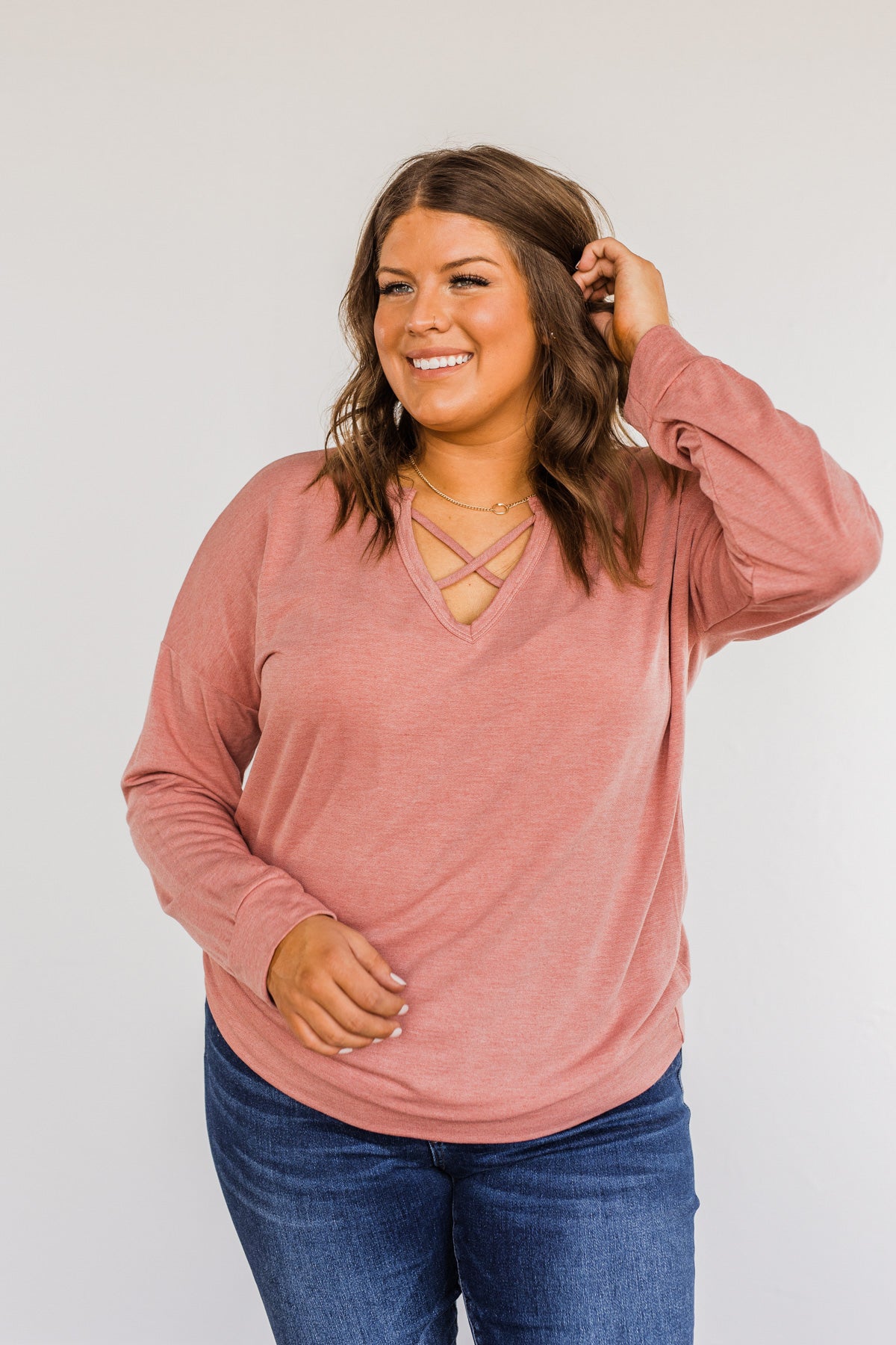 Just For Fun Criss Cross Long Sleeve Top- Mauve