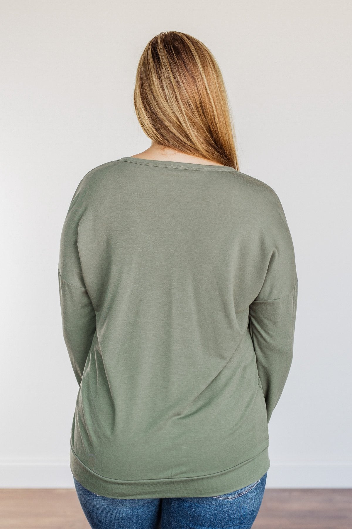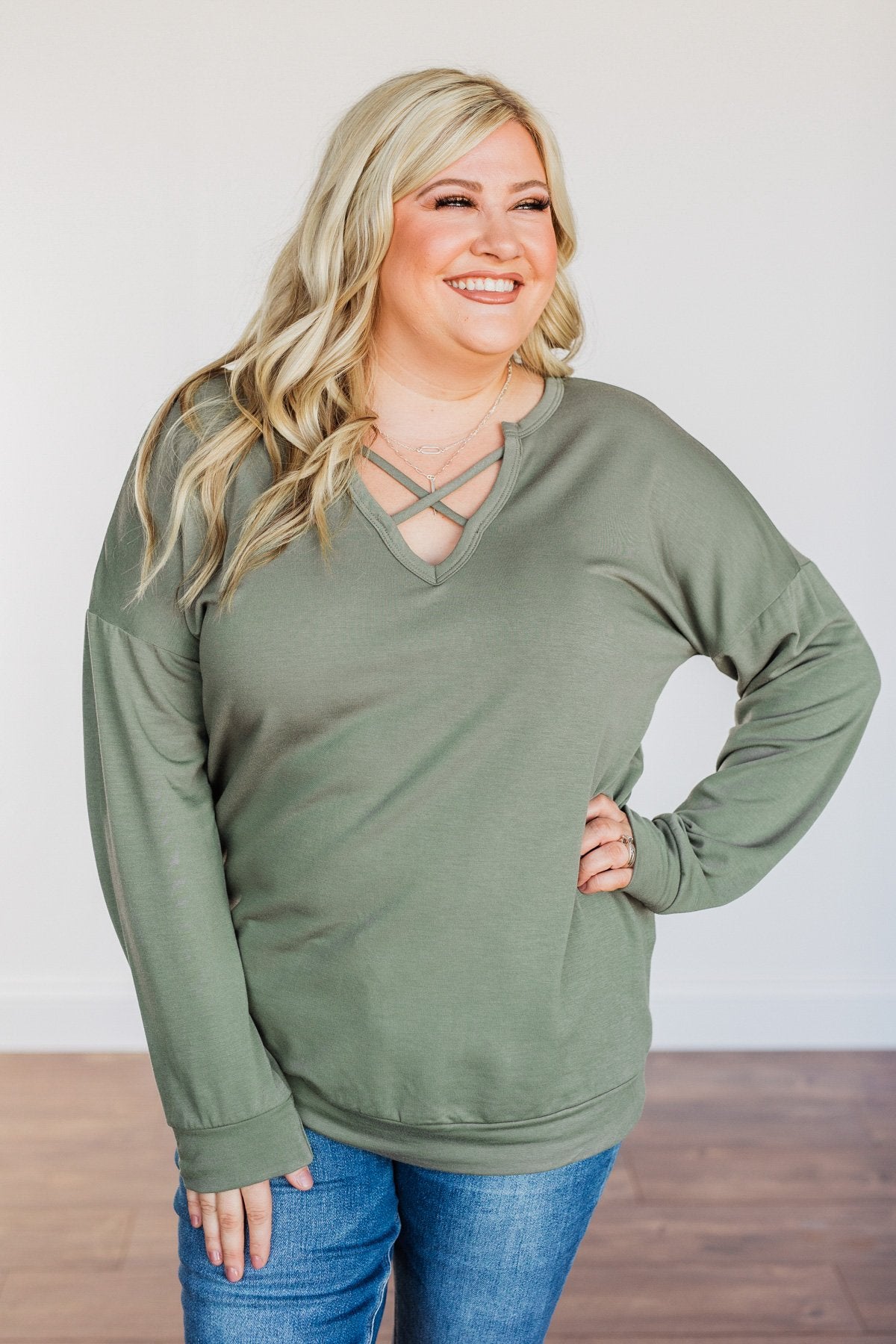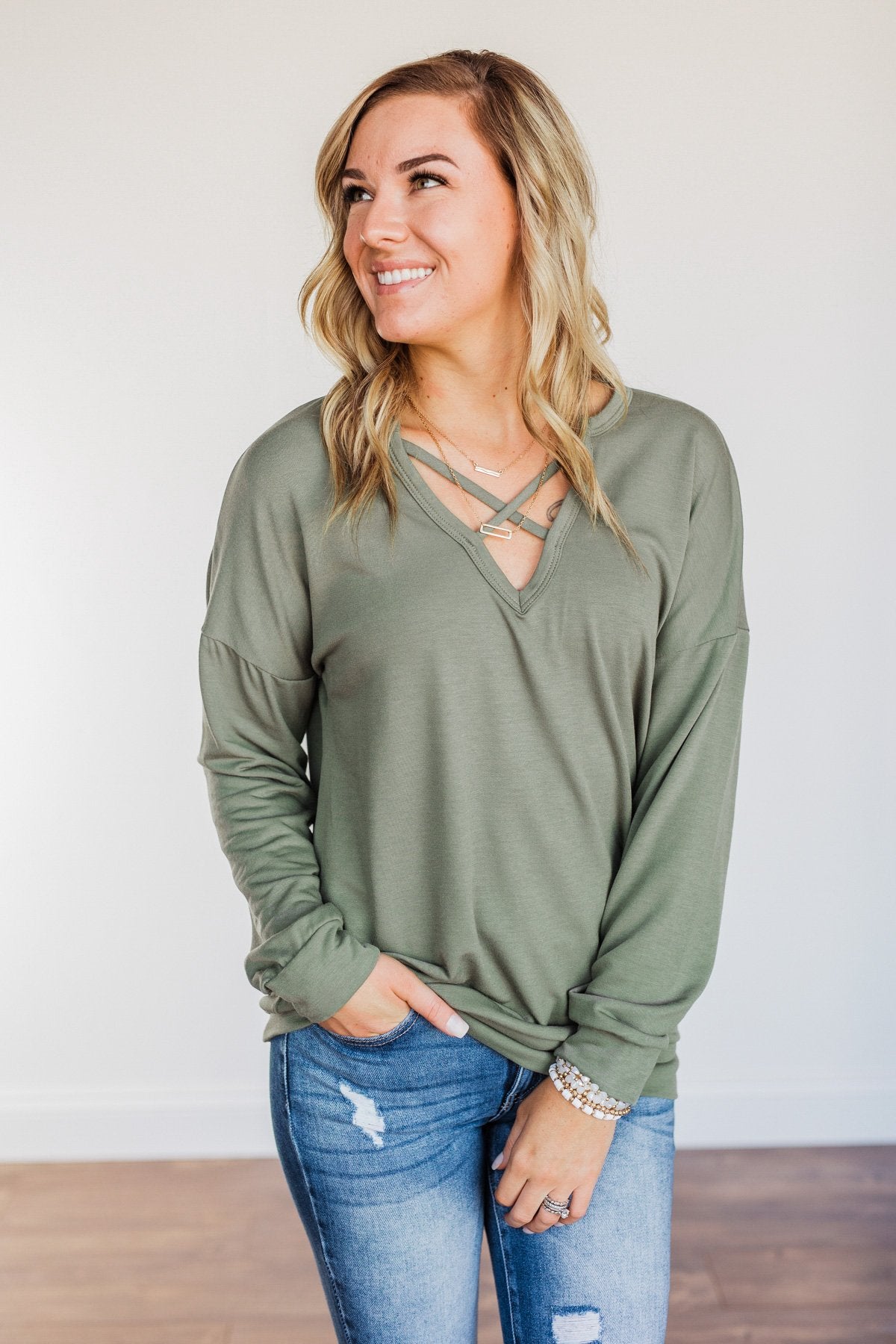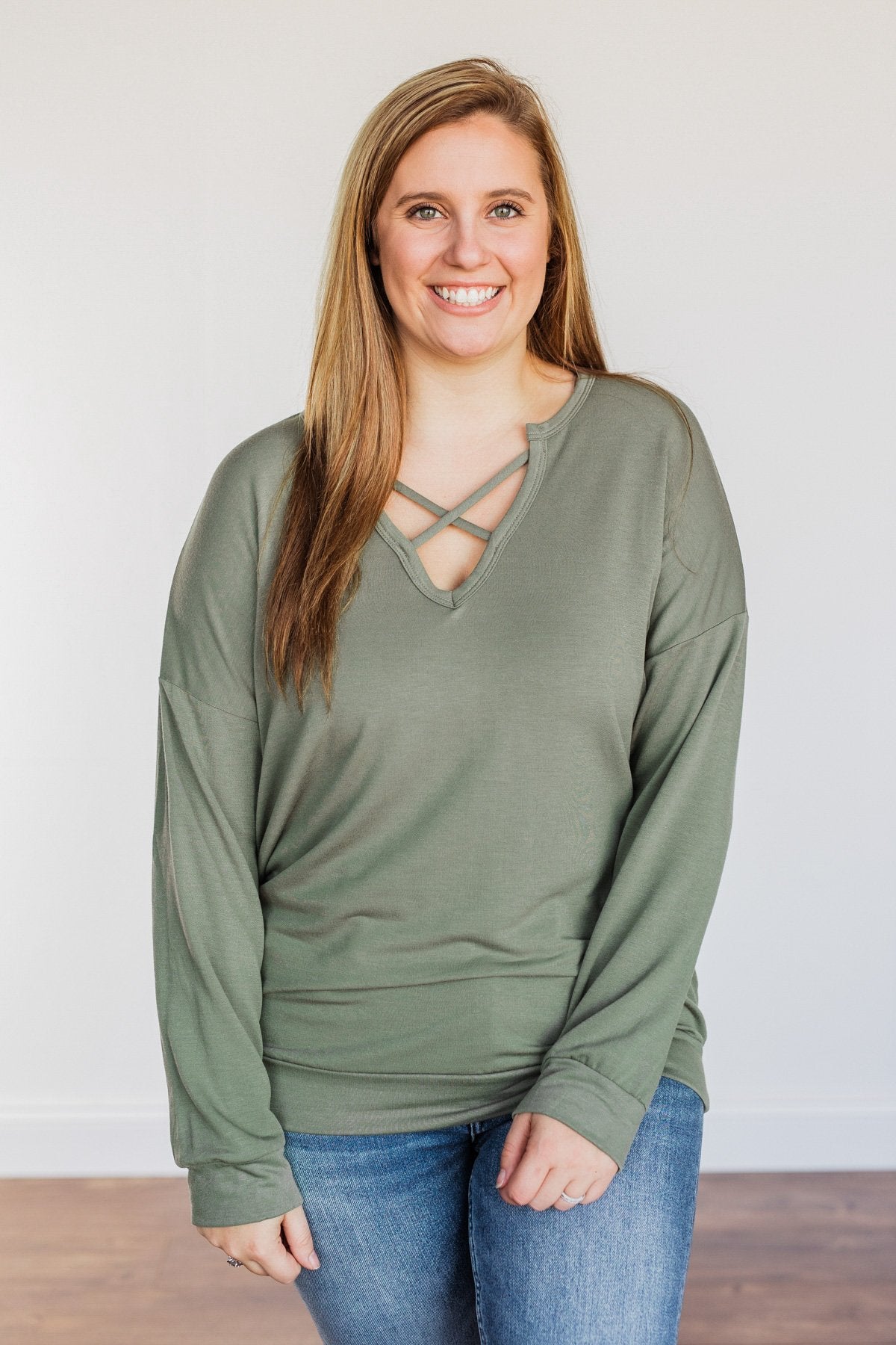 Just For Fun Criss Cross Long Sleeve Top- Olive