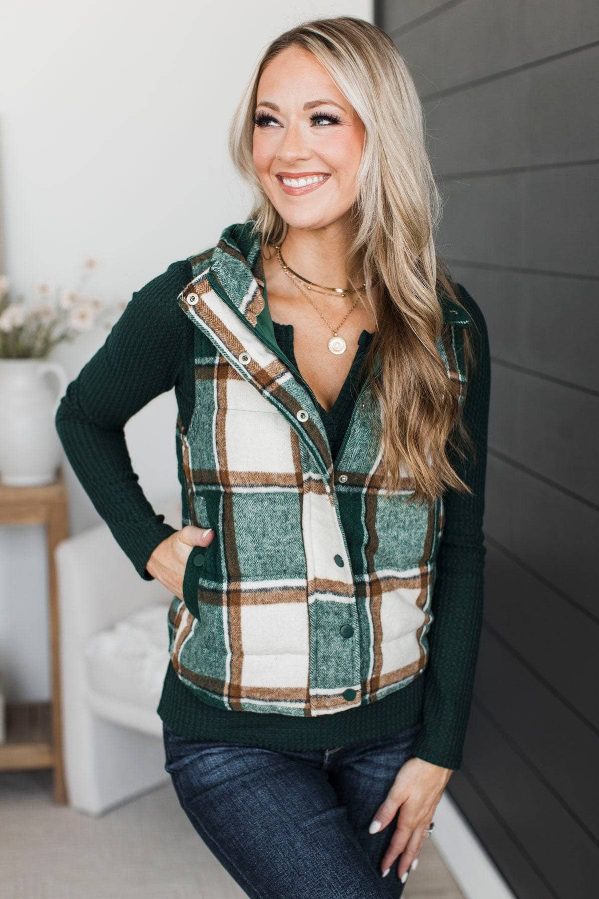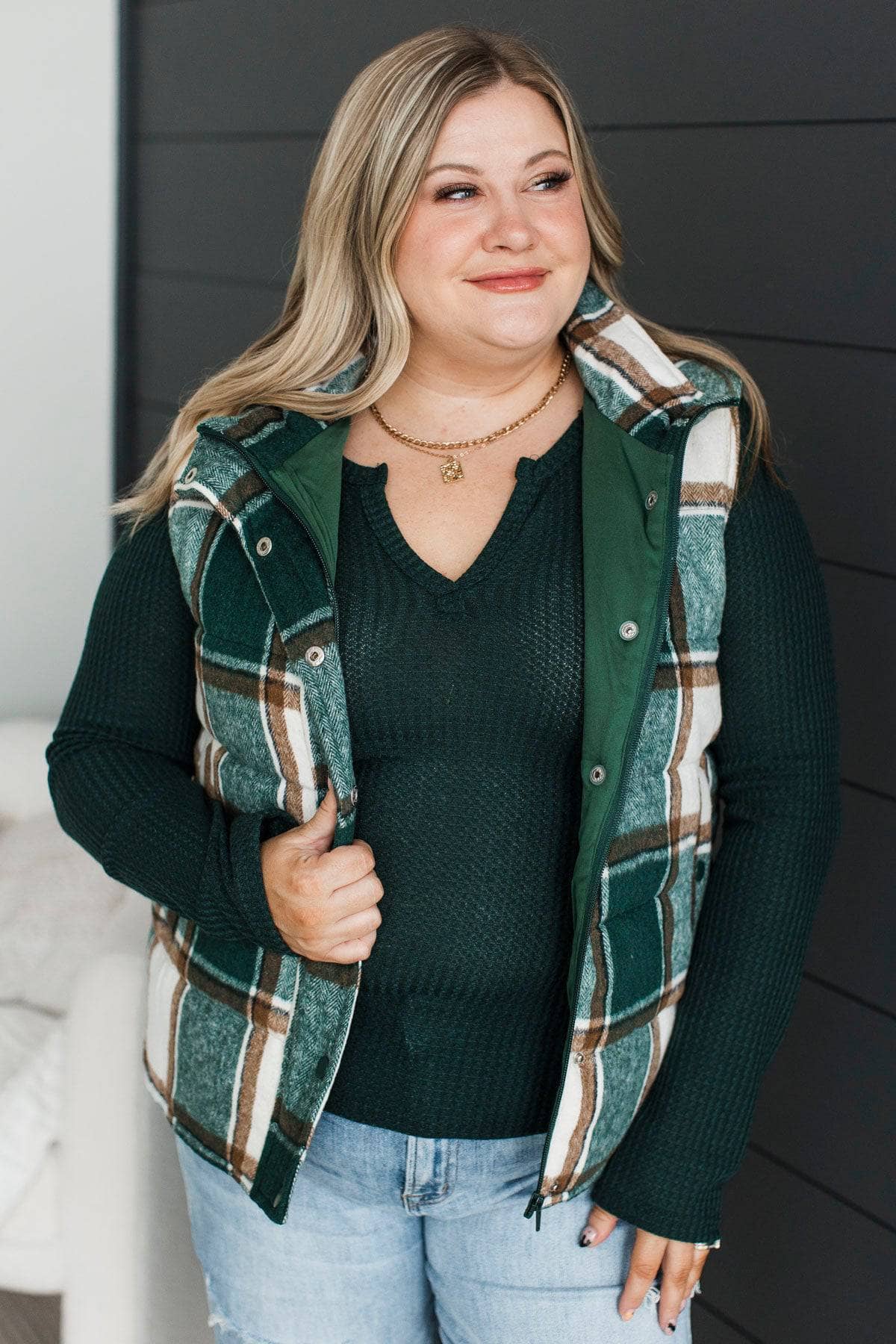 For You Always Plaid Puffer Vest- Wintergreen